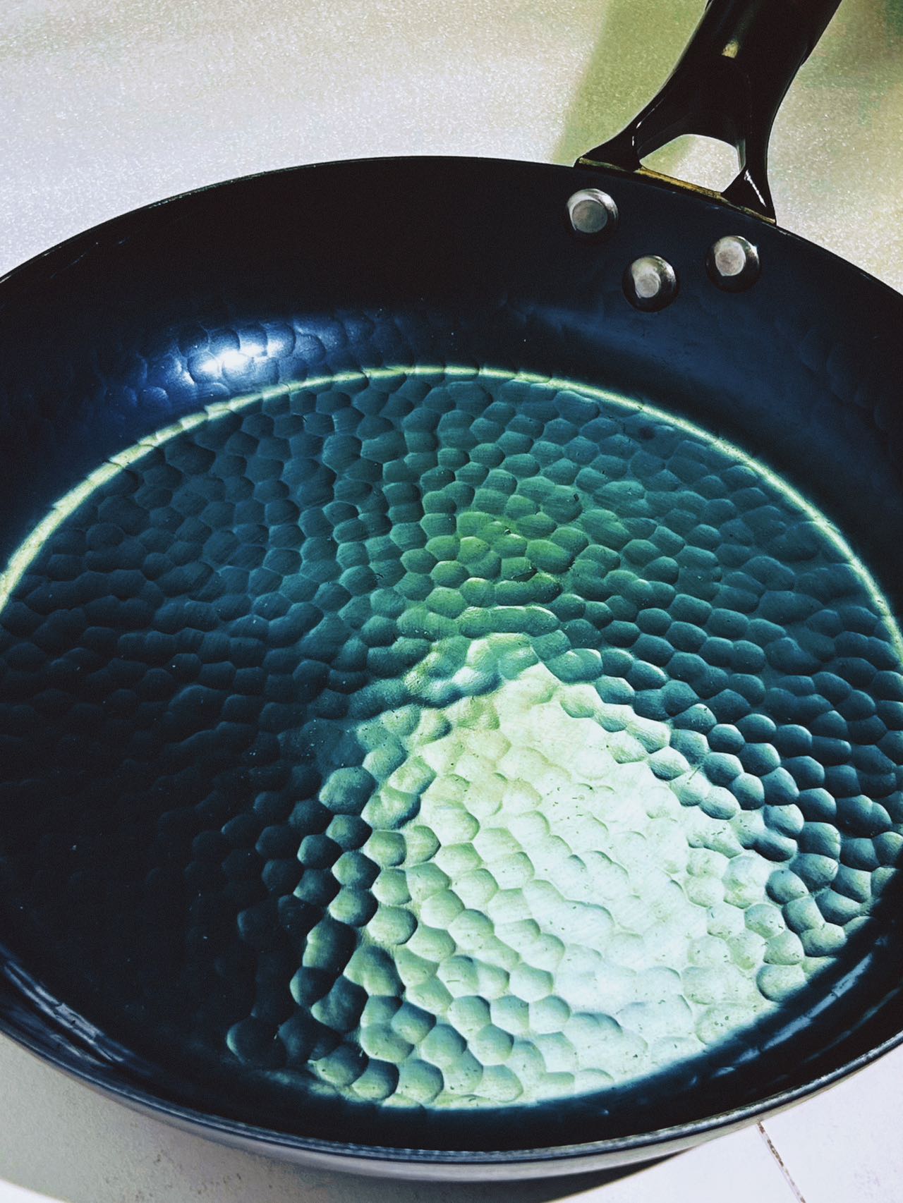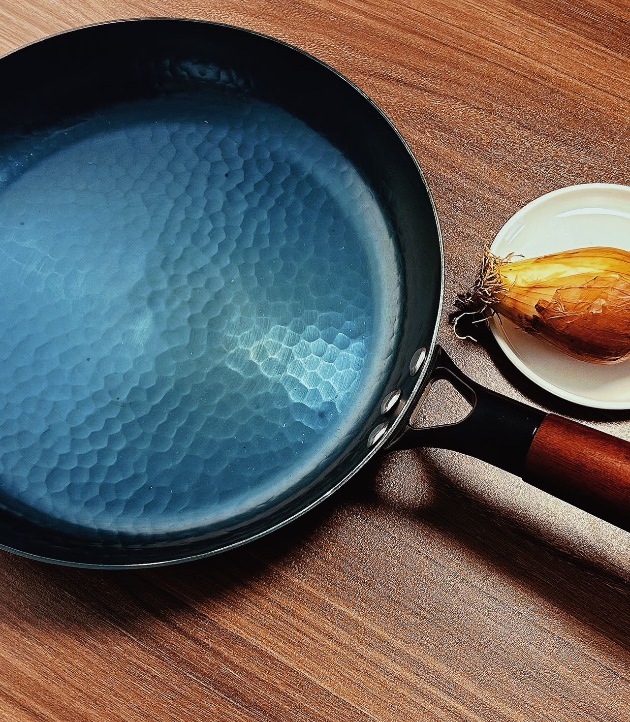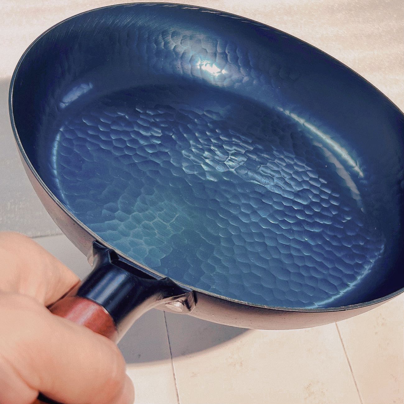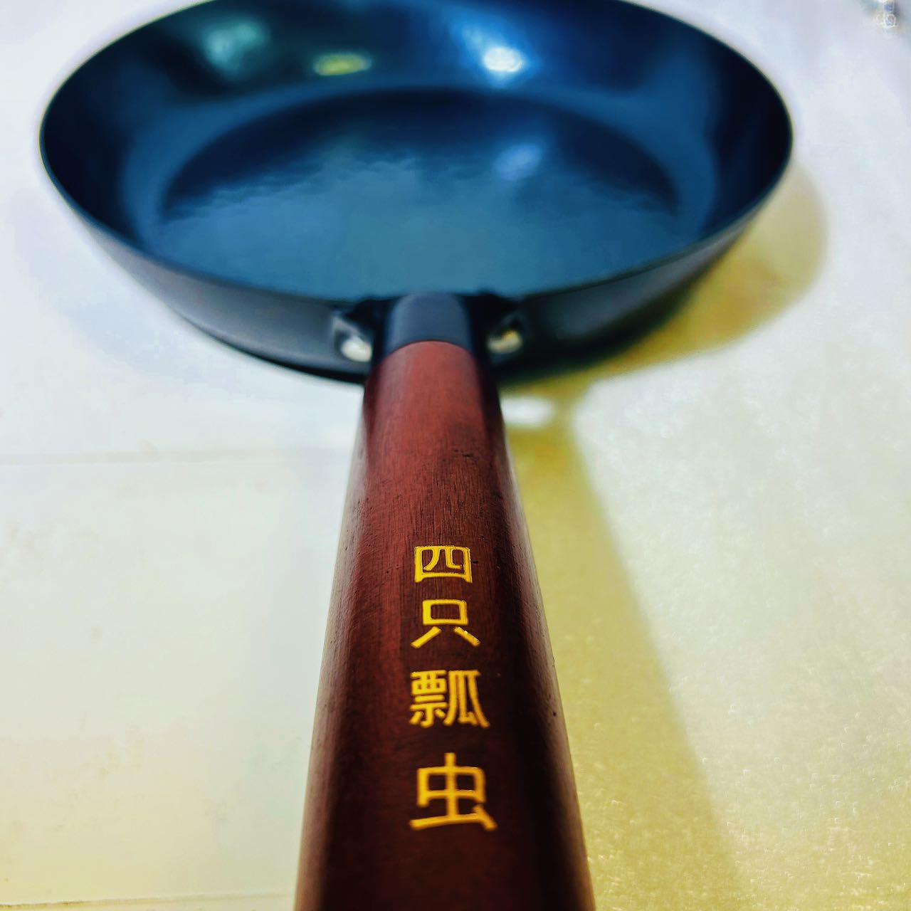 蓝镜面平底煎锅:热轧Q235铁板,热锻打1遍,砂纸打磨3遍,大圆锤反复锻打3遍,手工烤蓝,铆钉镶红木把,直径26cm,重量1.27kg。