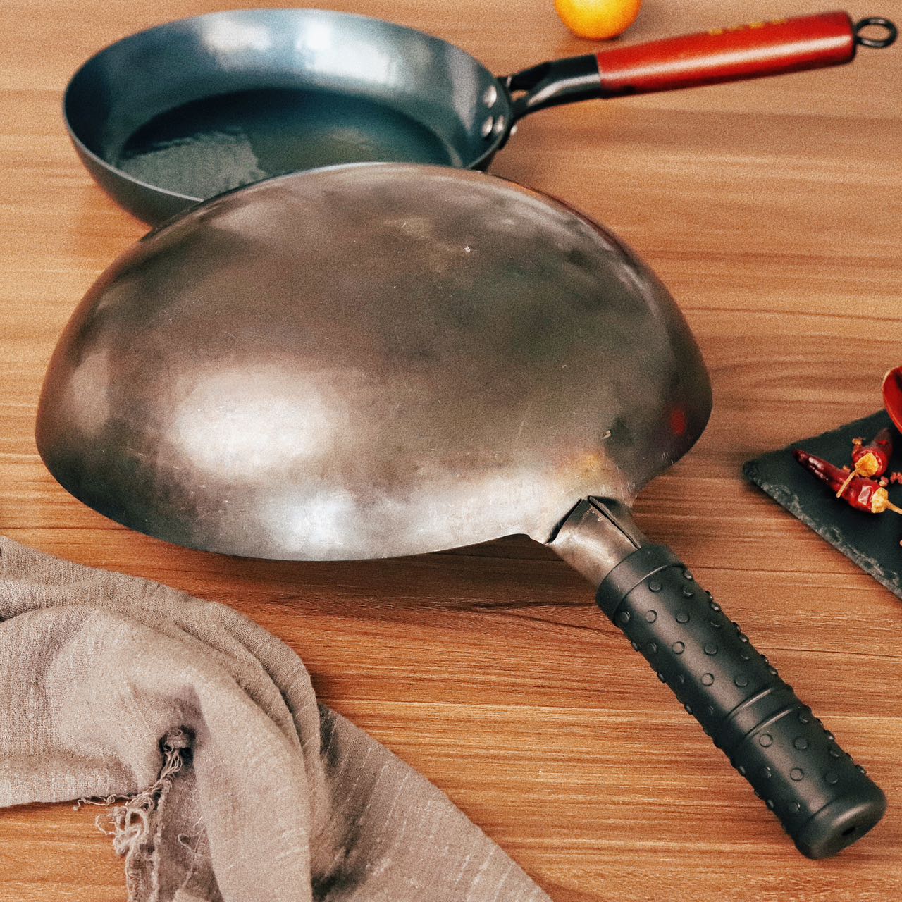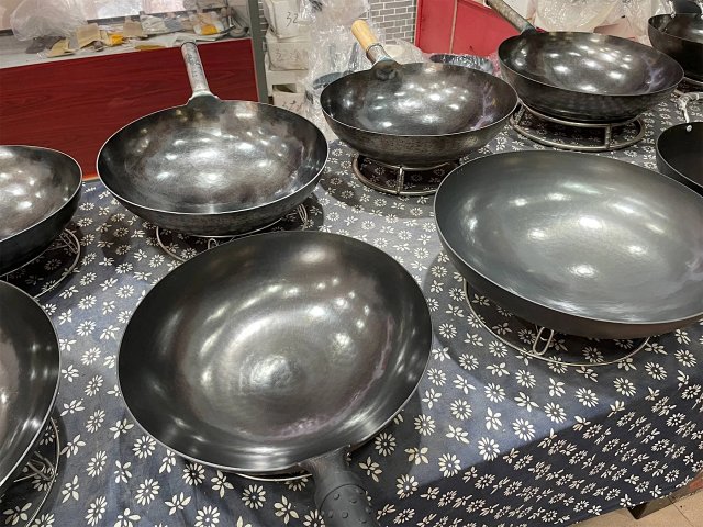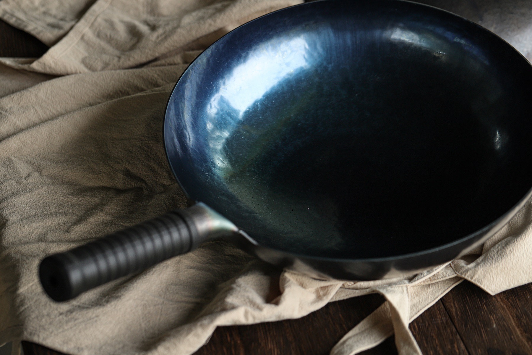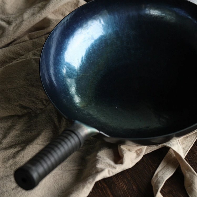 古法原色黑炒锅:热轧Q235铁手工热锻打工艺,火烧6遍,每烧完一遍铁里杂质越少,导热更均匀,释放铁离子越多,人工锻打整型,砂纸打磨的6遍到7遍,以确保光泽度,椭圆锤印人工锻打6遍人工铨把出成品,32寸,重量1.86kg。
