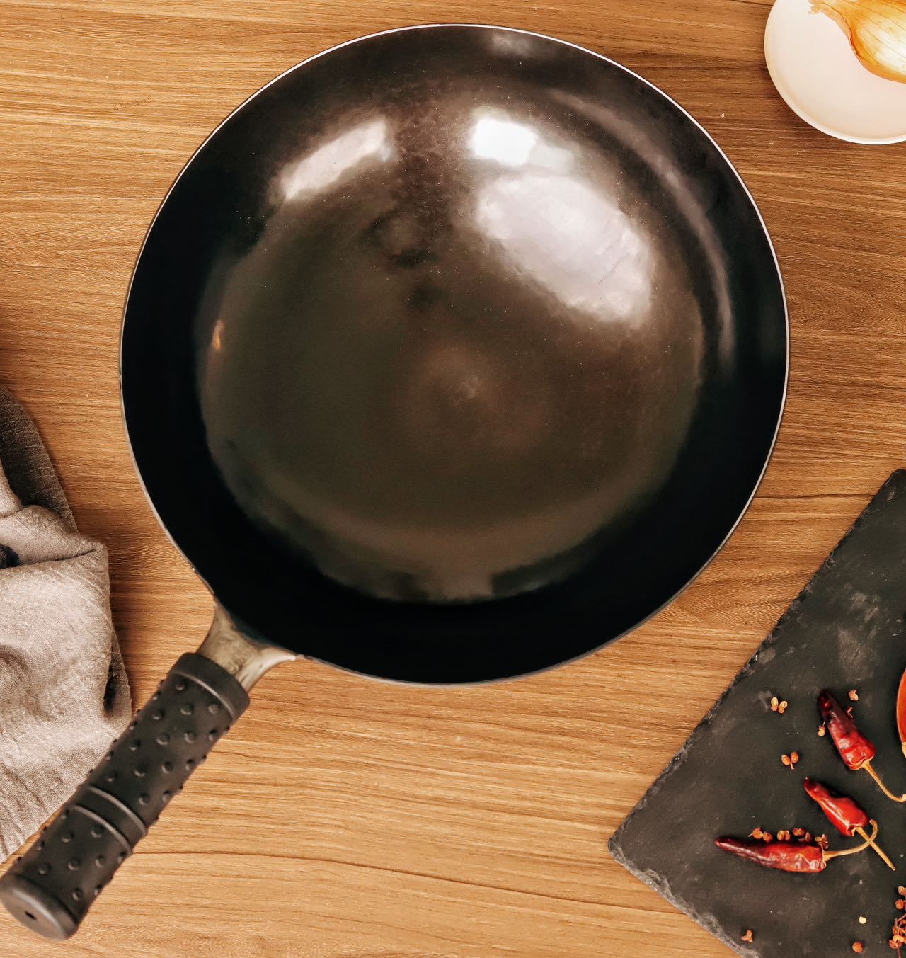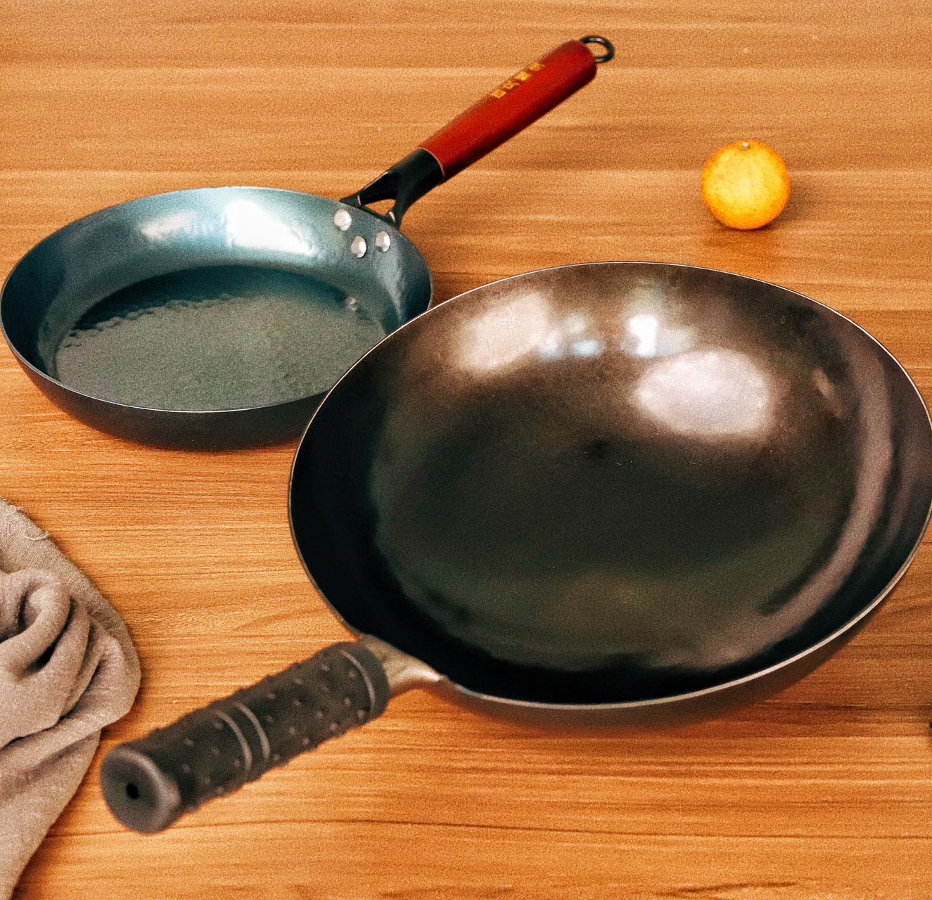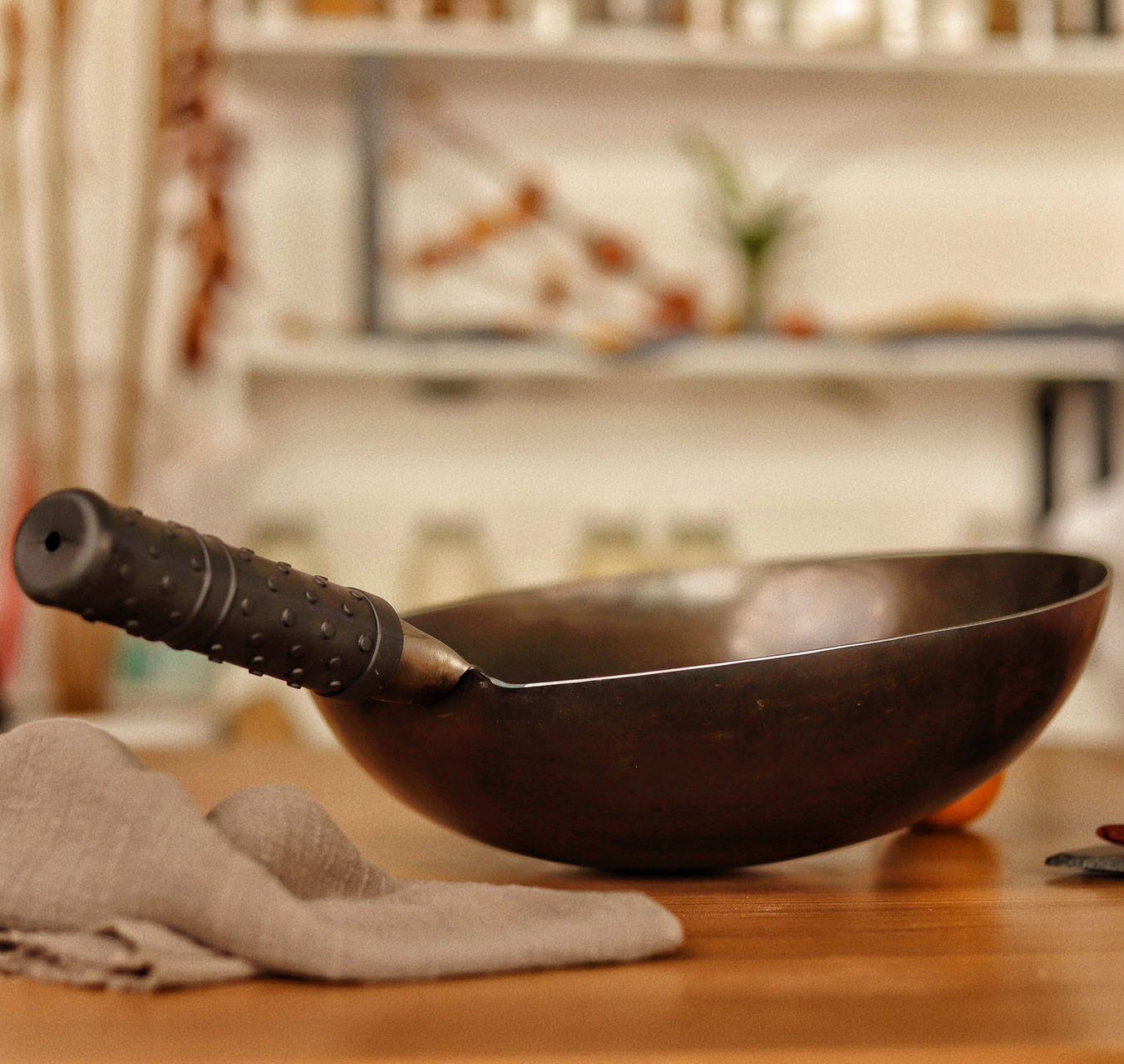 古法原色黑炒锅:热轧Q235铁手工热锻打工艺,火烧6遍,每烧完一遍铁里杂质越少,导热更均匀,释放铁离子越多,人工锻打整型,砂纸打磨的6遍到7遍,以确保光泽度,椭圆锤印人工锻打6遍人工铨把出成品,32寸,重量1.86kg。