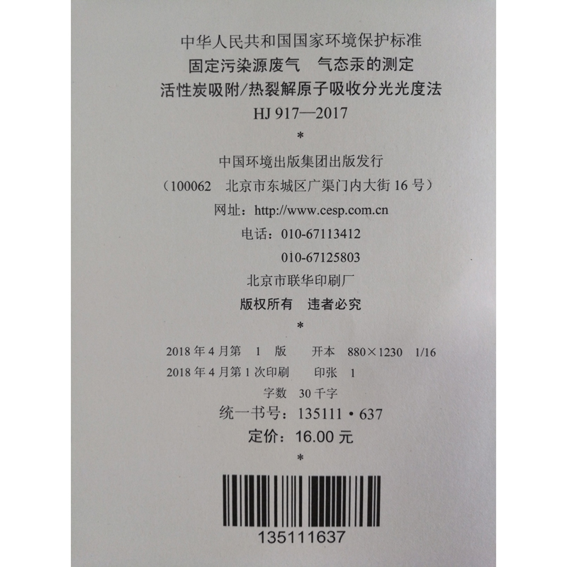 HJ 917—2017固定污染源废气 气态汞的测定 活性炭吸附/热裂解原子吸收分光光度法 国家标准GB 环境保护 135111637