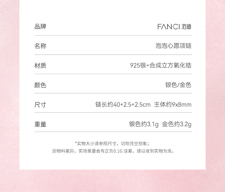 FANCI范琦始于2012年,以珠宝表达内心为初衷,聚焦不同亲密关系情感表达,联结无形情感,以情感符号「I FANCI U」传情达意,诠释“恋爱戴范琦,起点是你,终点亦是你”始终如一的恋爱价值观。