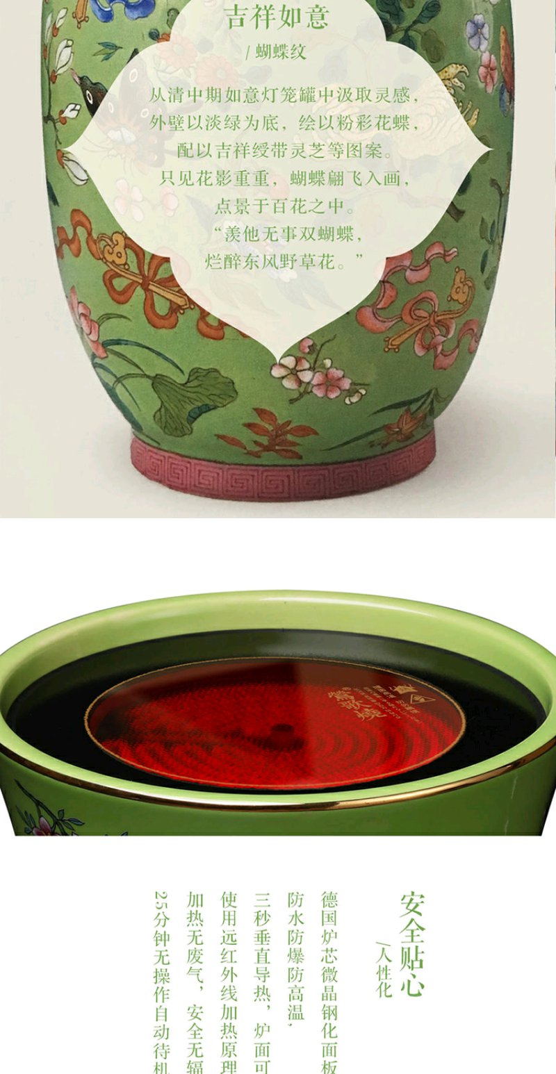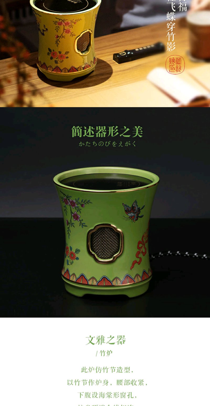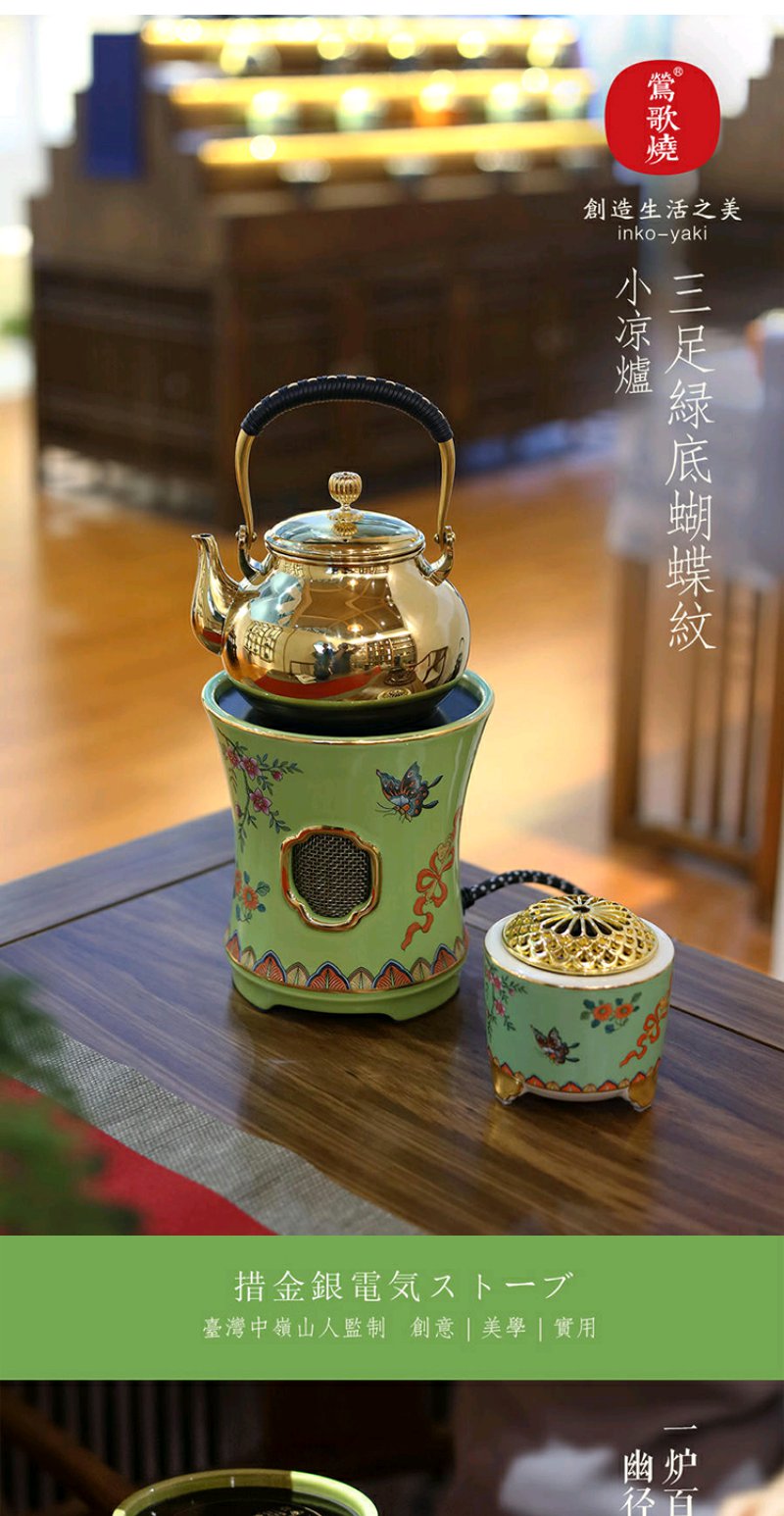 莺歌烧 绿底蝴蝶珐琅电陶炉 电陶炉碳炉 家用静音烧水煮茶器三足绿底蝴蝶纹小凉炉