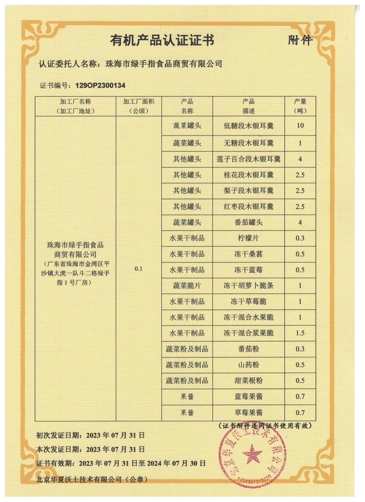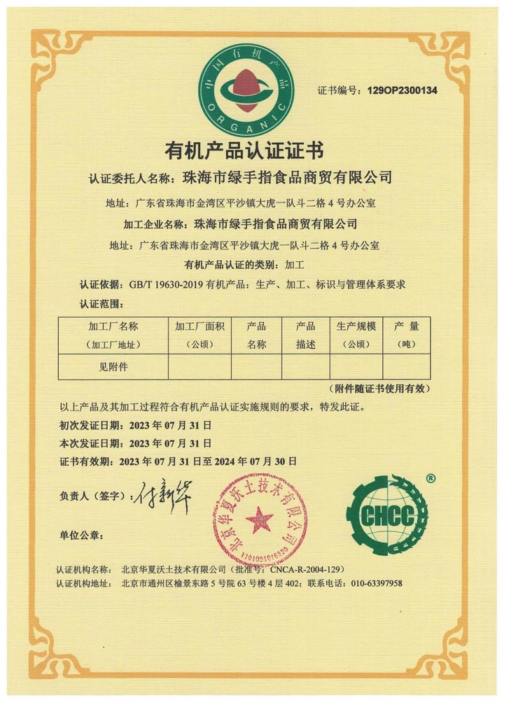 2022年,农场的加工厂落成,我们坚持原料生产全程无农药、无化肥、无除草剂、无添加剂,加工过程坚持有机标准,不使用防腐剂等添加剂。2023年,加工厂也申请并顺利拿到有机认证。