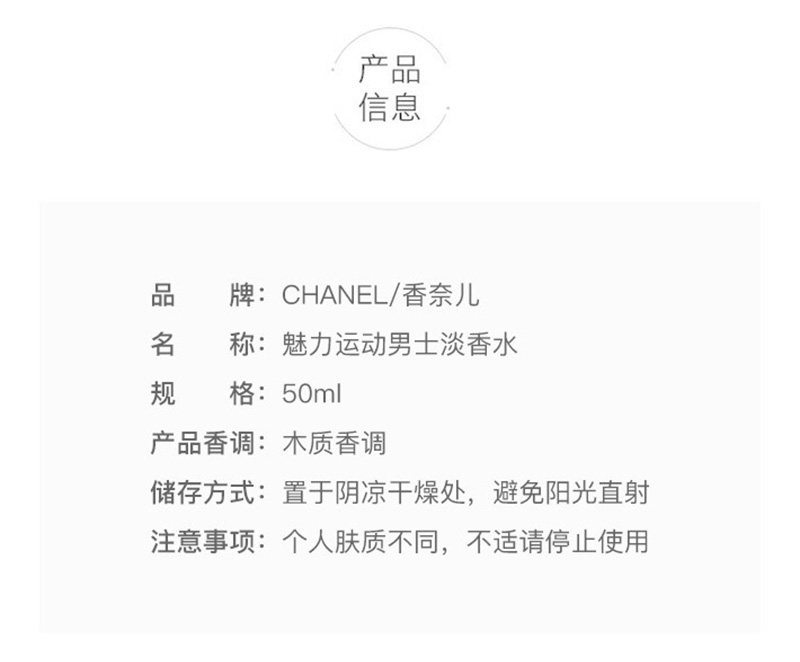 香奈儿 运动男士香水系列 清新木香调