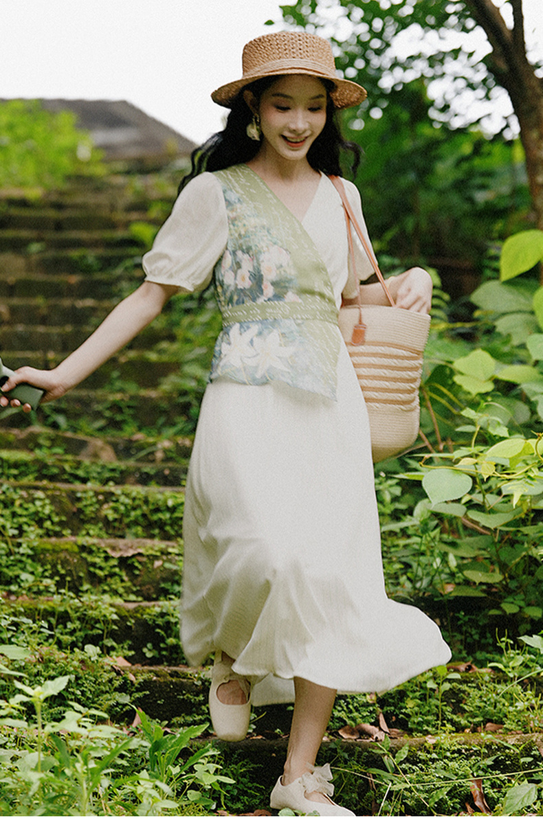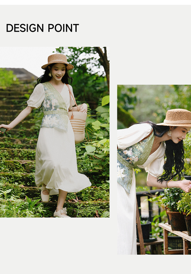 两三事 薄荷森林 2025夏季新款复古印花布拼接绑带v领连衣裙长裙
