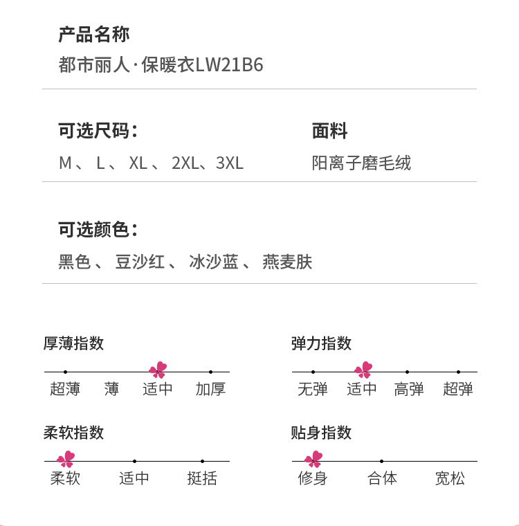 都市丽人舒暖负5度至5度女士特殊面料套装阳离子磨毛绒中套装保暖衣LW21B6