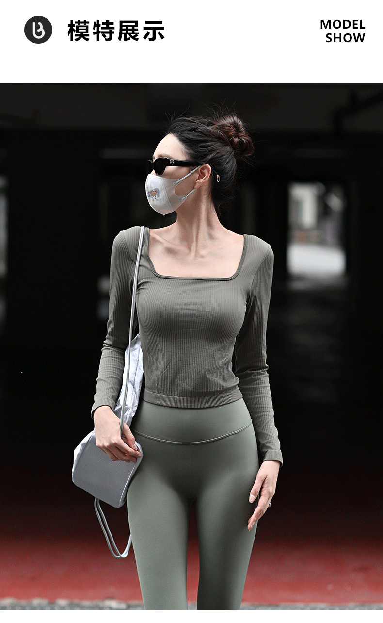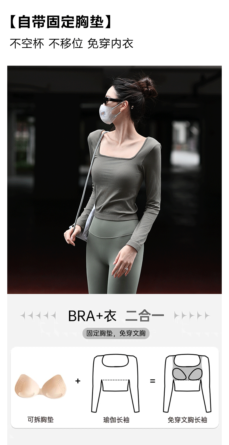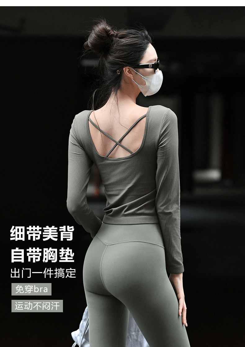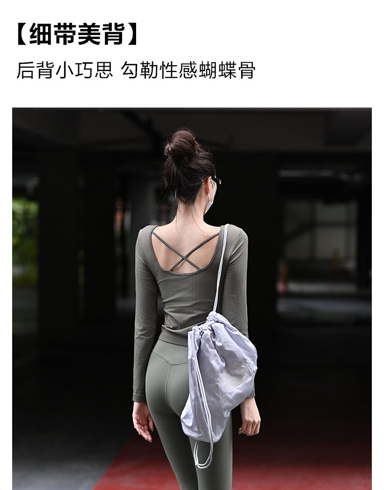 Beemen秋冬新款瑜伽服女长袖 固定一体杯胸垫 细带美背 高弹无缝健身上衣