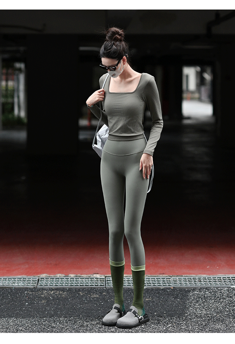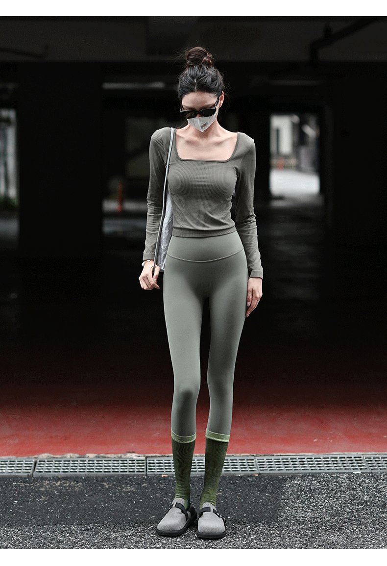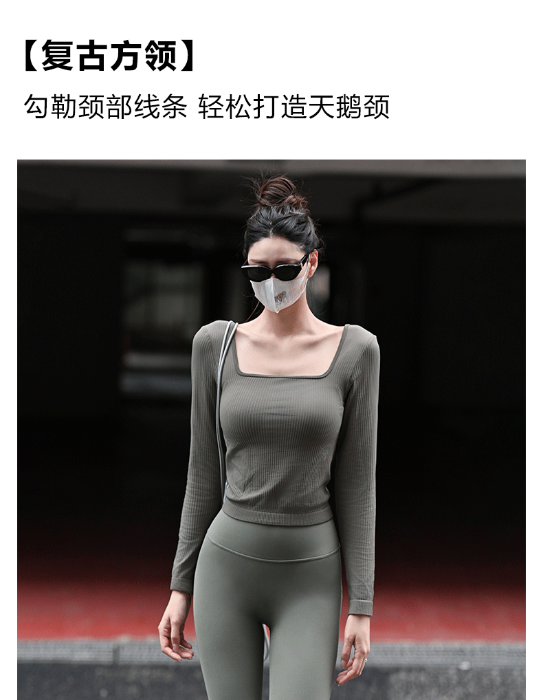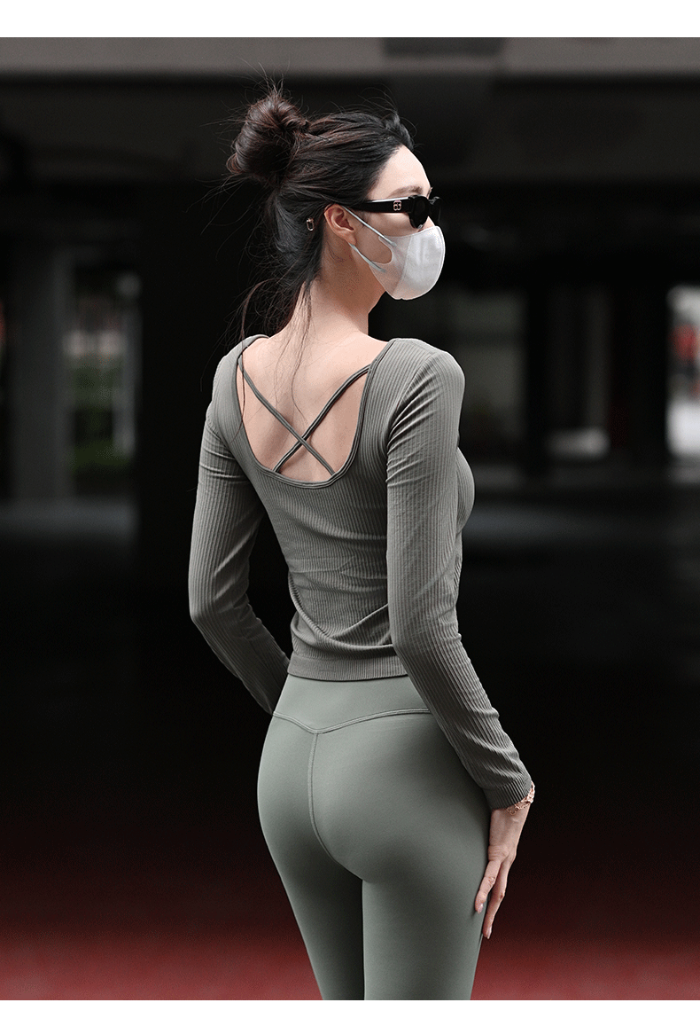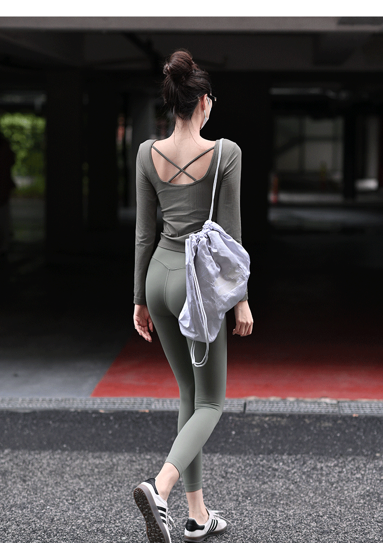 Beemen秋冬新款瑜伽服女长袖 固定一体杯胸垫 细带美背 高弹无缝健身上衣
