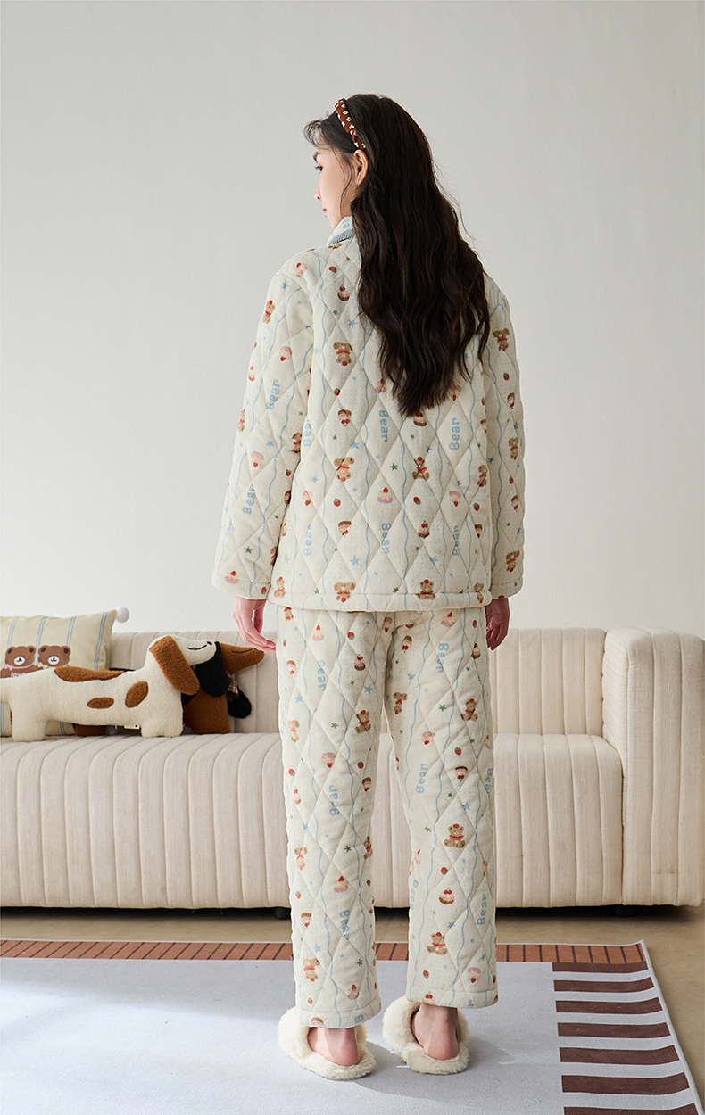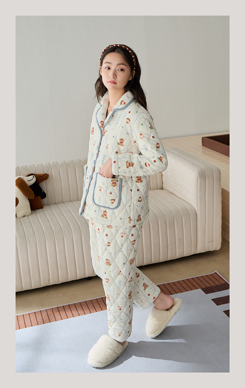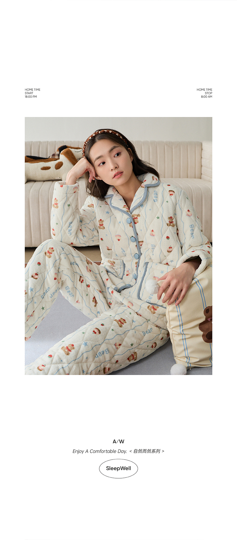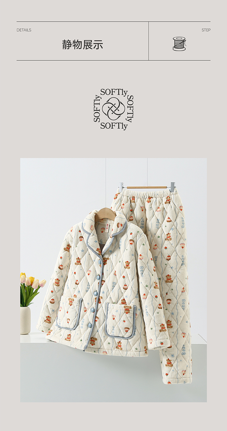 芬腾新款女士睡衣冬季长袖长裤三层夹棉珊瑚绒加厚保暖家居服套装