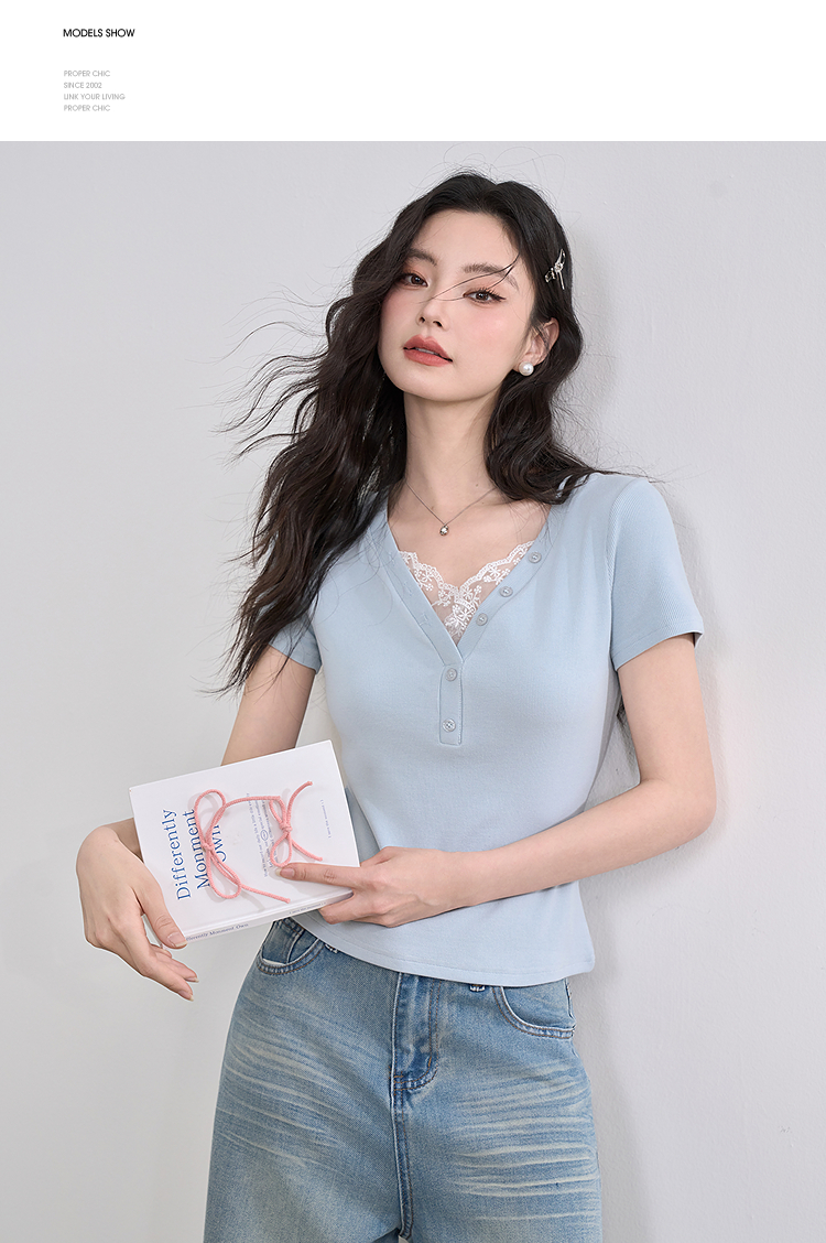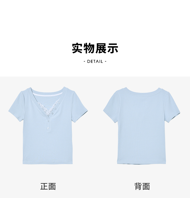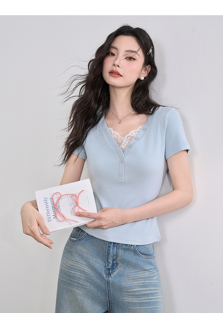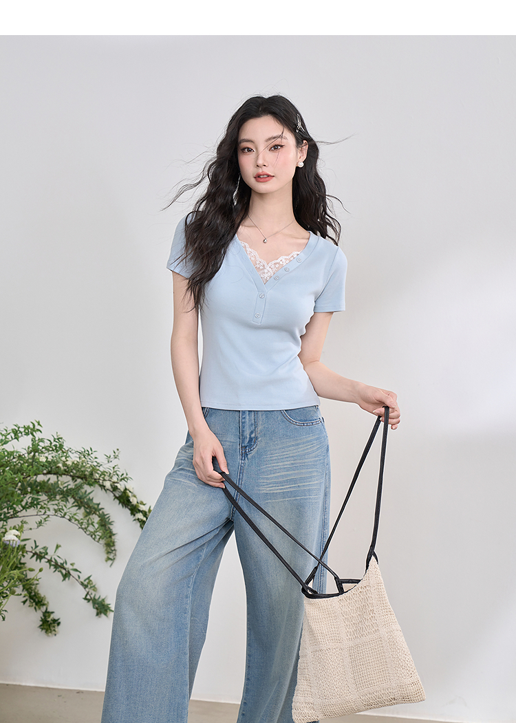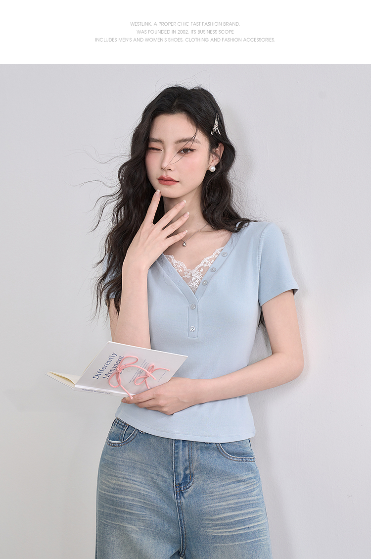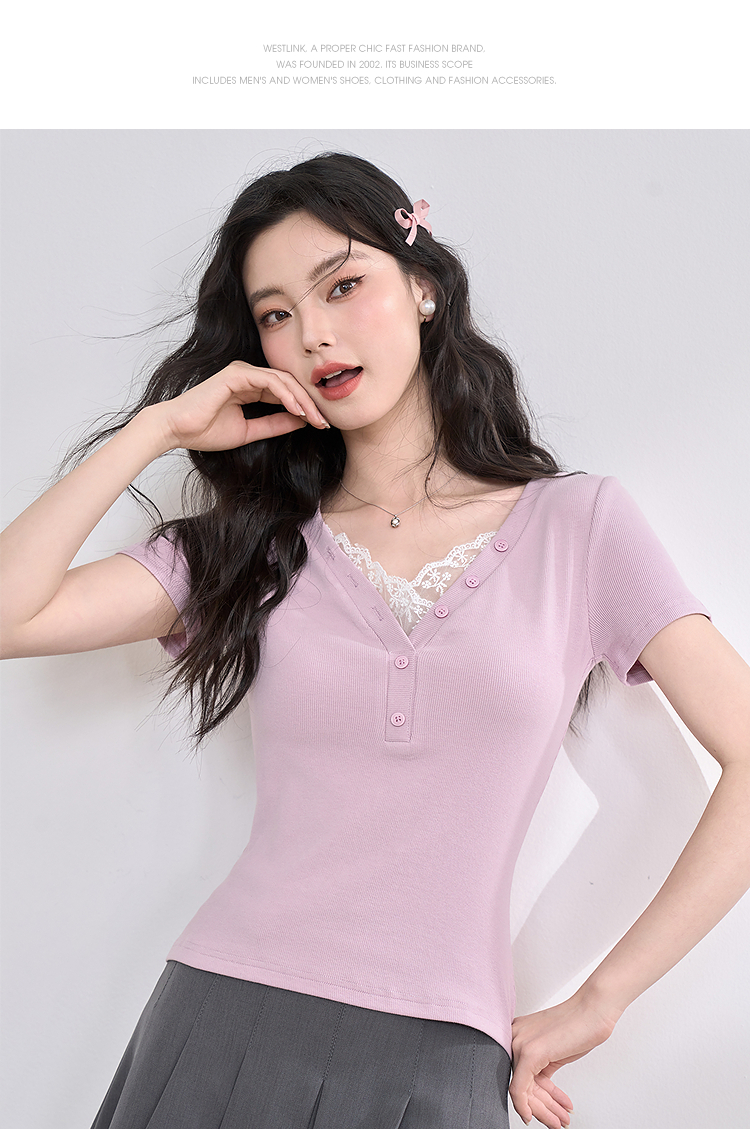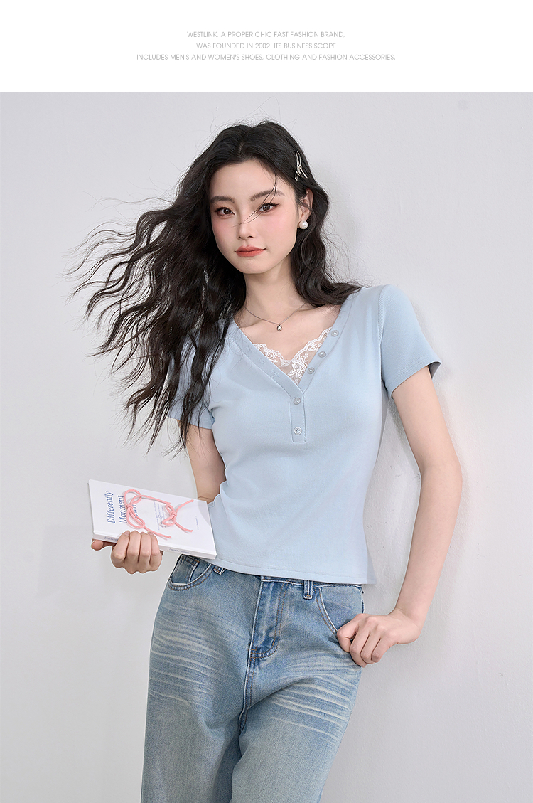 西遇蕾丝边短袖t恤女夏季新款外搭正肩v领修身短款上衣D0050675