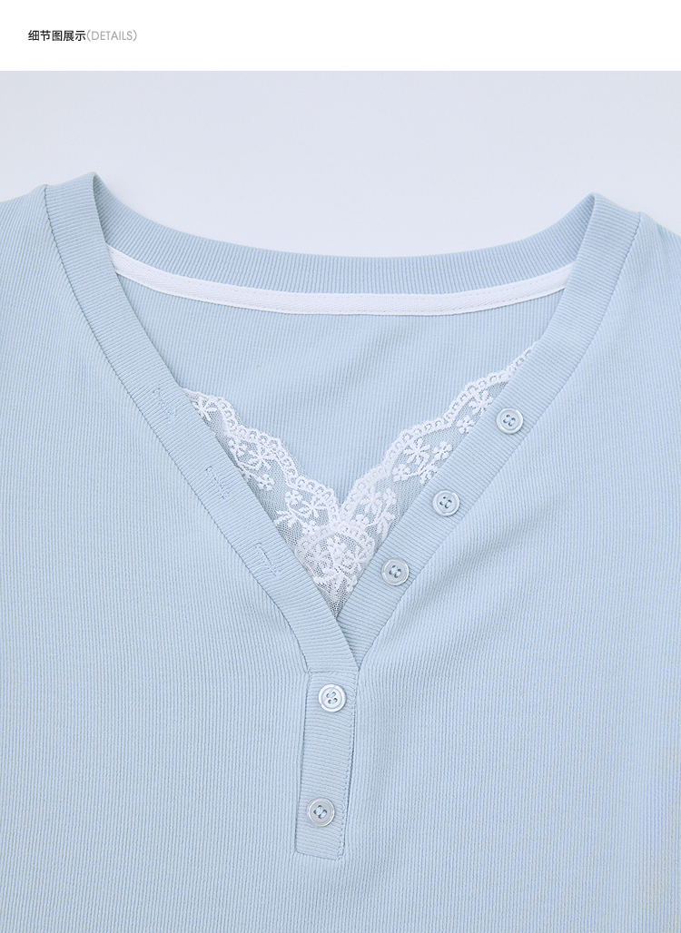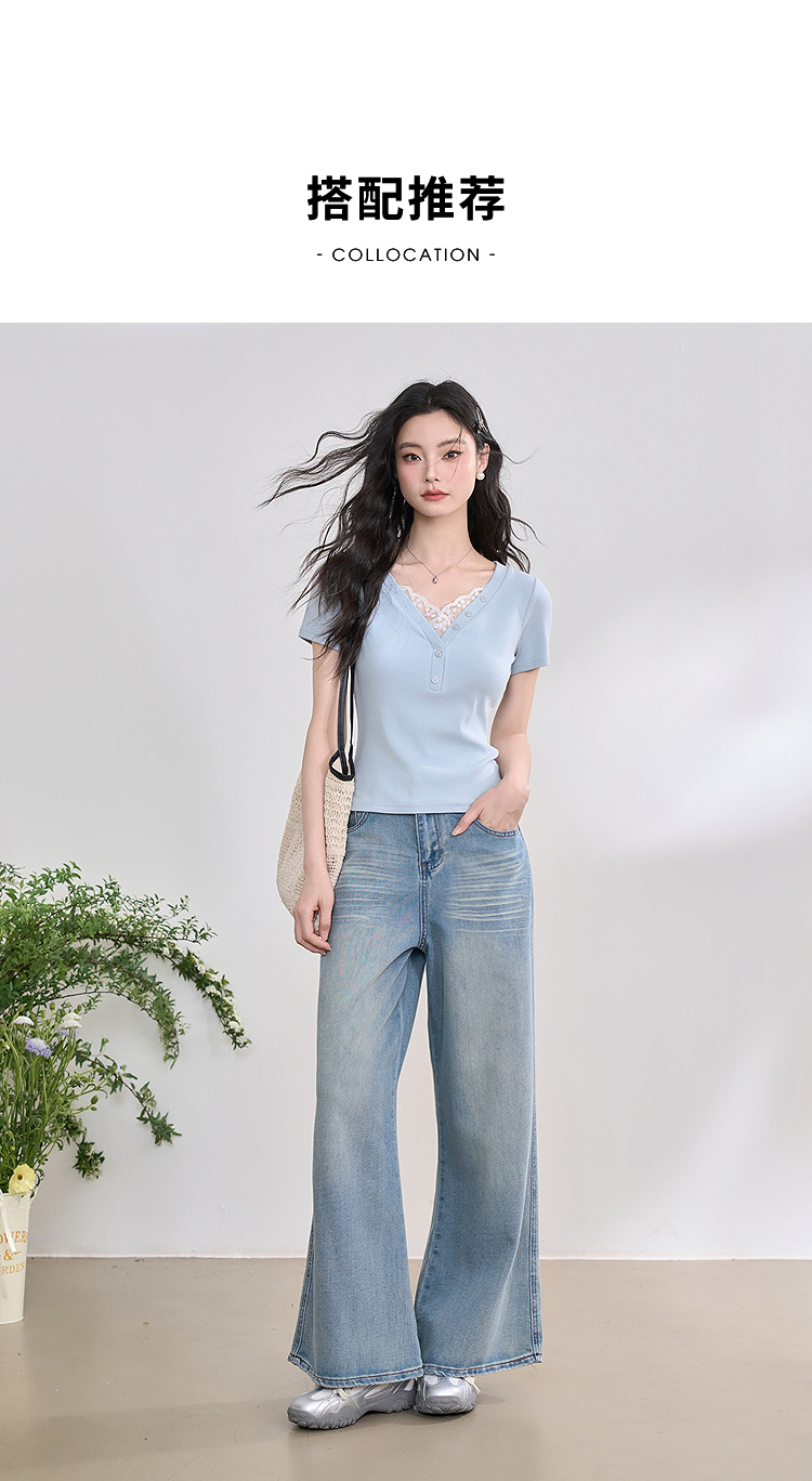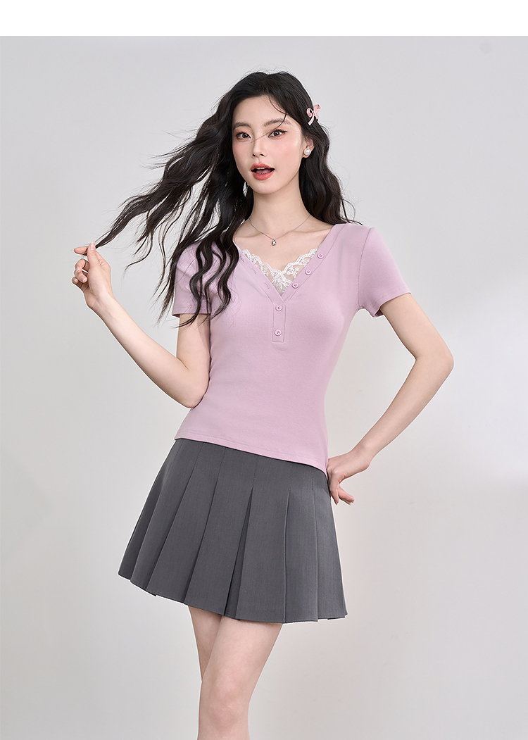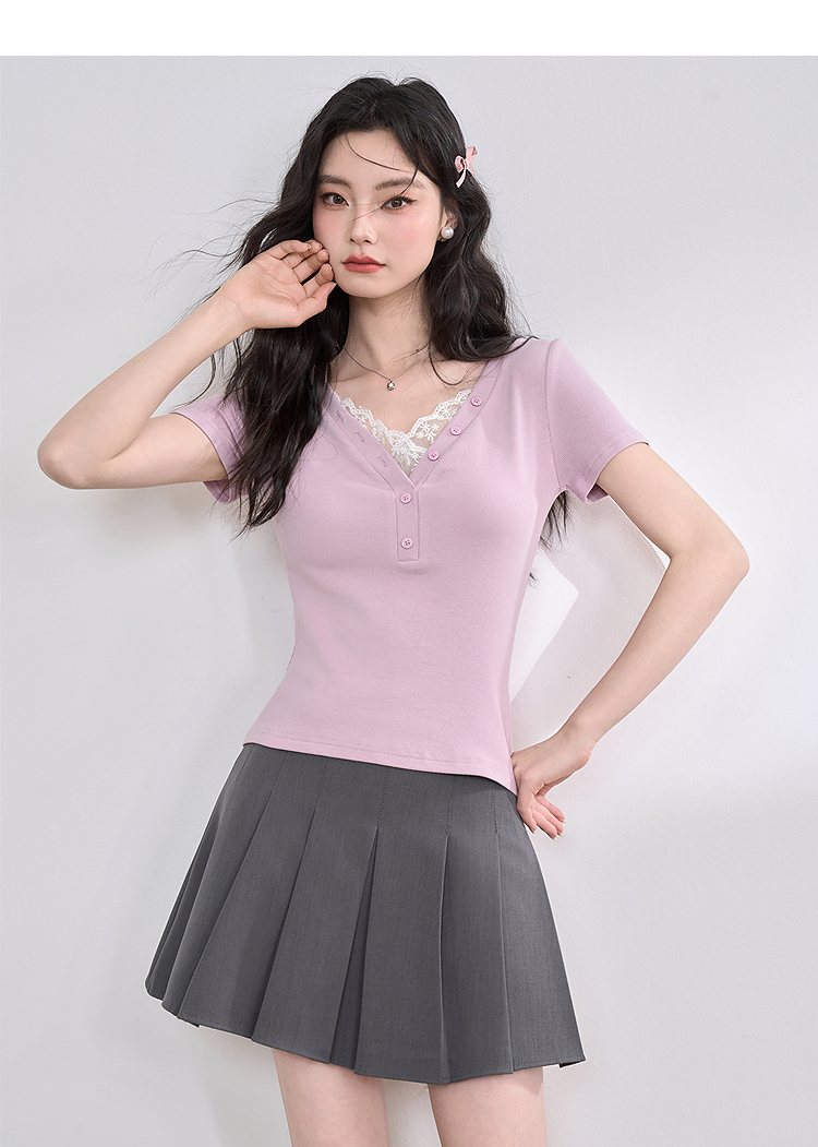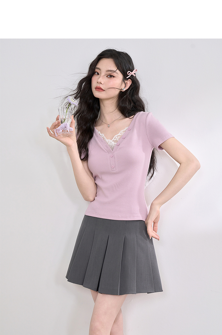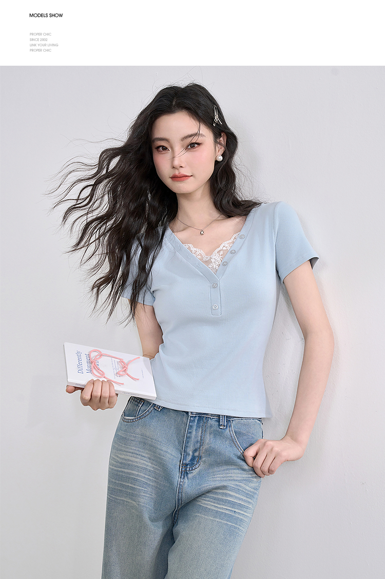 西遇蕾丝边短袖t恤女夏季新款外搭正肩v领修身短款上衣D0050675