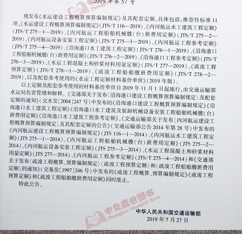 2019年水运建设工程概算预算编制规定(JTS/T116-2019) 2019版定额