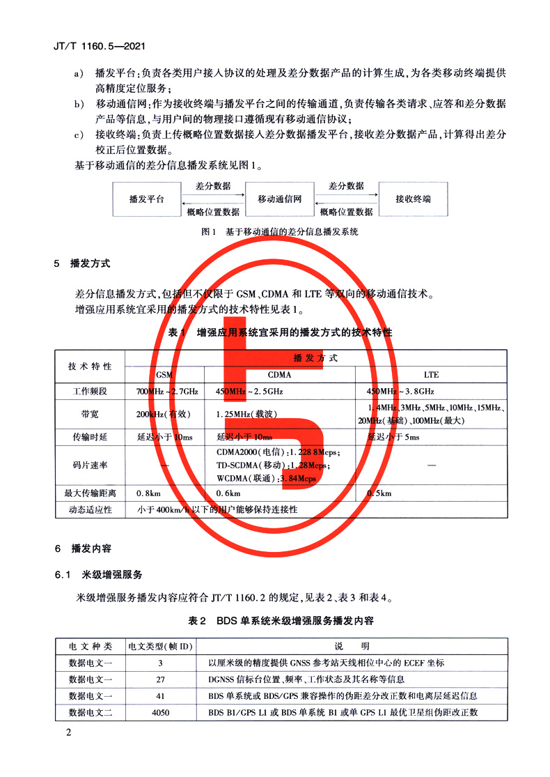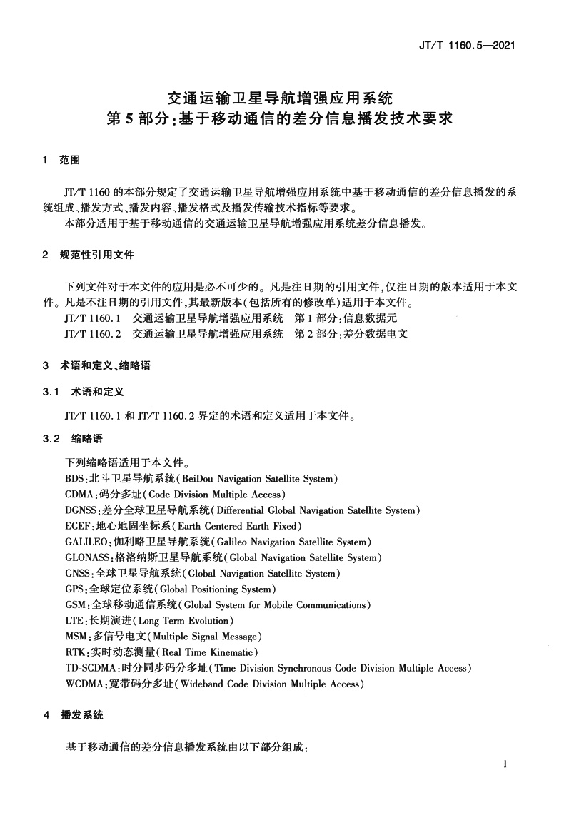 交通运输卫星导航增强应用系统 第5部分:基于移动通信的差分信息播发技术要求(JT/T 1160.5—2021)
