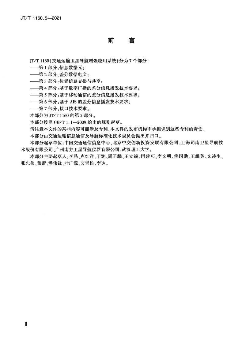 书名:交通运输卫星导航增强应用系统 第5部分:基于移动通信的差分信息播发技术要求(JT/T 1160.5—2021)