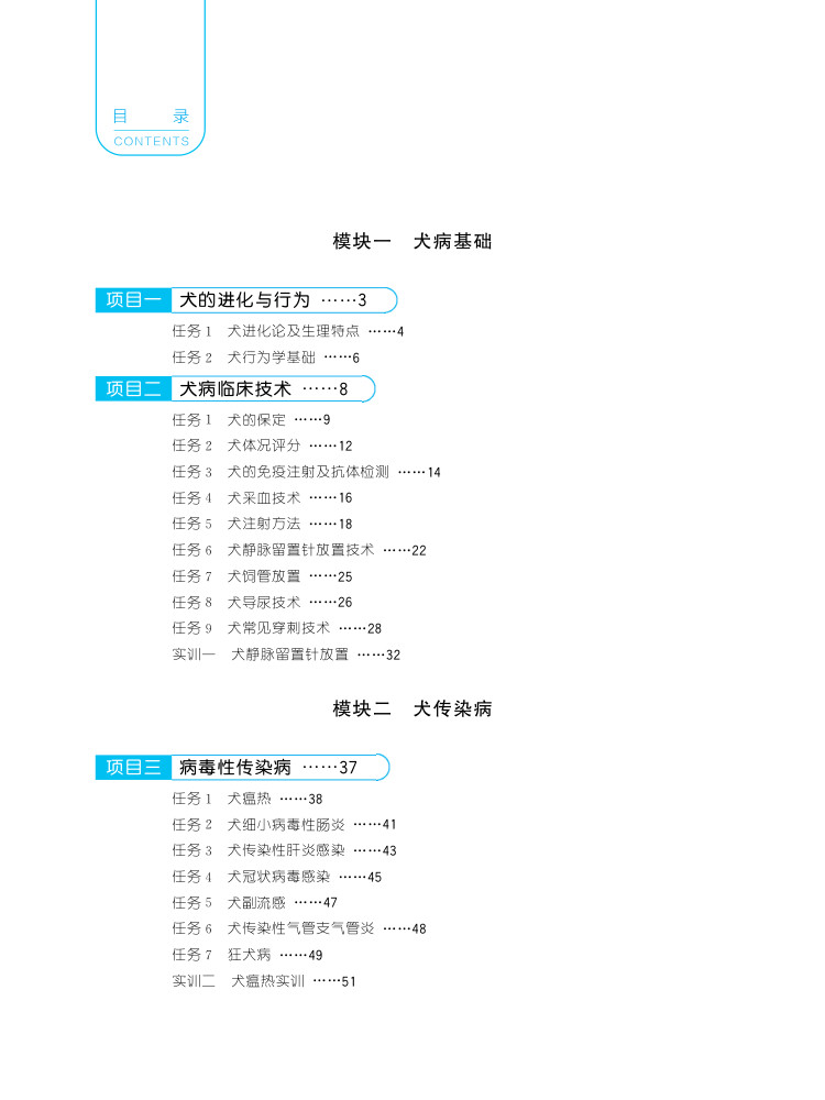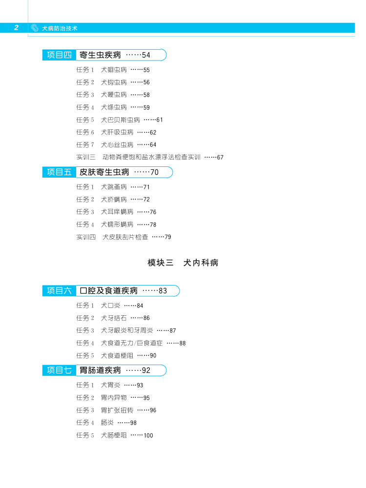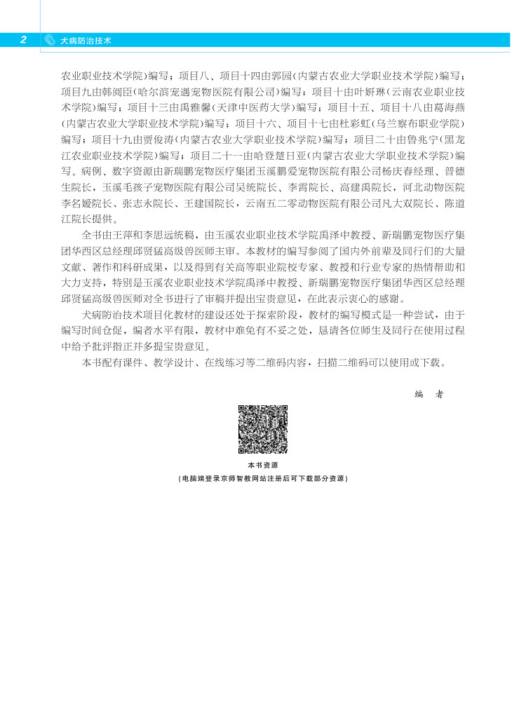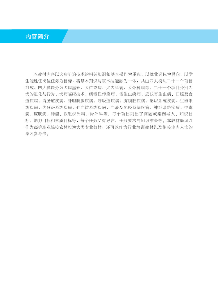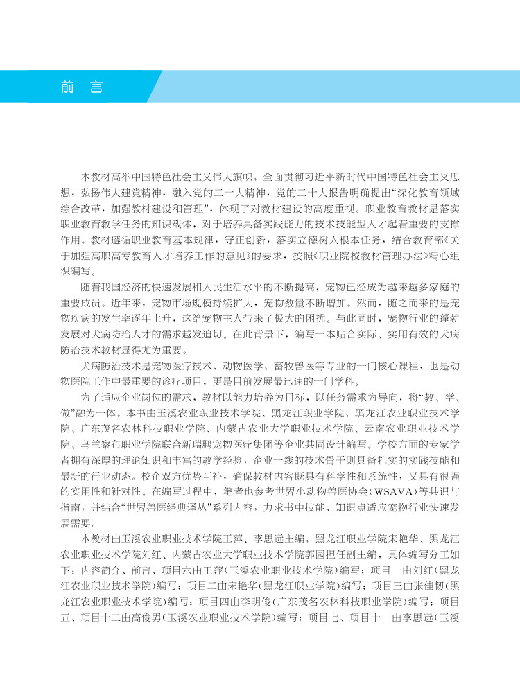 本教材为畜牧类及宠物专业疾病诊断的专业基础课教材,本书是玉溪农业职业技术学院相关教师共同教学科研的结晶。全书分为项目一 犬常见传染病、项目二寄生虫病、项目三内科疾病、项目四外产科疾病、项目五皮肤病、项目六肿瘤疾病。全书以实际生产过程为教学内容,采用项目任务及相关学习情境,针对性较强,具有一定的实际指导意义。全书采用融合媒体编写形式,全书配备数字资源、视频微课等。有利于师生教与学。本书作者团队属多个省市区,具有广泛的适应性,教材内容结合多地多域,普适性较强。