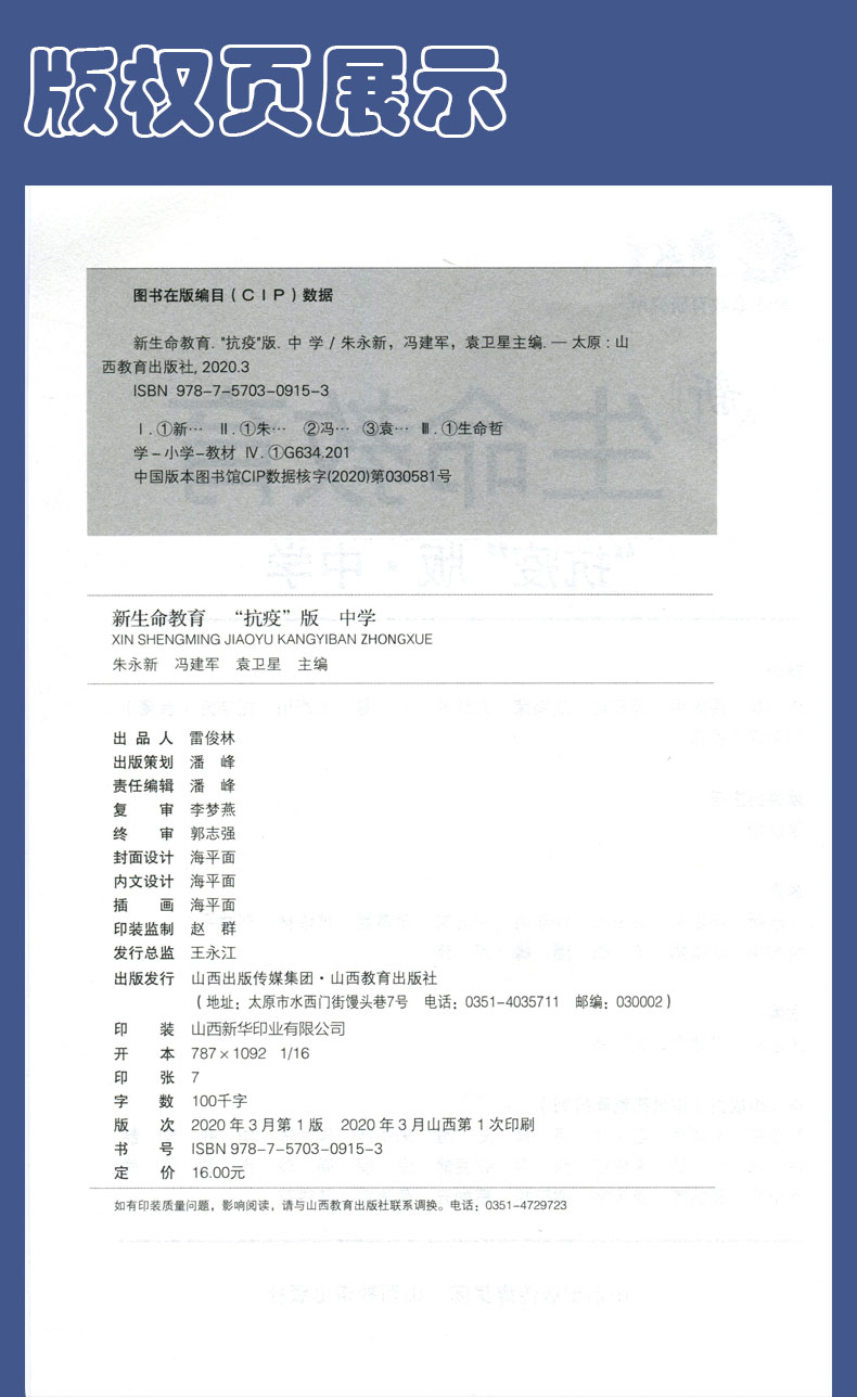 正版 新生命教育抗疫版 中学段 初中教材 朱永新冯建军袁卫星