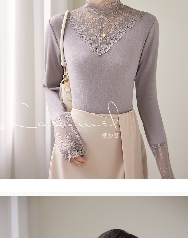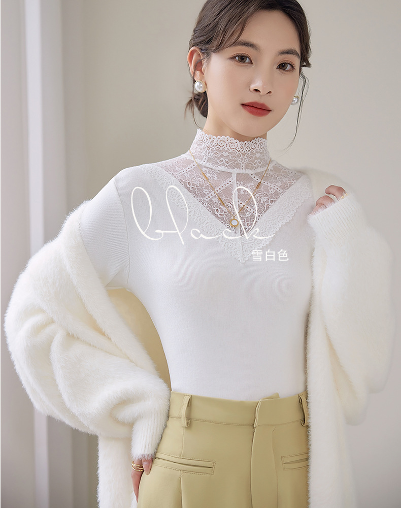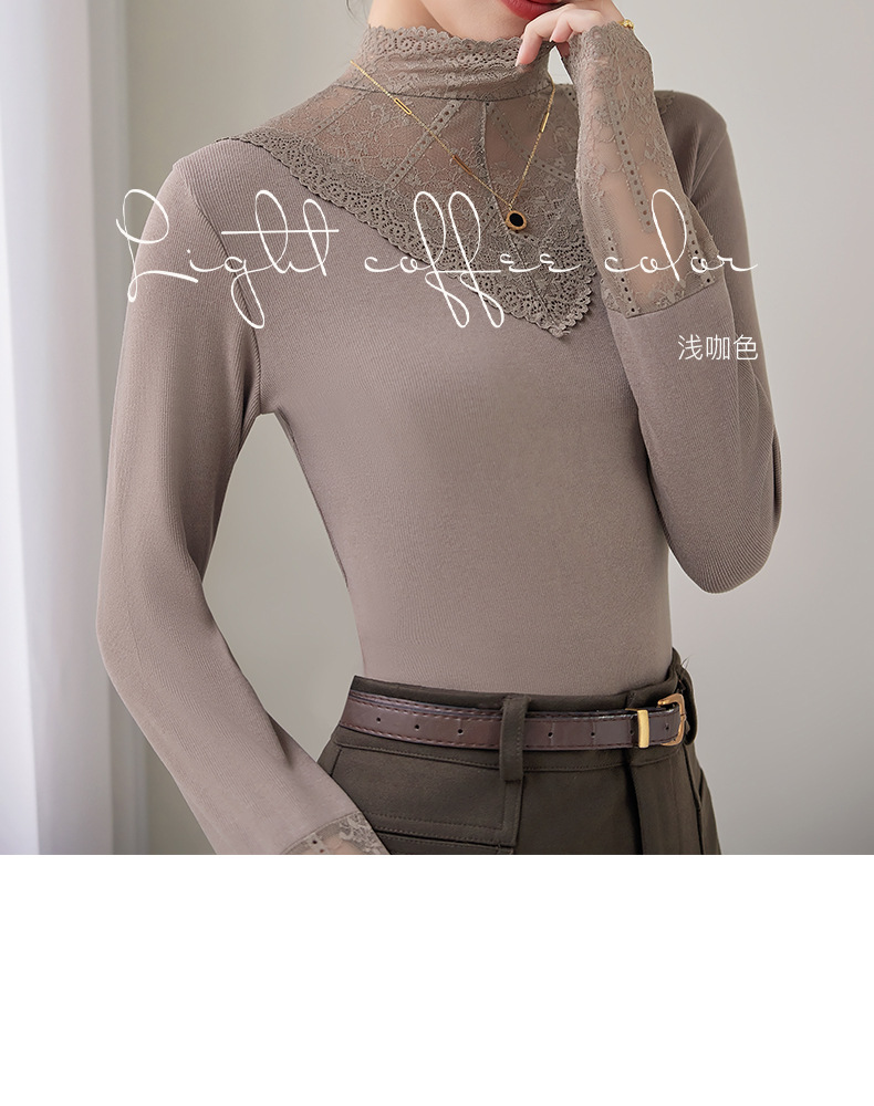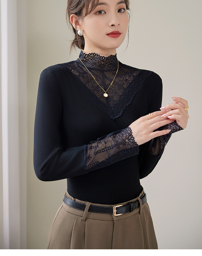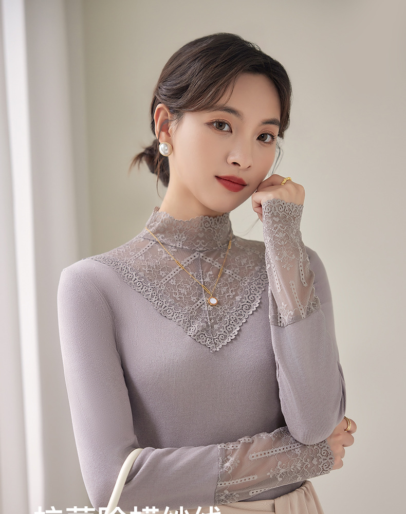 2024新款加绒加厚网纱蕾丝打底衫女春秋内搭修身洋气长袖上衣简约