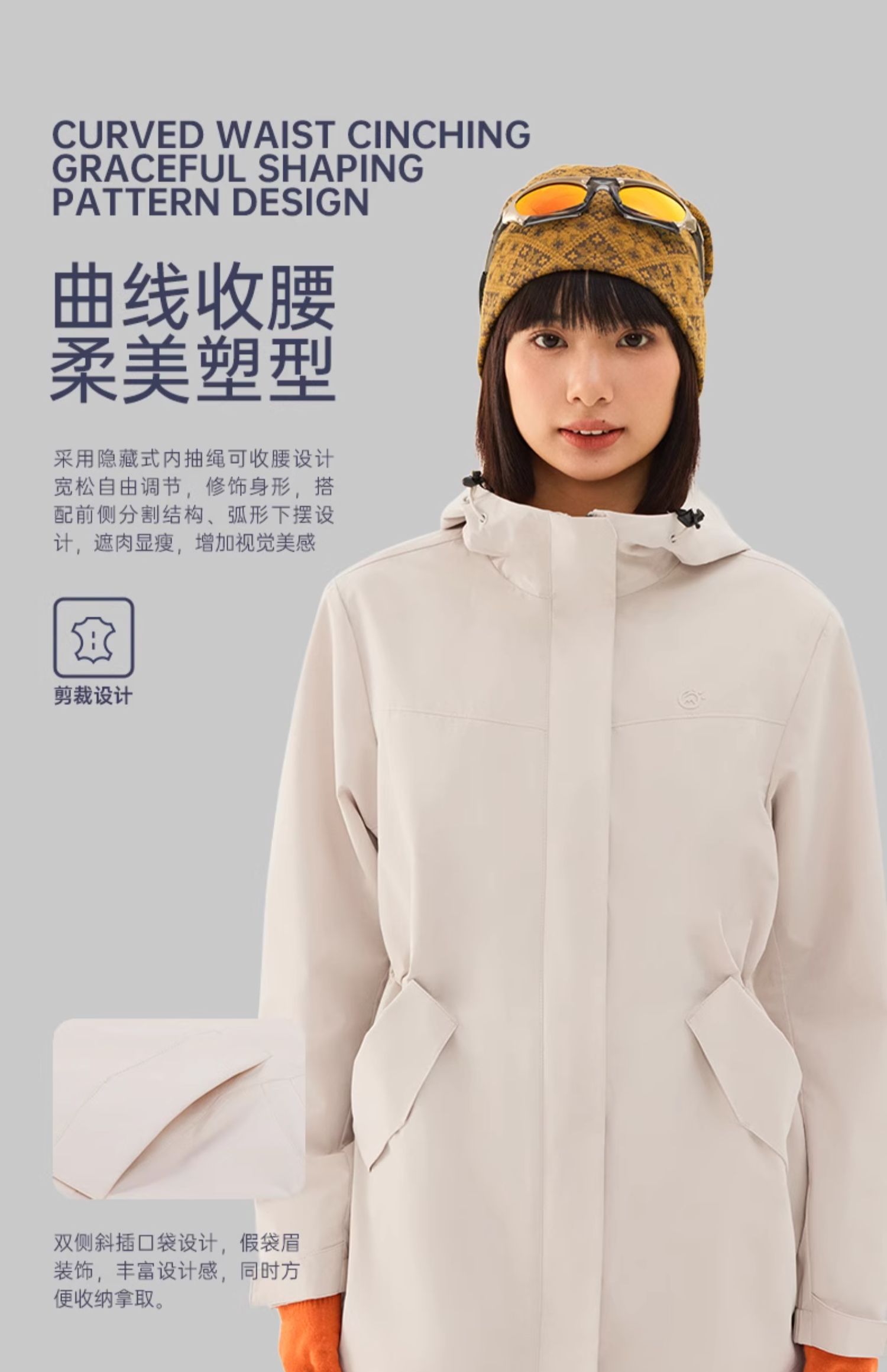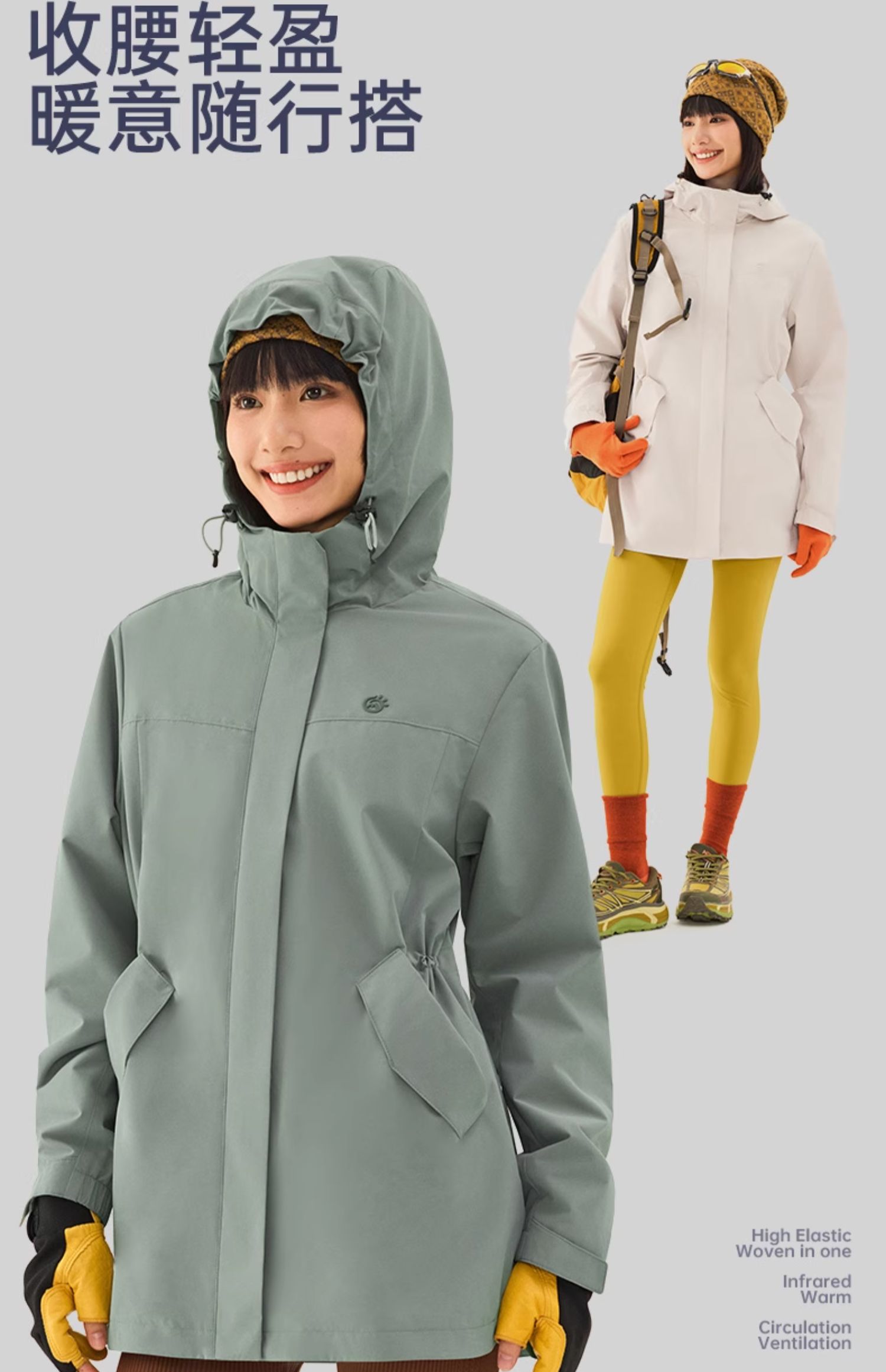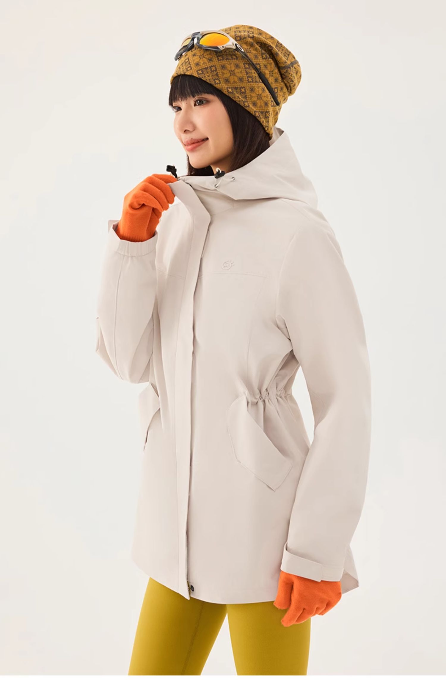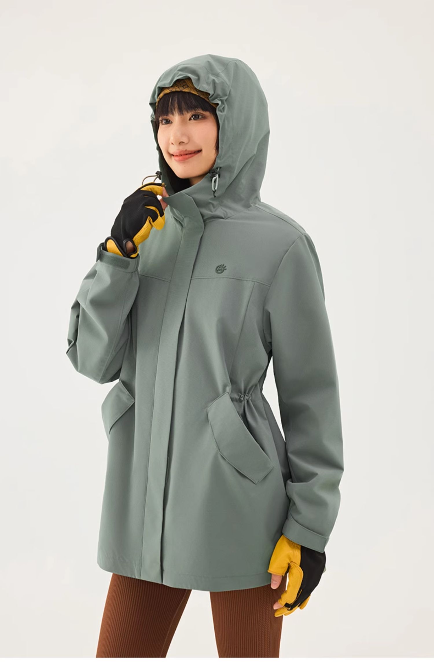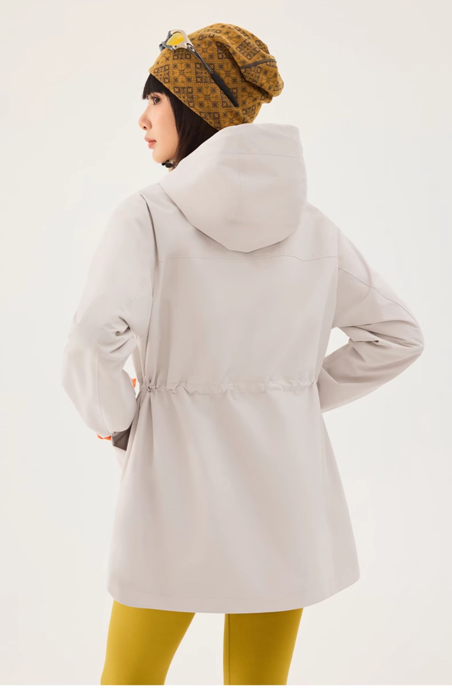 探拓户外软壳衣女加绒防风防泼水透气徒步登山中长款收腰连帽外套
