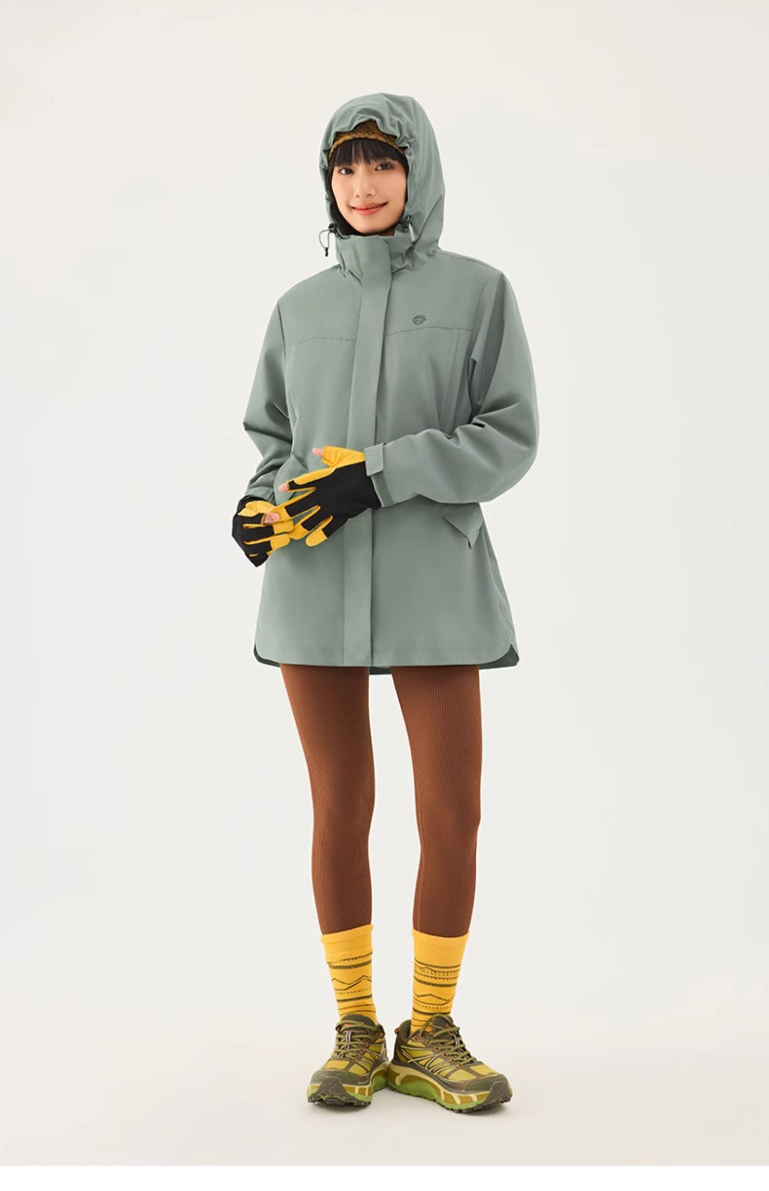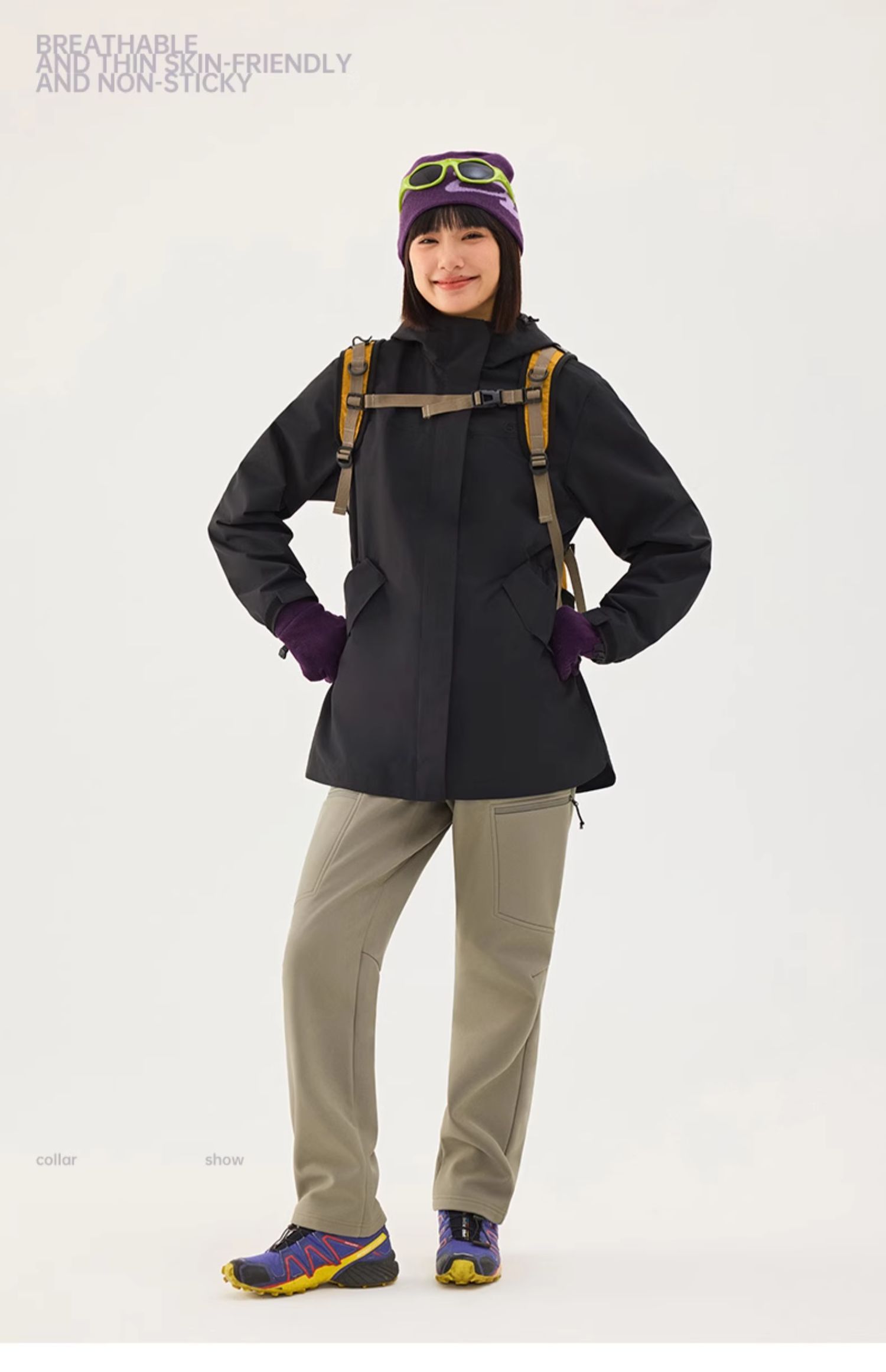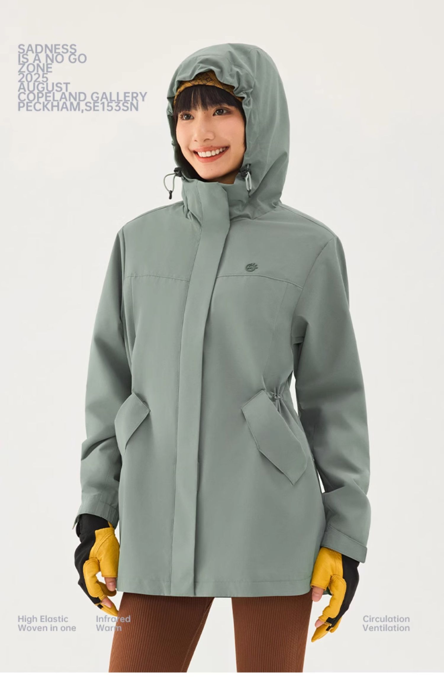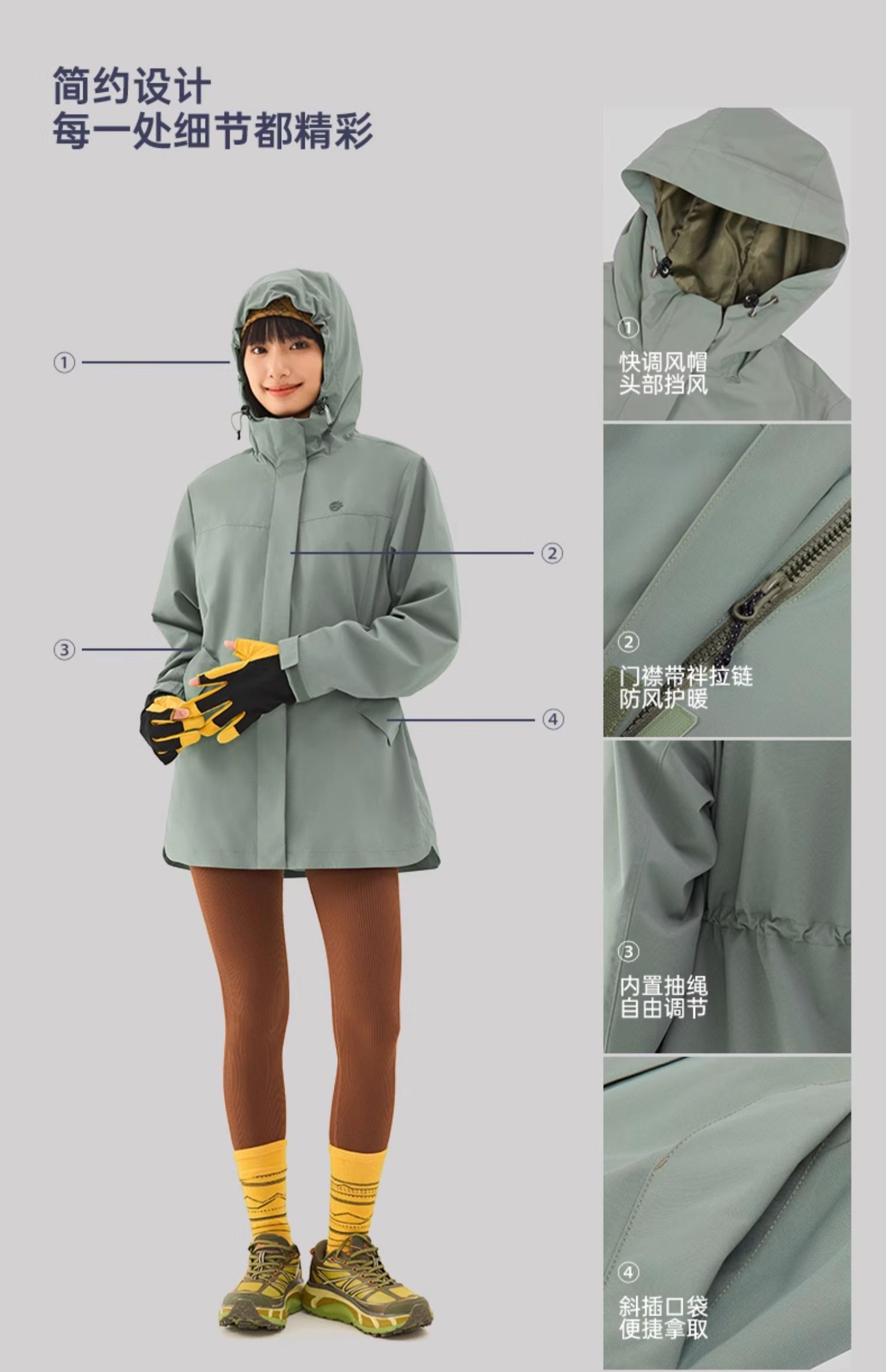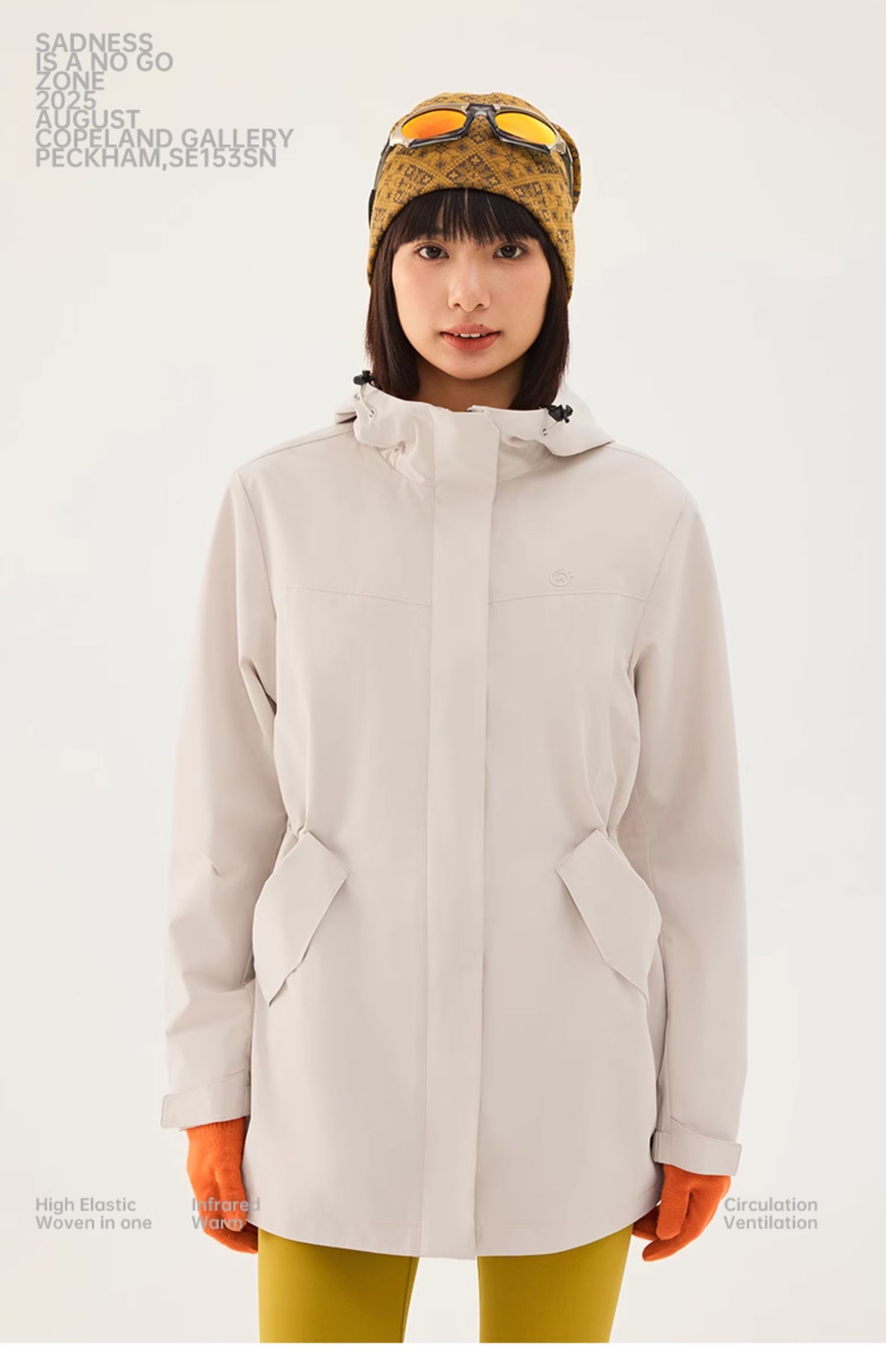 探拓户外软壳衣女加绒防风防泼水透气徒步登山中长款收腰连帽外套
