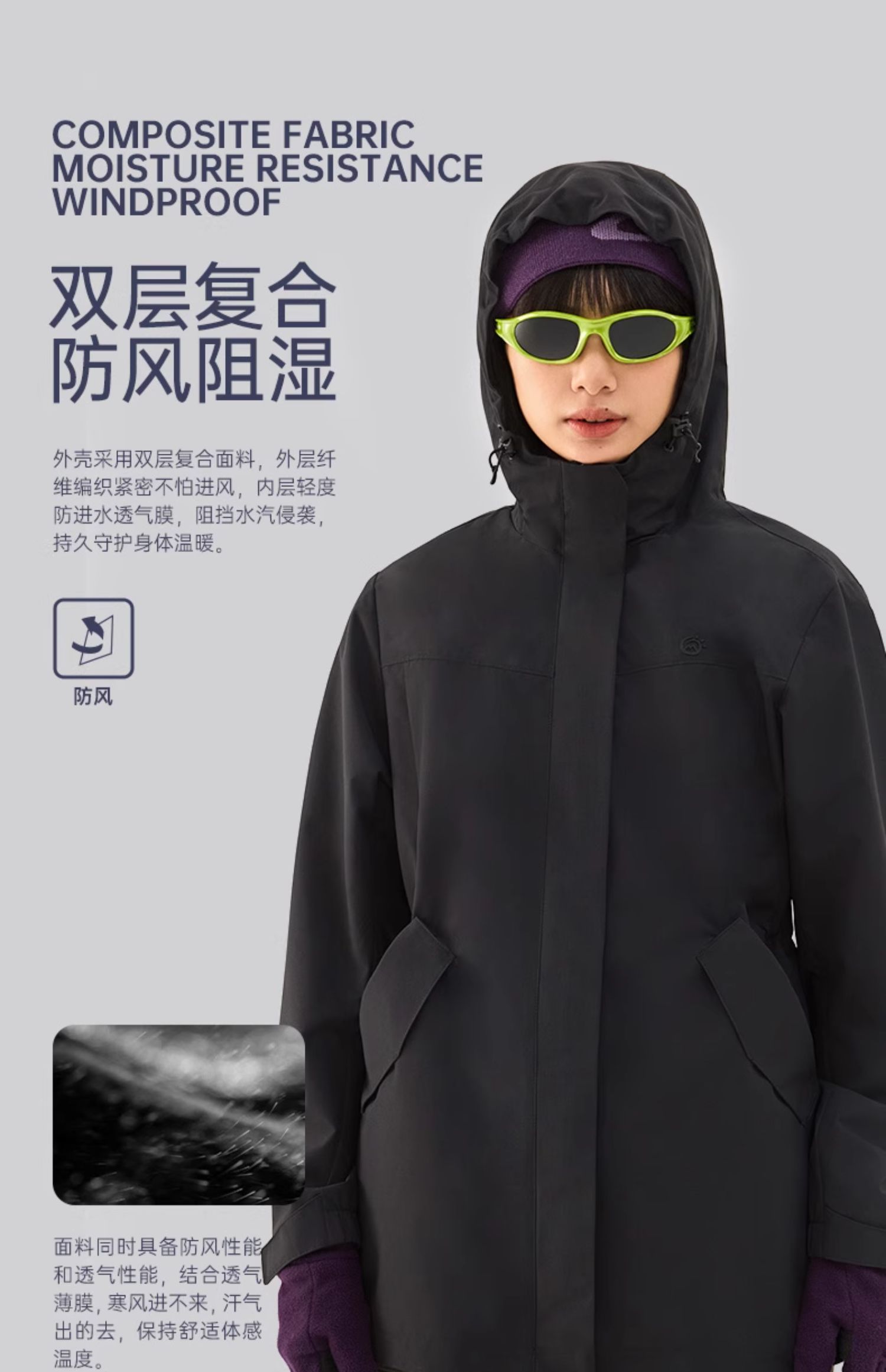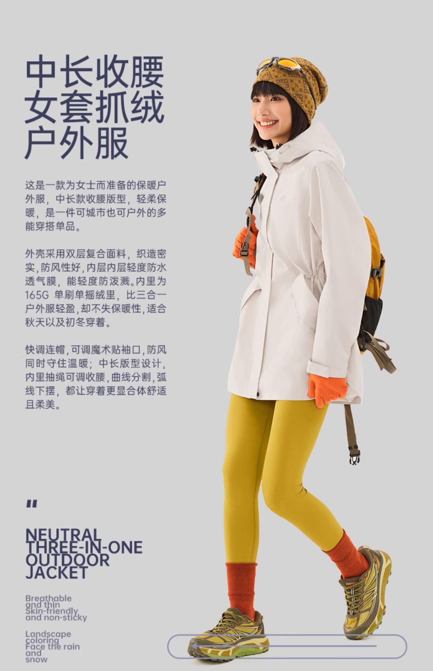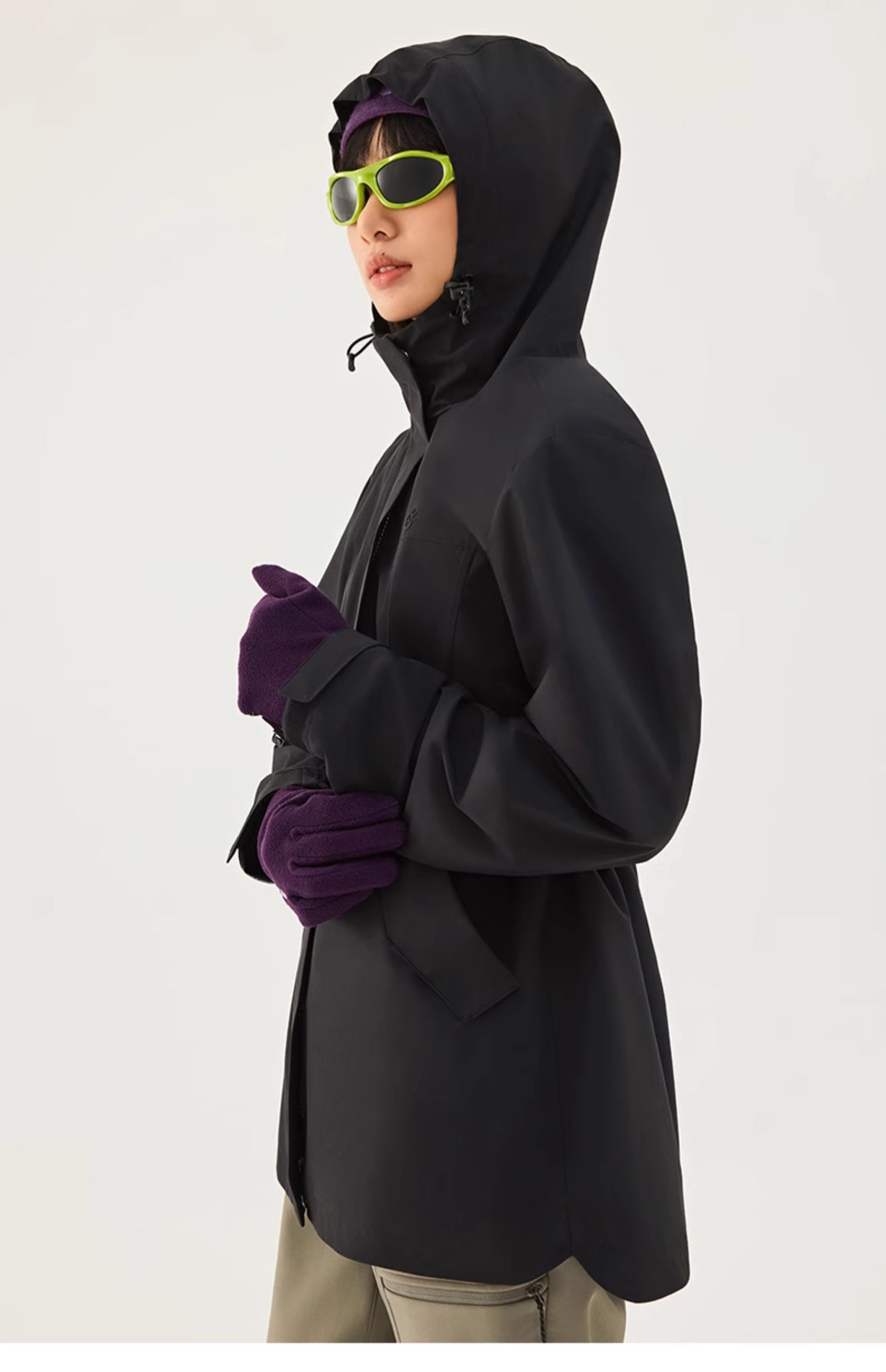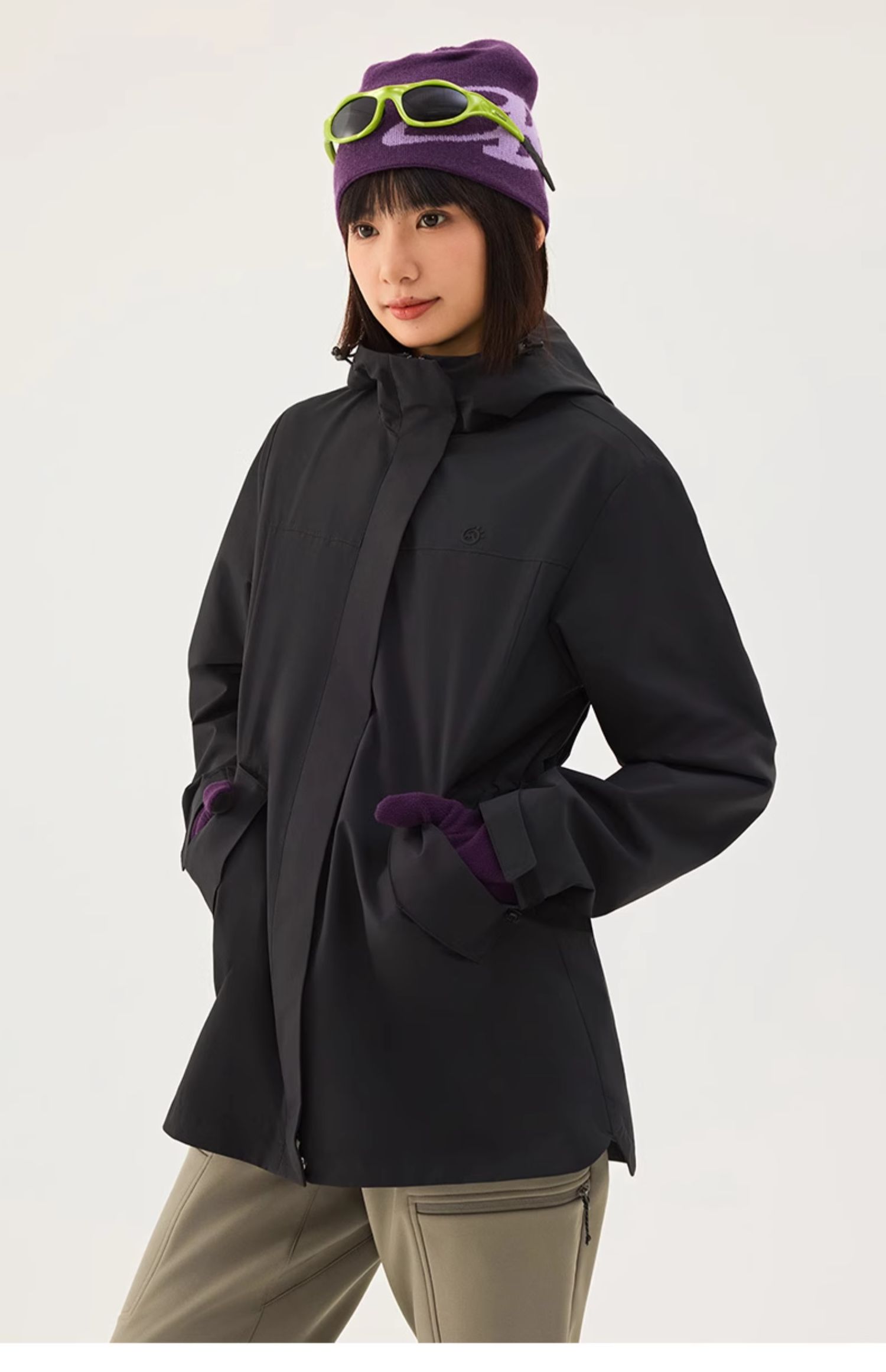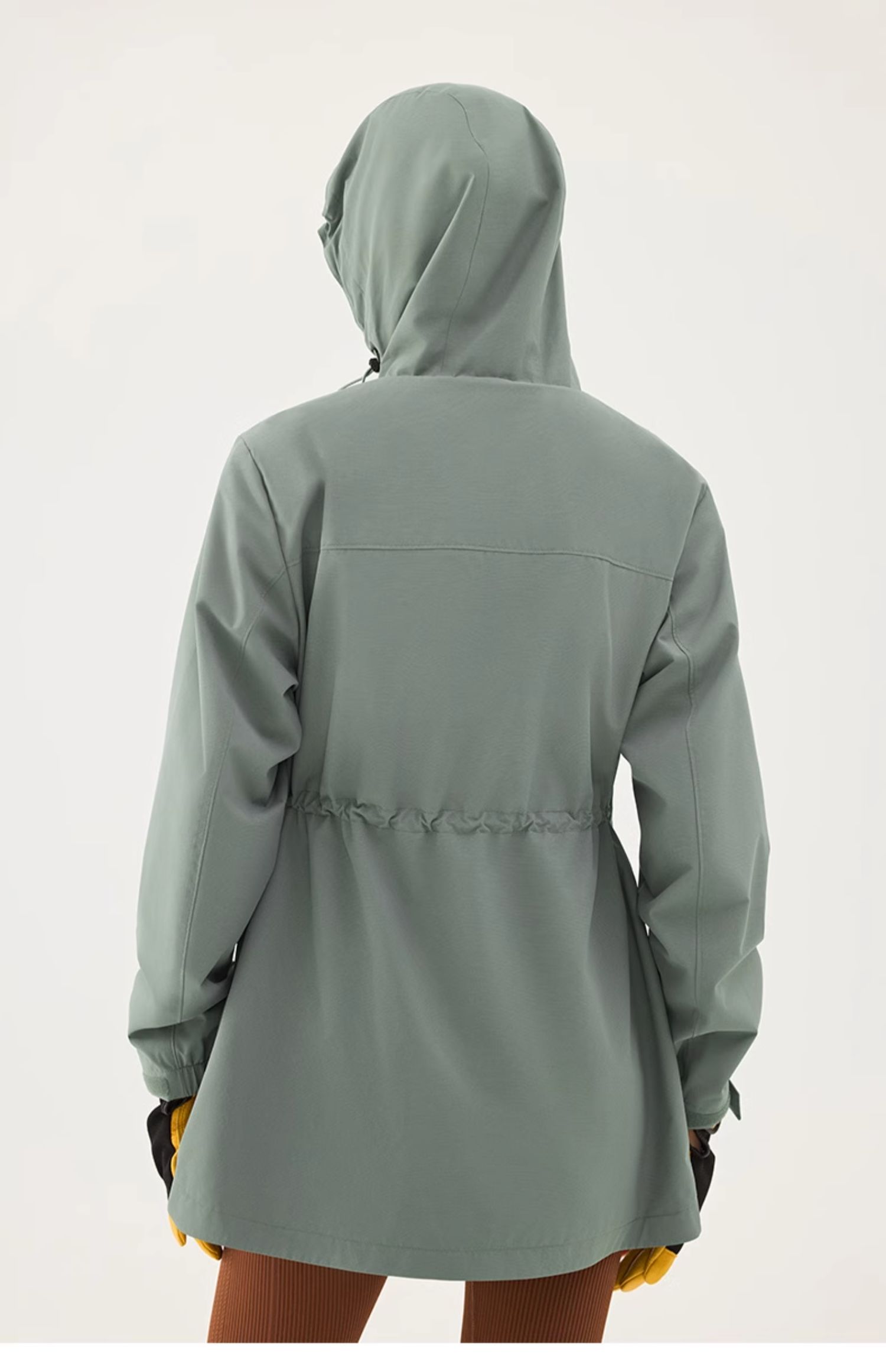 探拓户外软壳衣女加绒防风防泼水透气徒步登山中长款收腰连帽外套