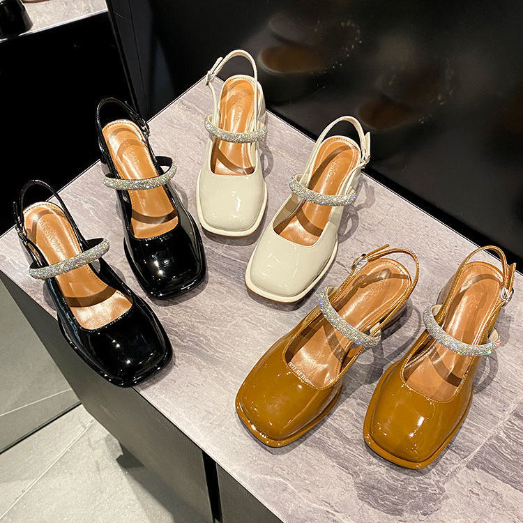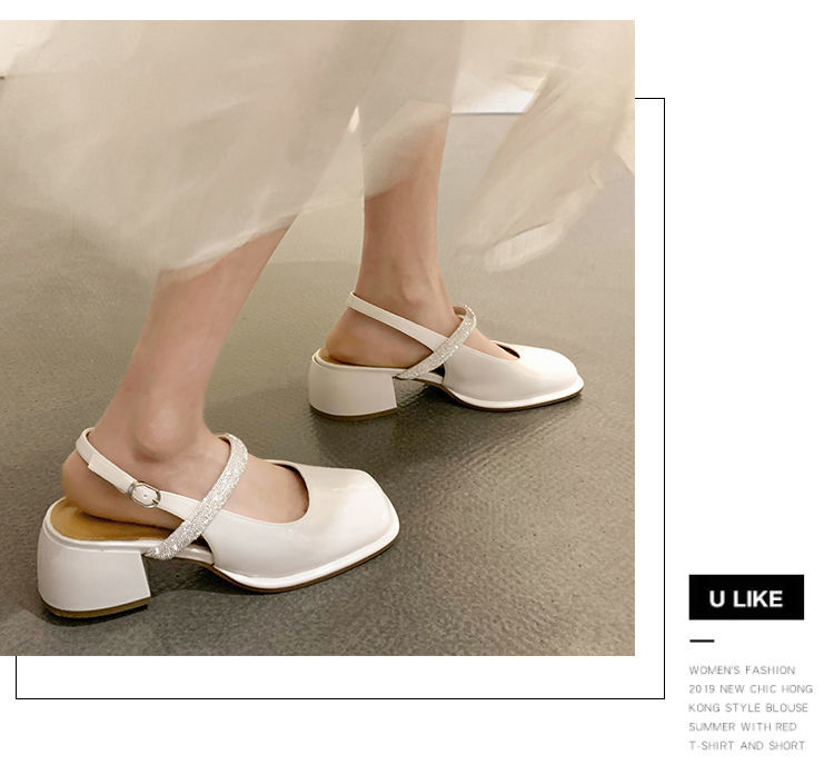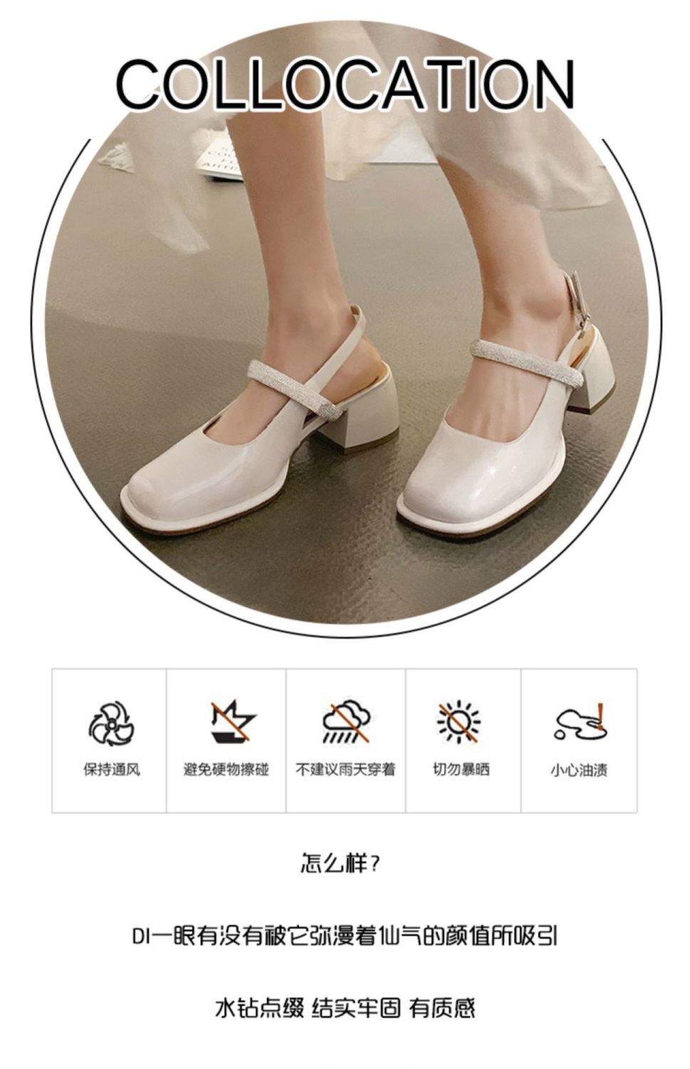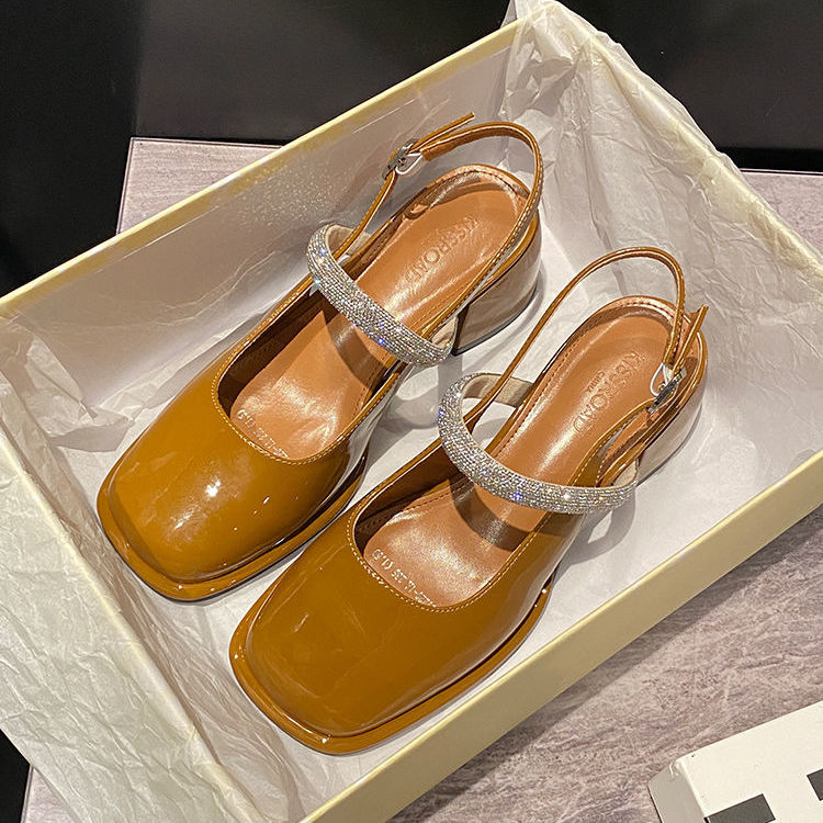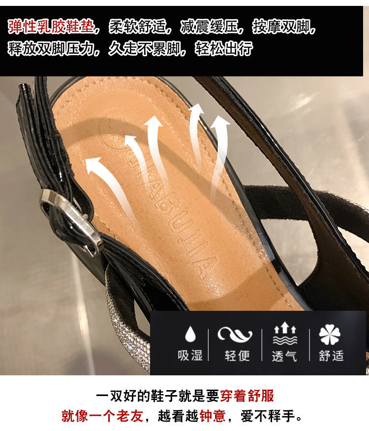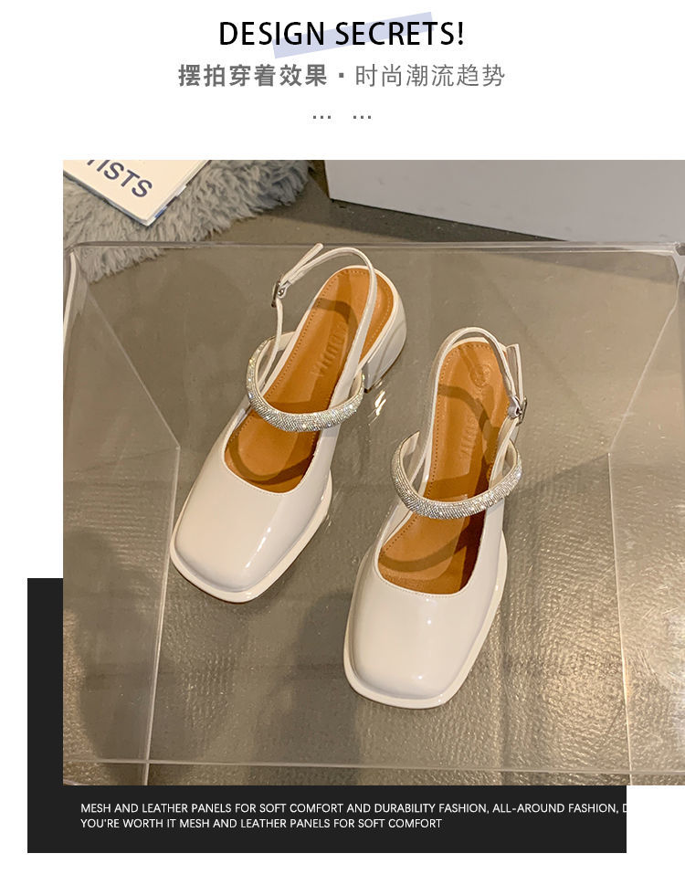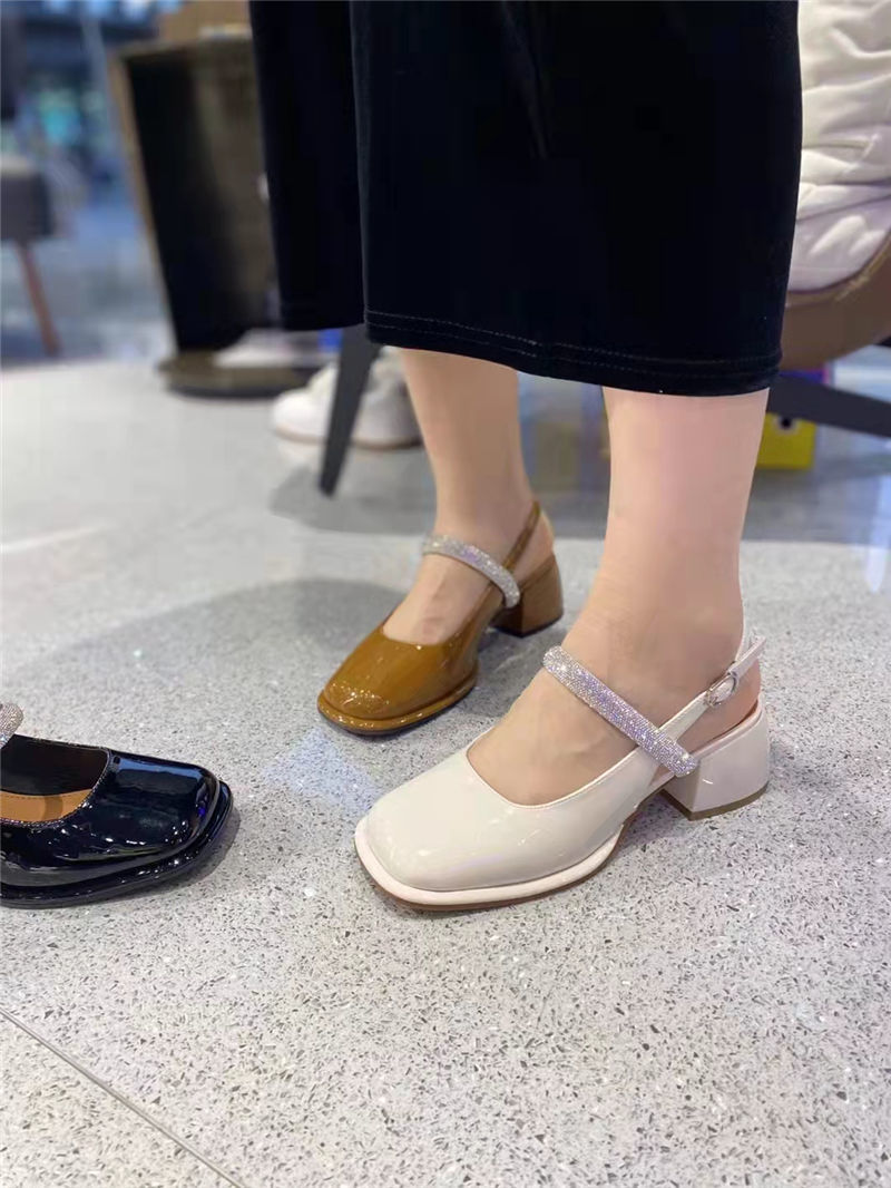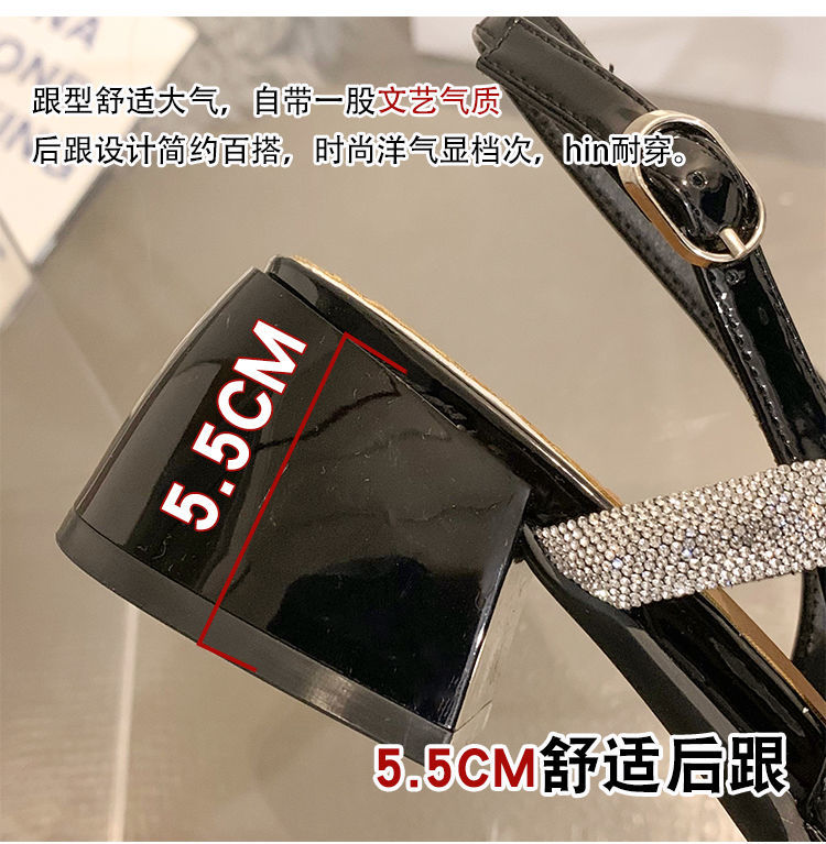2022年新款夏季包头凉鞋女夏粗跟中跟水钻方头一字带高跟鞋