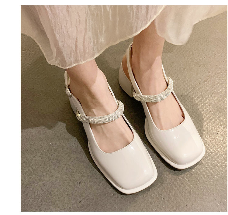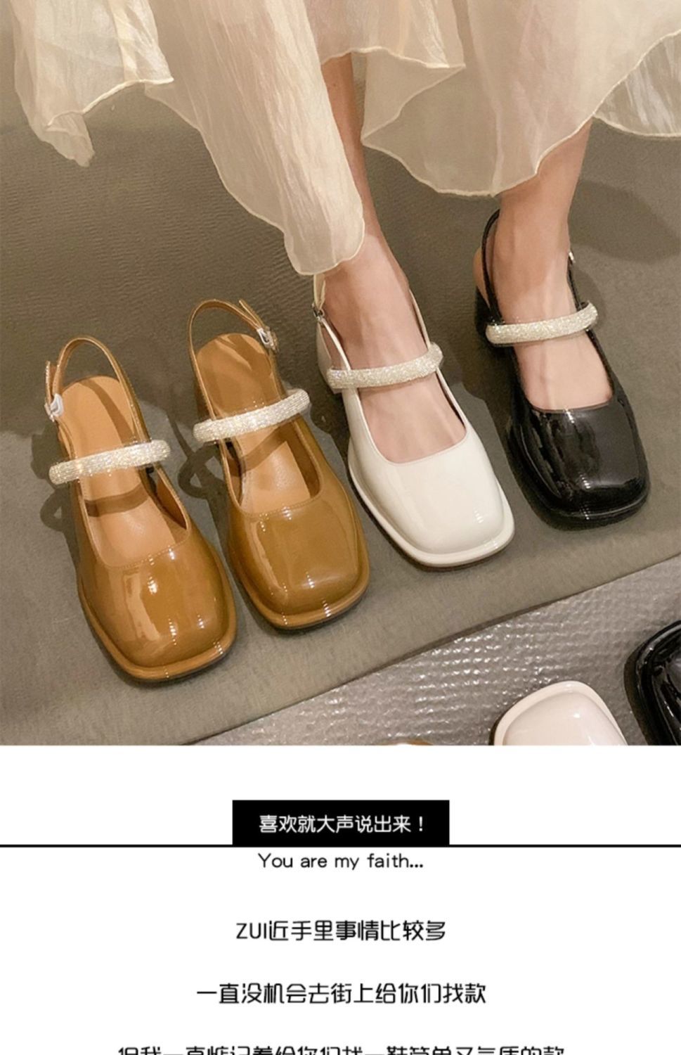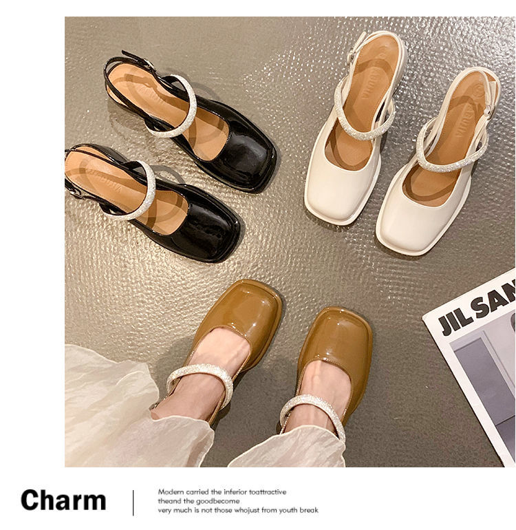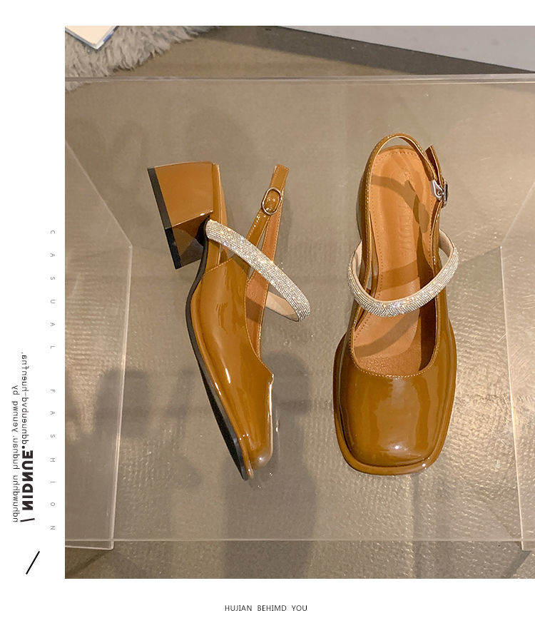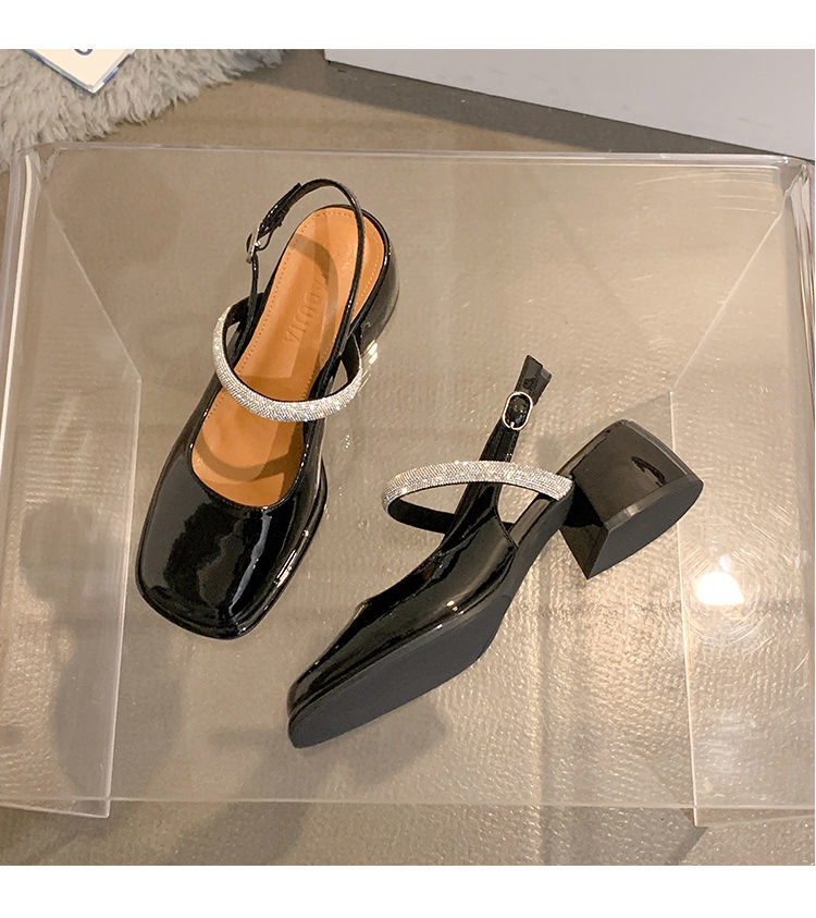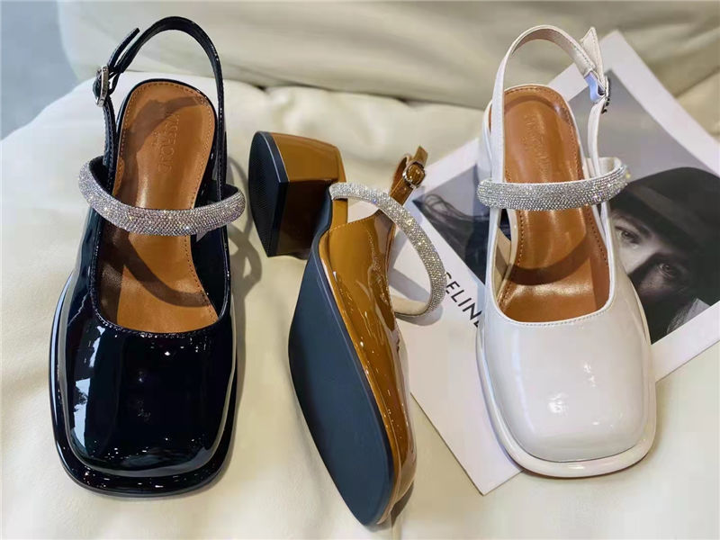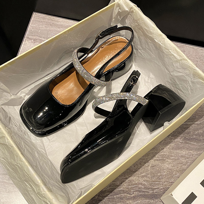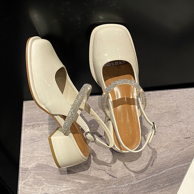 2022年新款夏季包头凉鞋女夏粗跟中跟水钻方头一字带高跟鞋