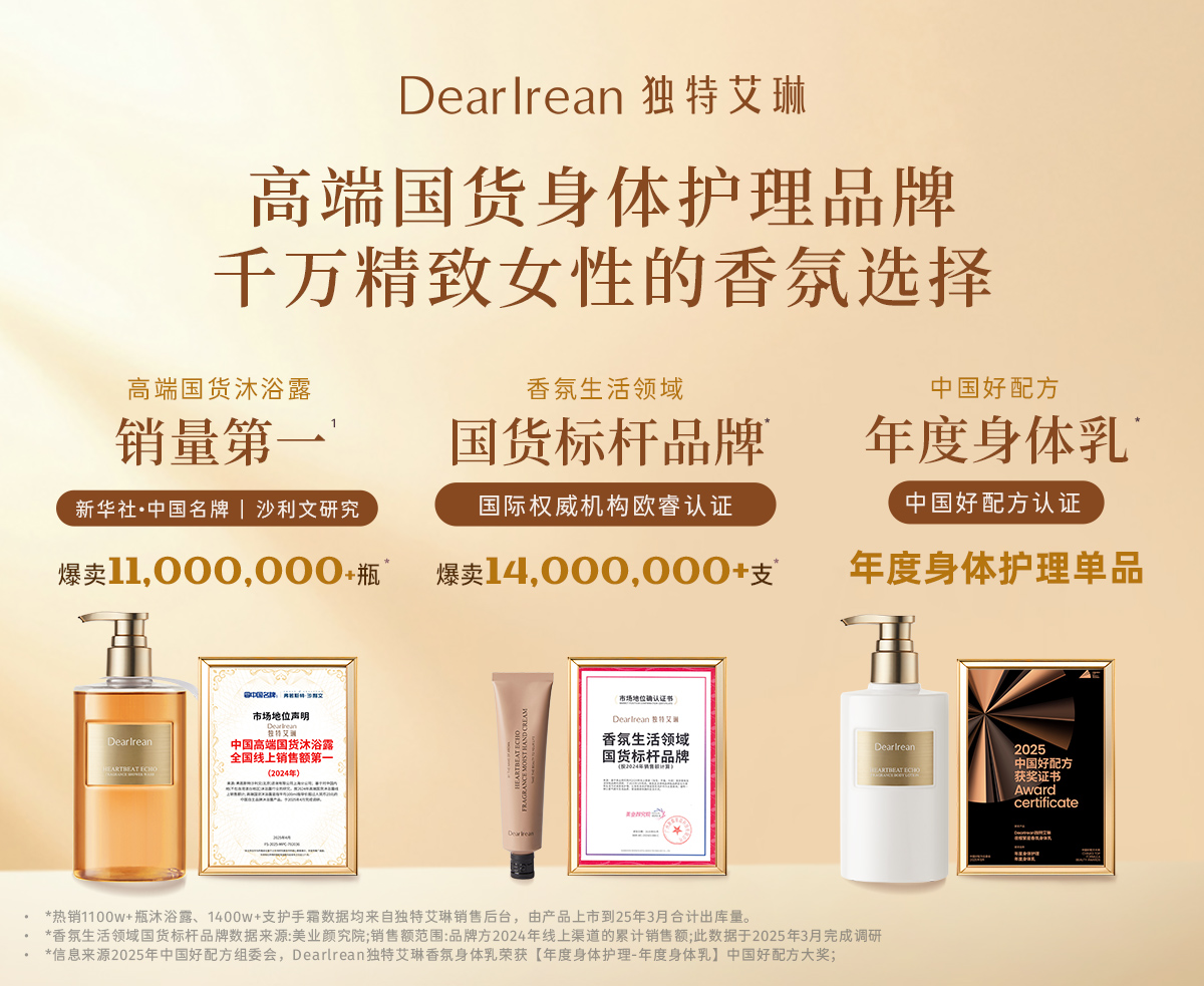- DearIrean 独特艾琳,高定香氛生活品牌,拥有体•研究所,品牌致力于将高定香氛带入生活,同时倡导“以香之名,带给生活美好方式”的品牌理念,传递精致女性的爱、独立、自信。