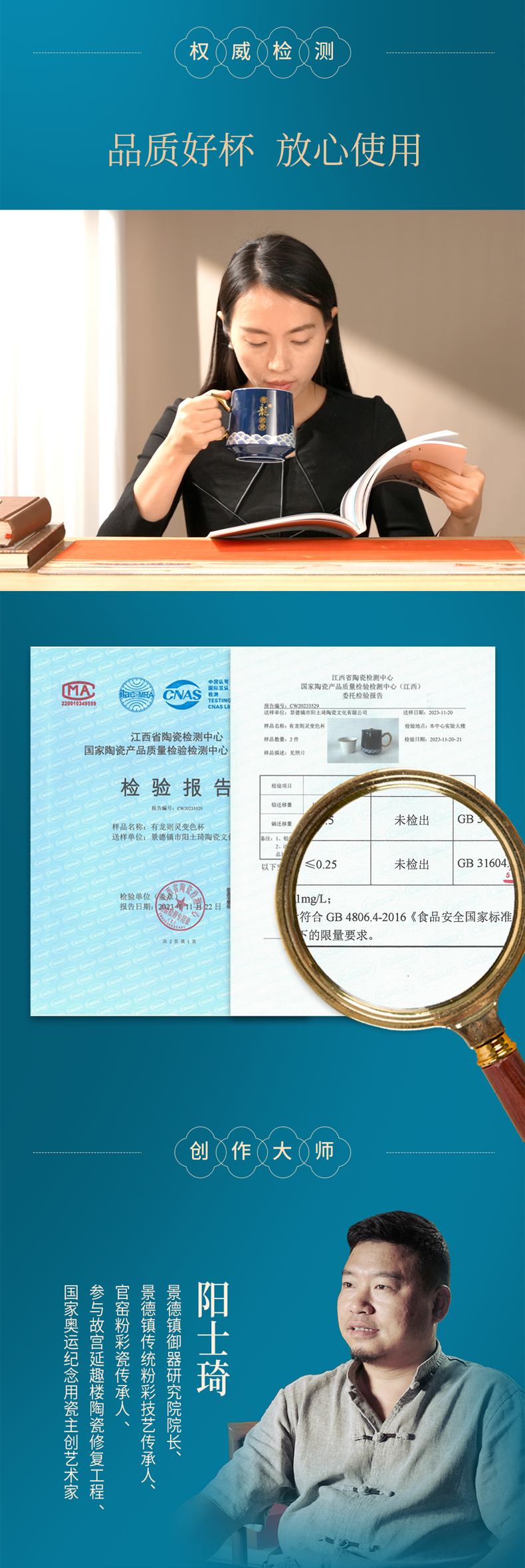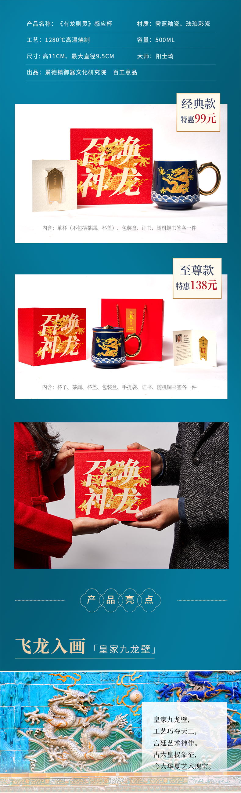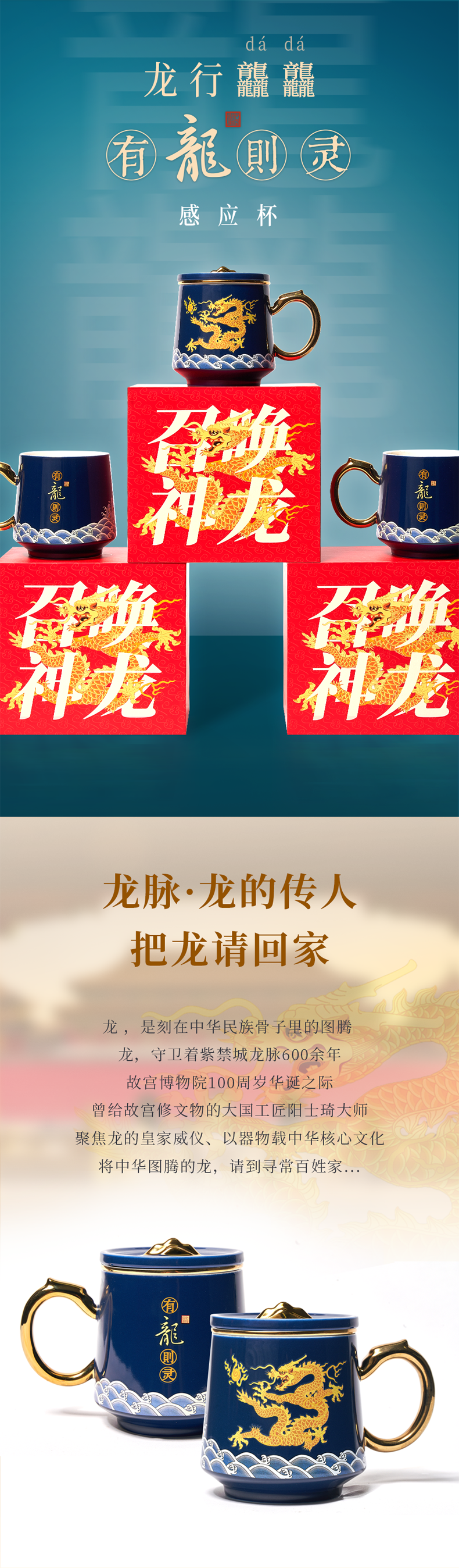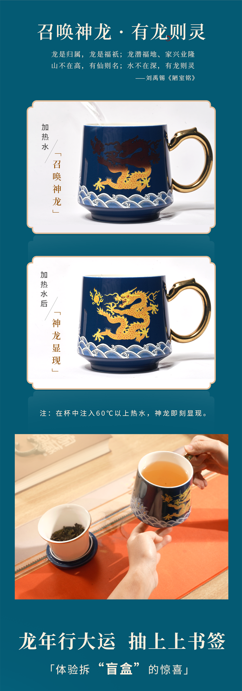 【爆款推荐!】《有龙则灵》霁蓝釉陶瓷感温马克杯 2024龙杯专用办公室水杯带盖过滤茶水分离泡茶杯子