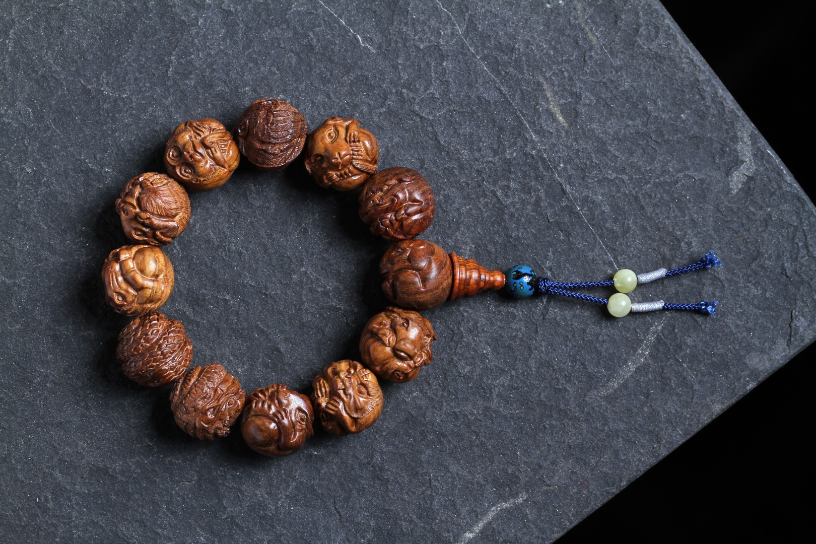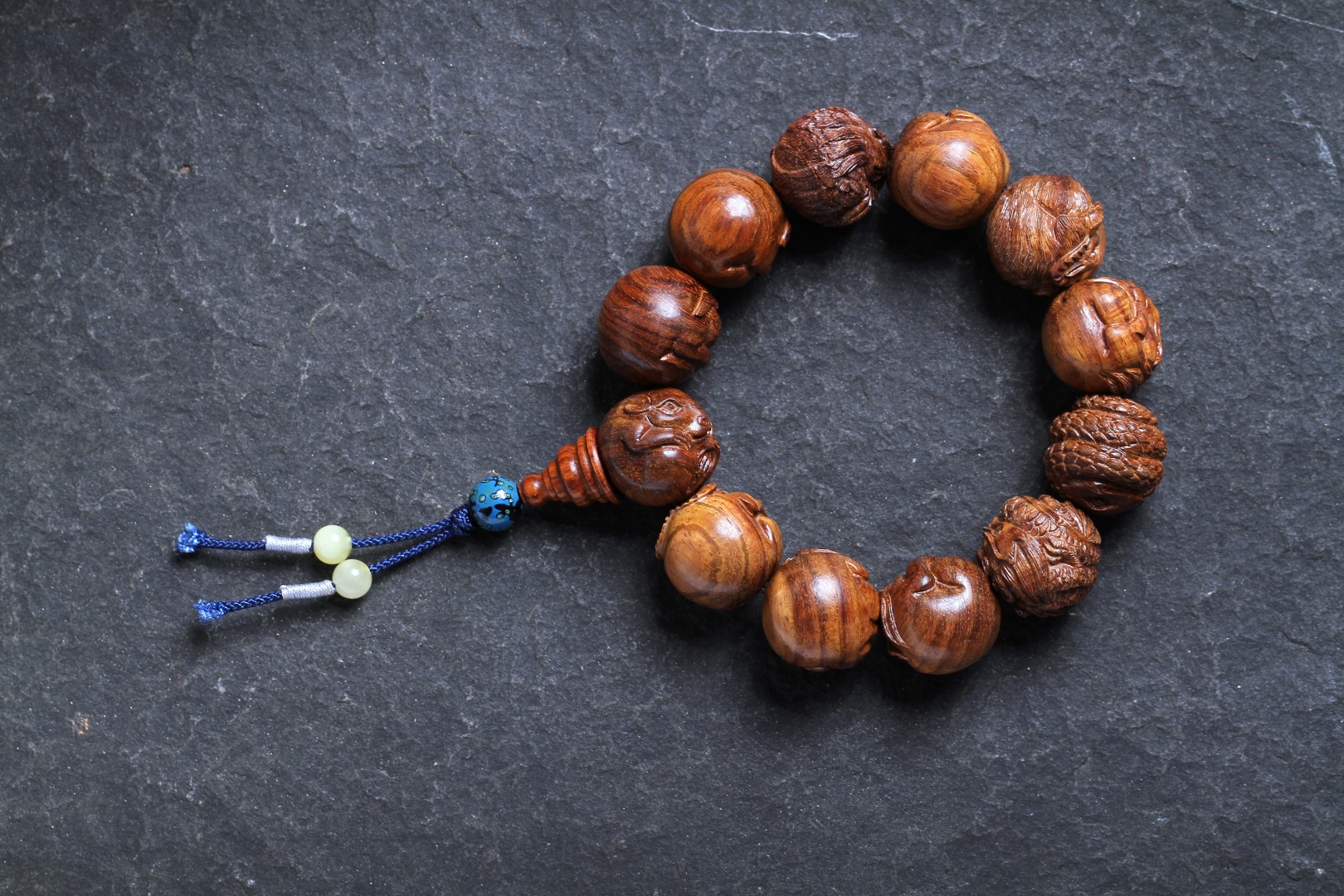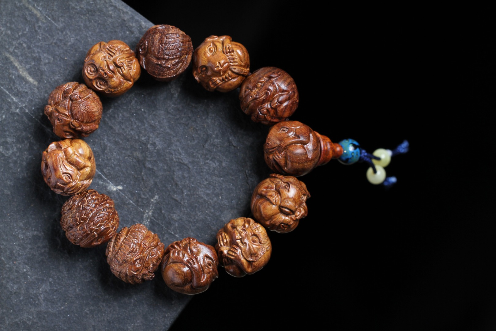 搭配:以海南黄花梨为主,精雕花梨十二生肖搭原矿蜜蜡及非遗大漆珠