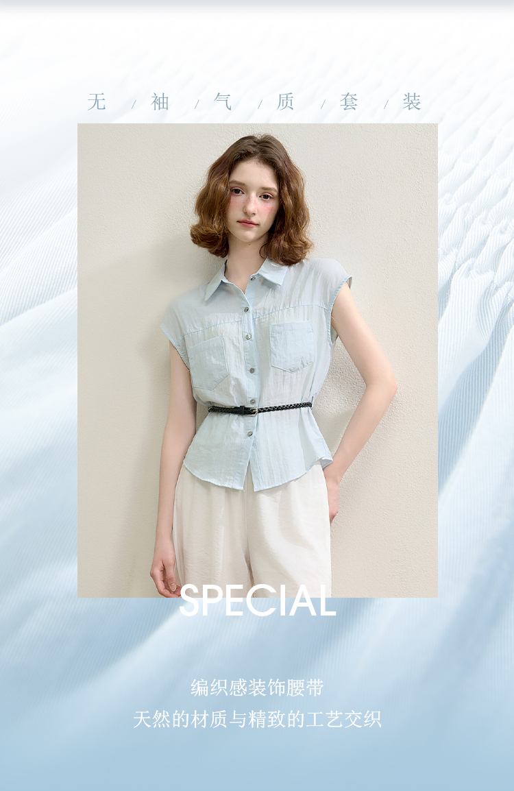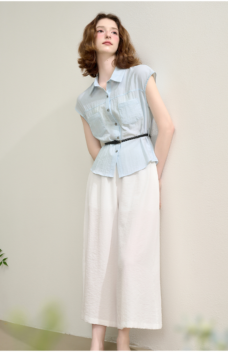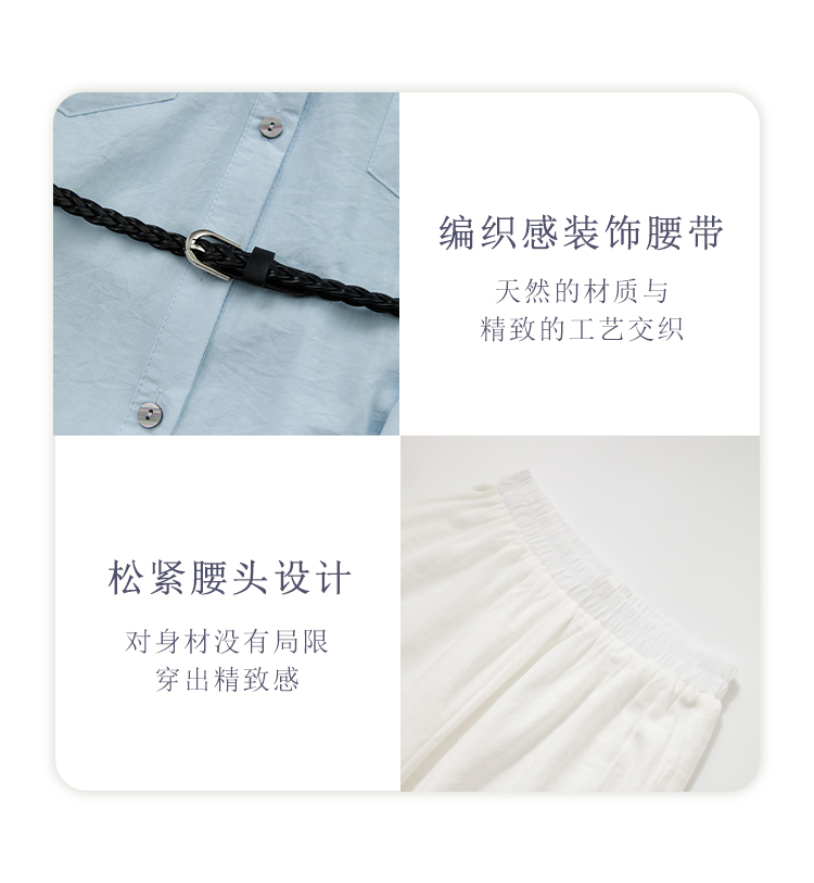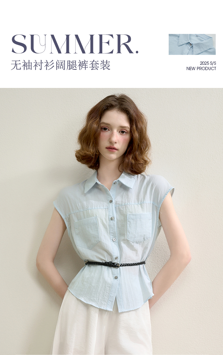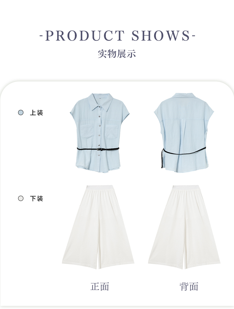 夏日清爽海盐风套装女夏季衬衫搭阔腿裤两件套配饰带H0051075