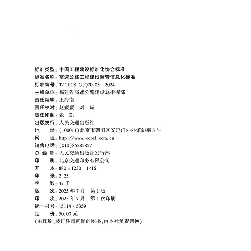 书名:高速公路工程建设监管信息化标准(T/CECS G:Q70-03—2024)