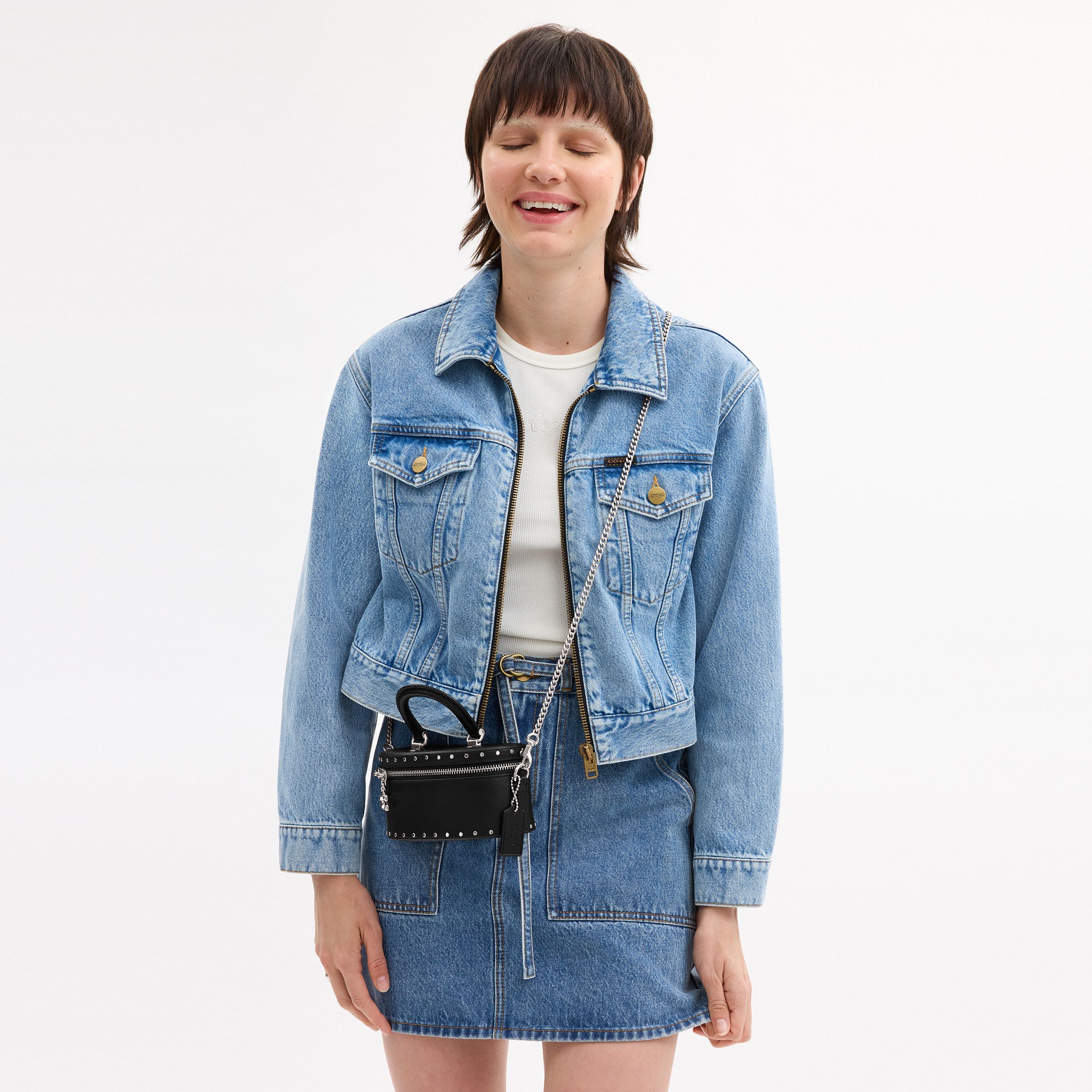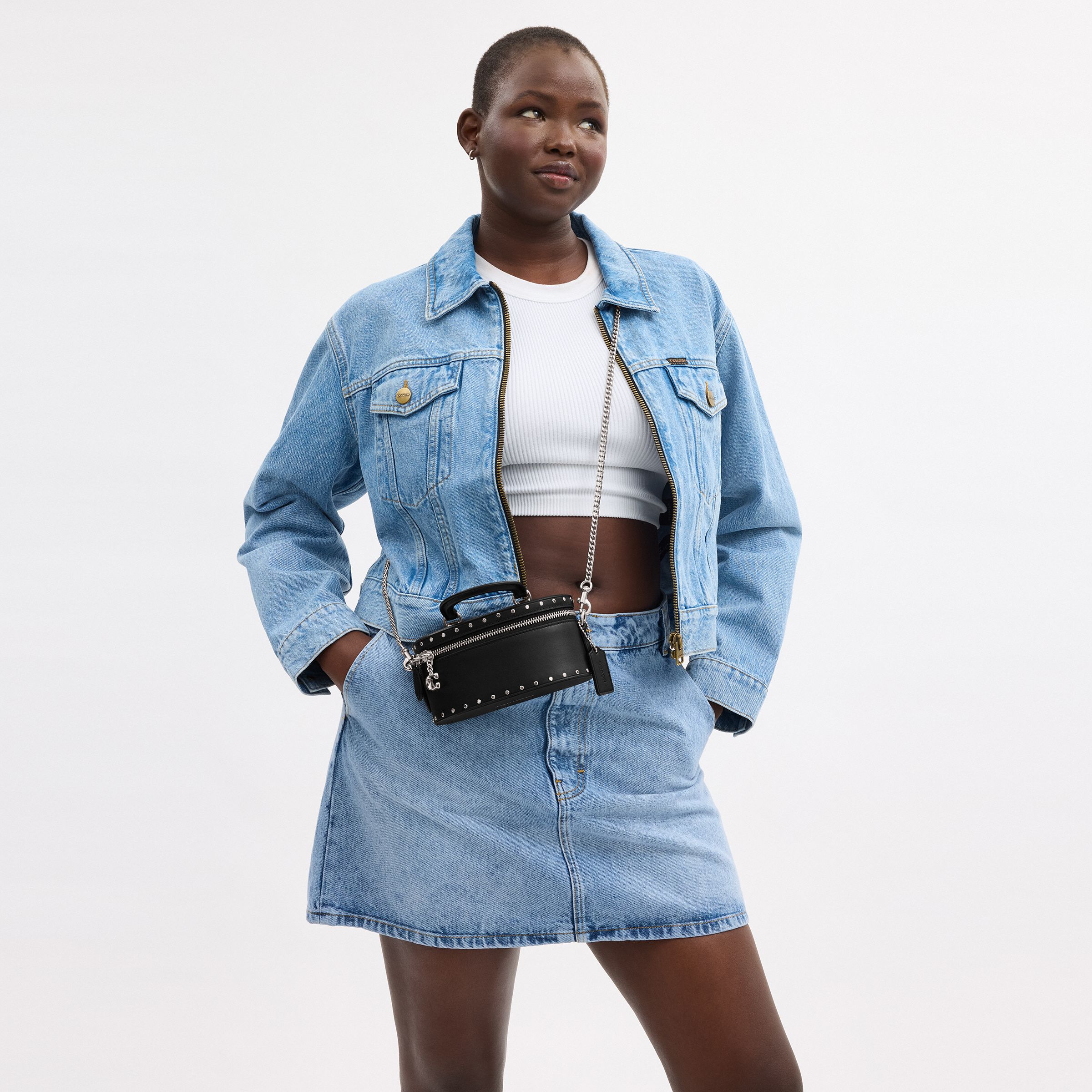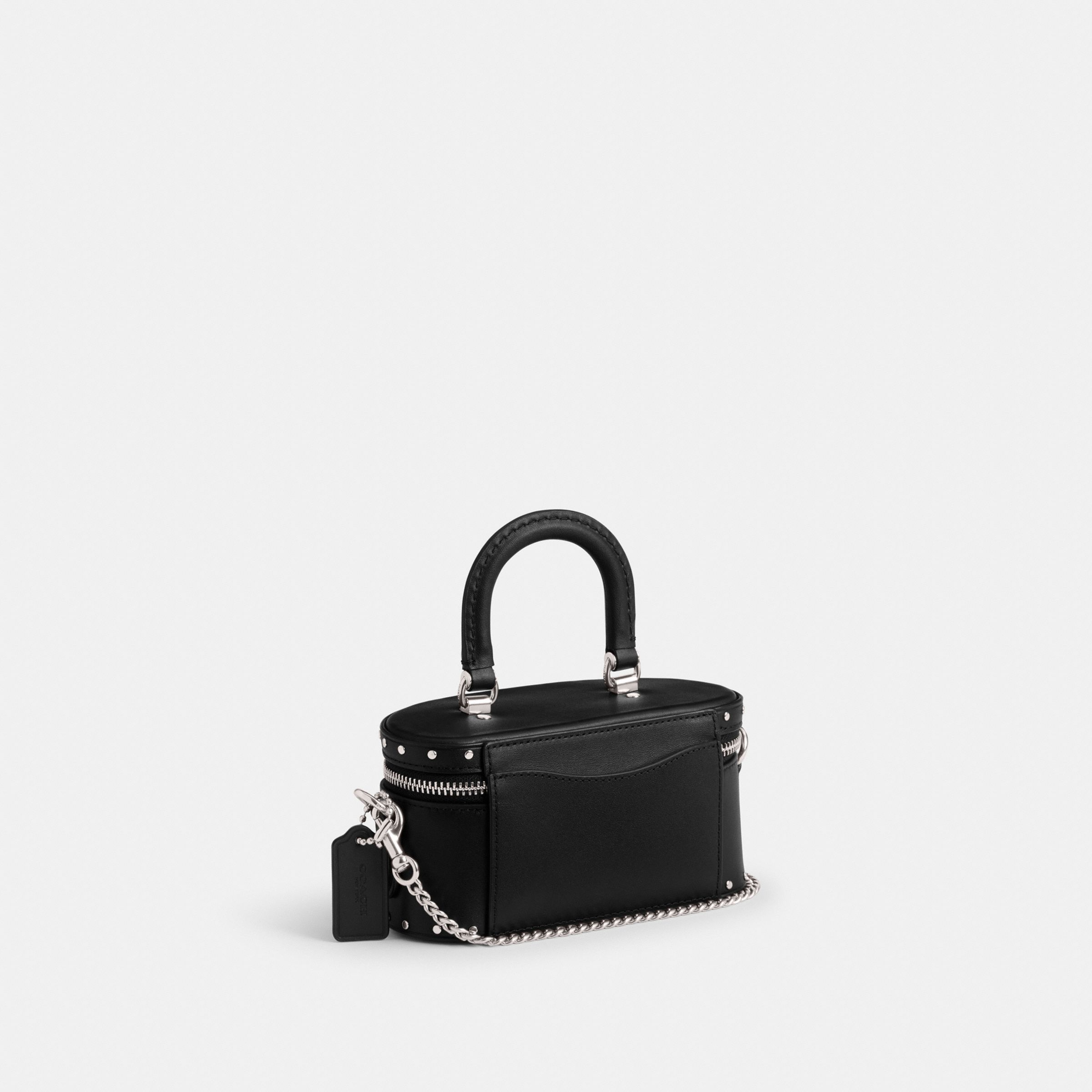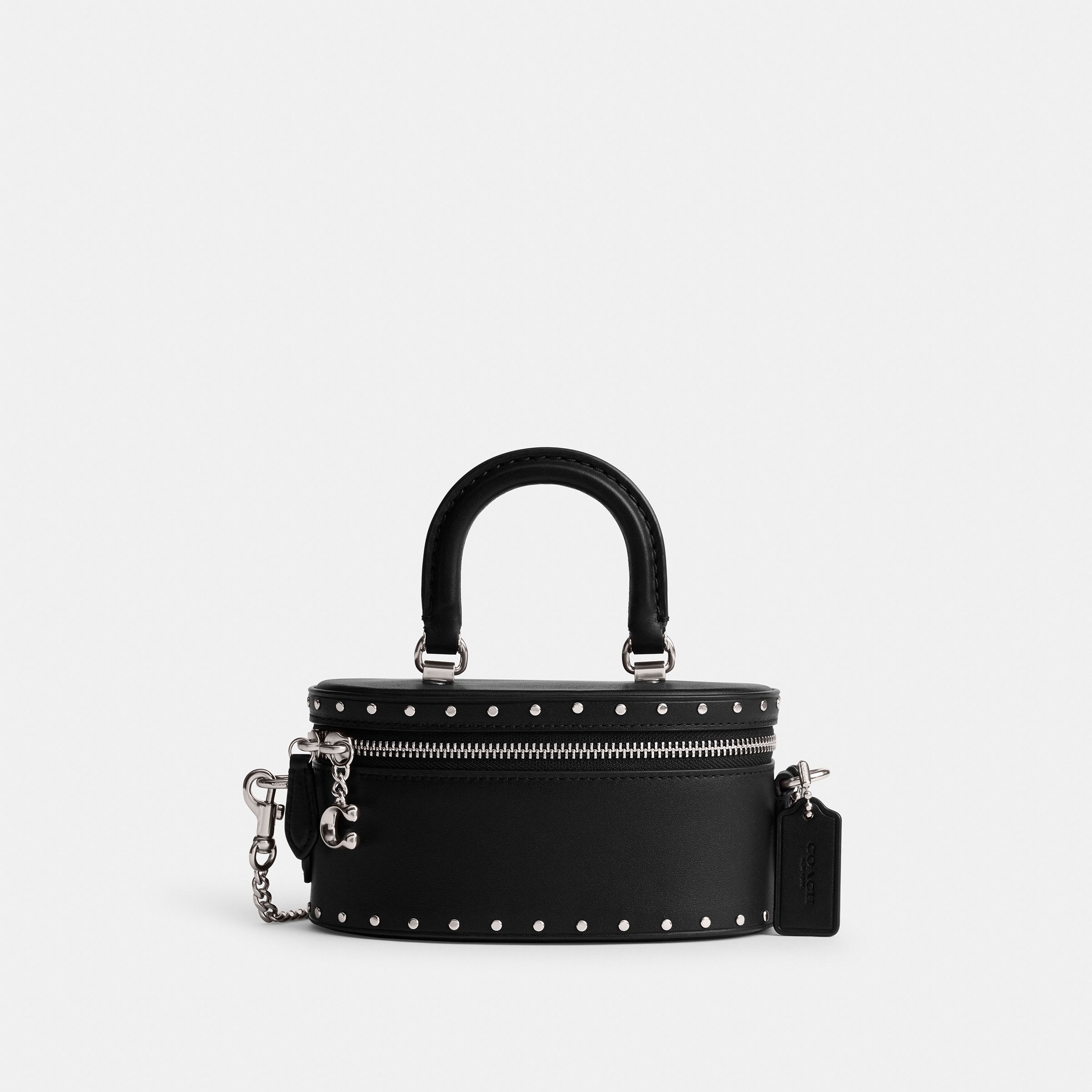 牛皮革 顶部提手拉链开合 铆钉装饰环绕式拉链开合 C字双拉链 金属链条肩带