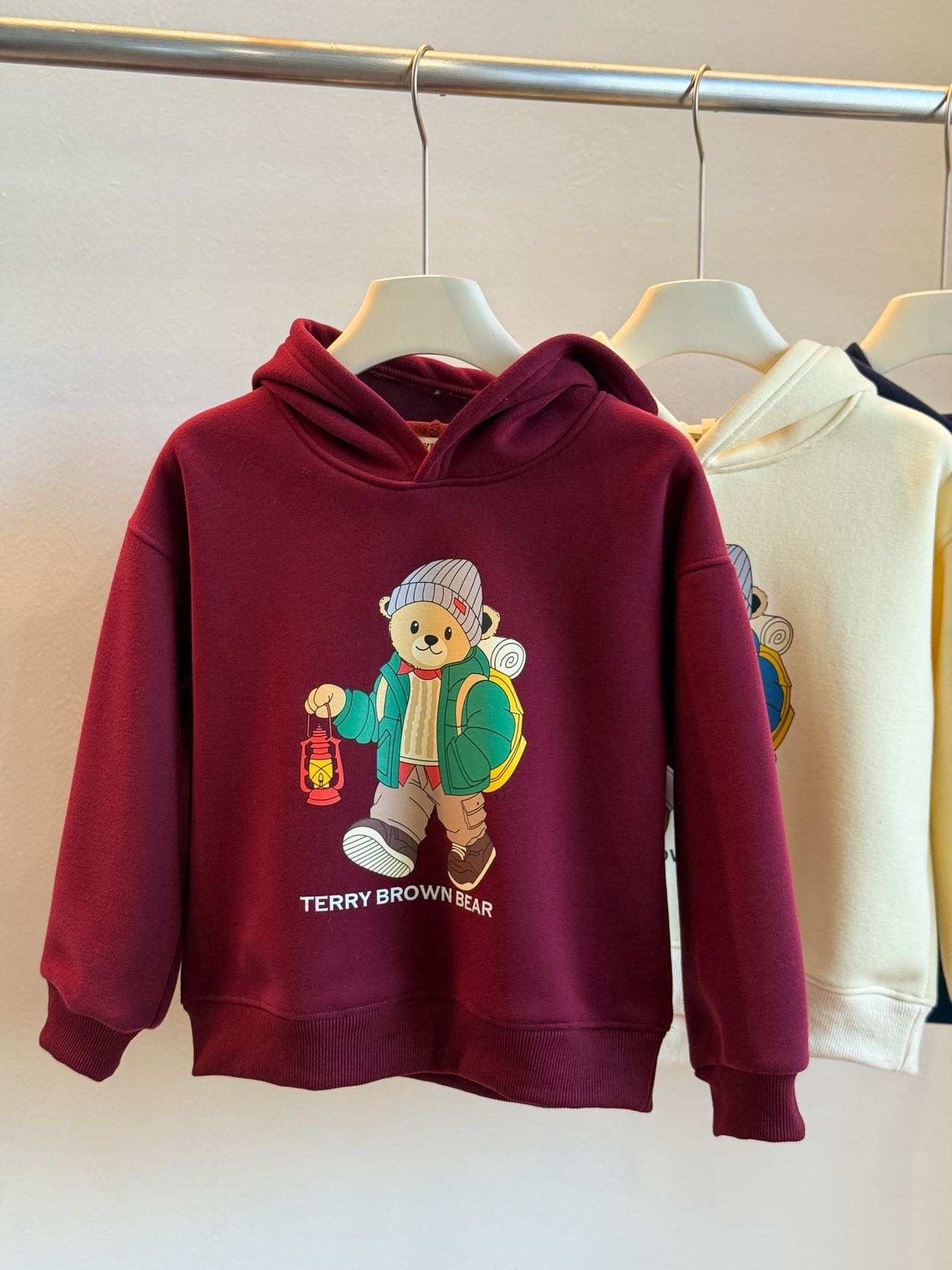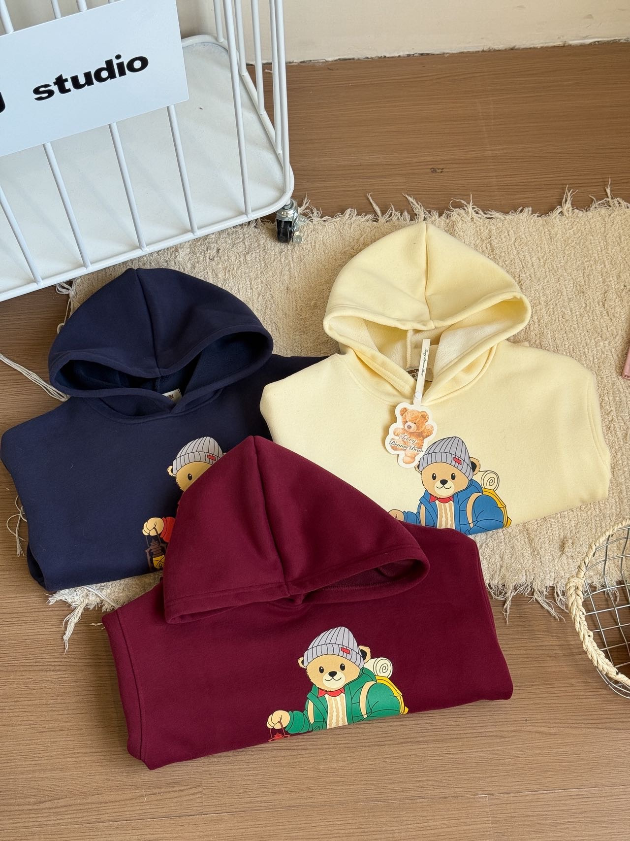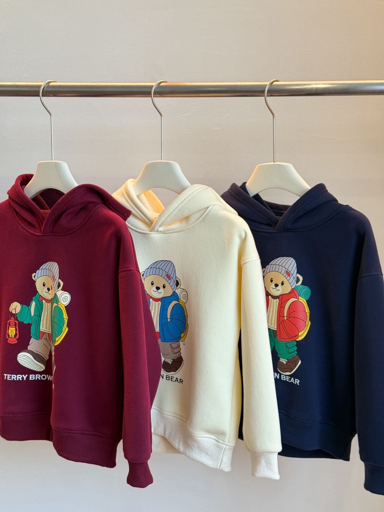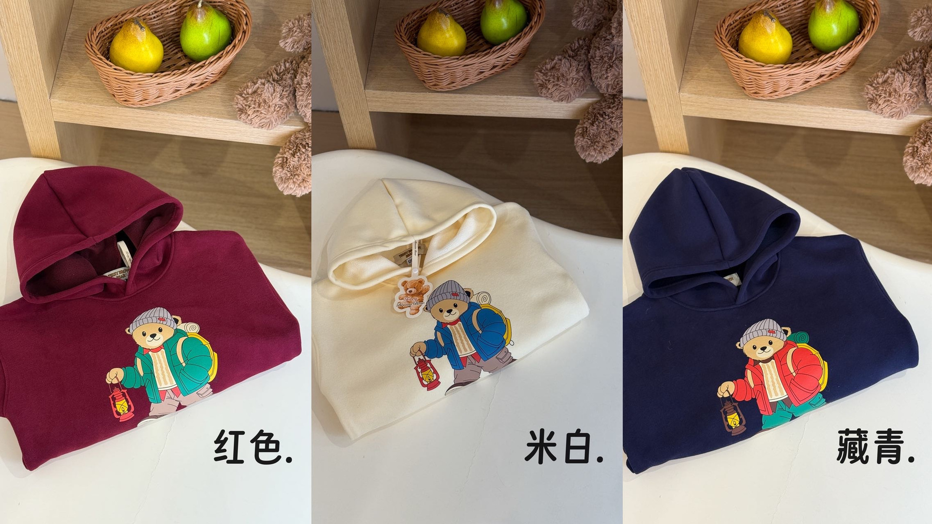 【保暖服饰 丨吾家 儿童小熊连帽卫衣】面料软糯亲肤,内里是复合一体加绒,穿洗不会分层,宽松基础款式,单穿叠穿都好看,搭配马甲也是不错的选择,三个颜色,男女生都能穿