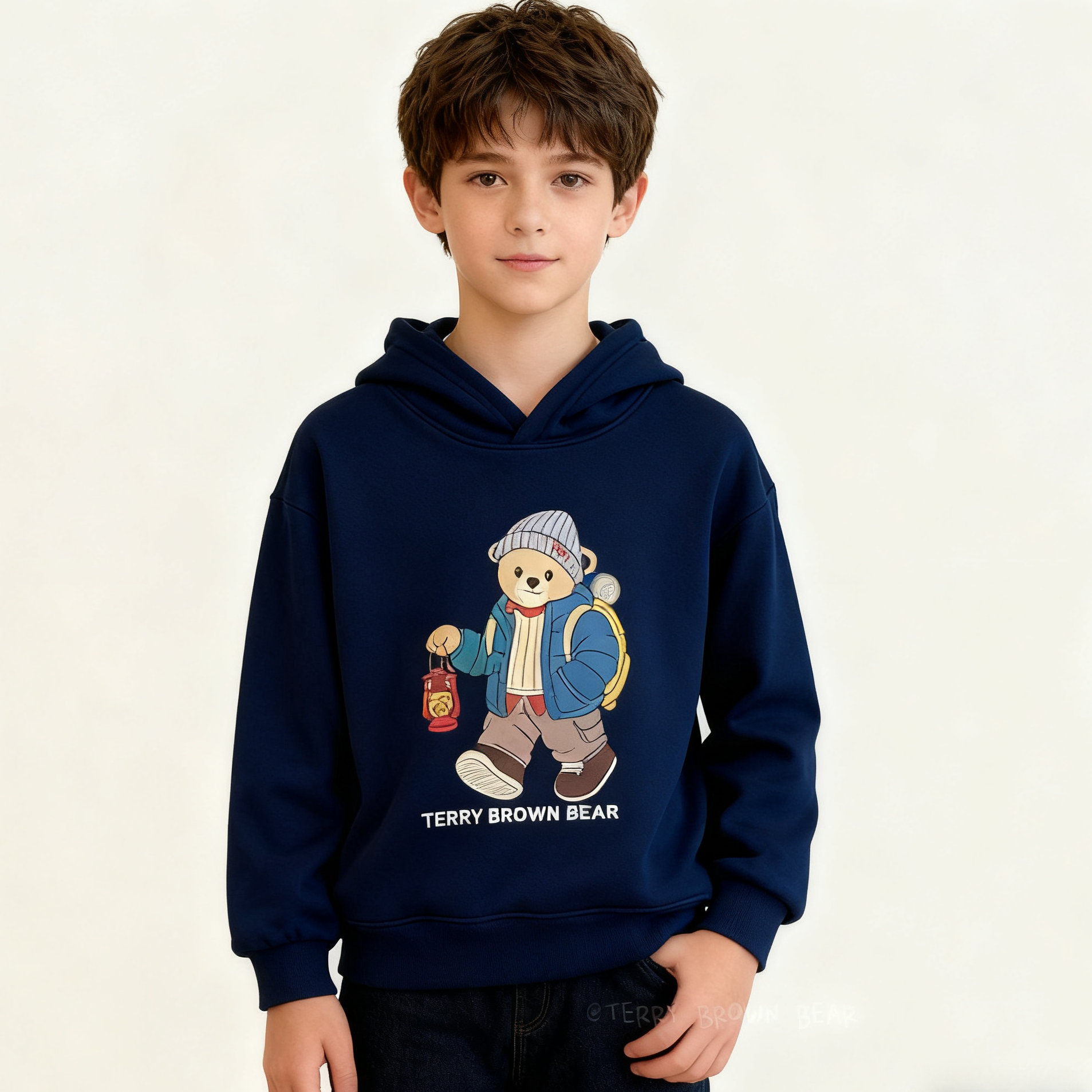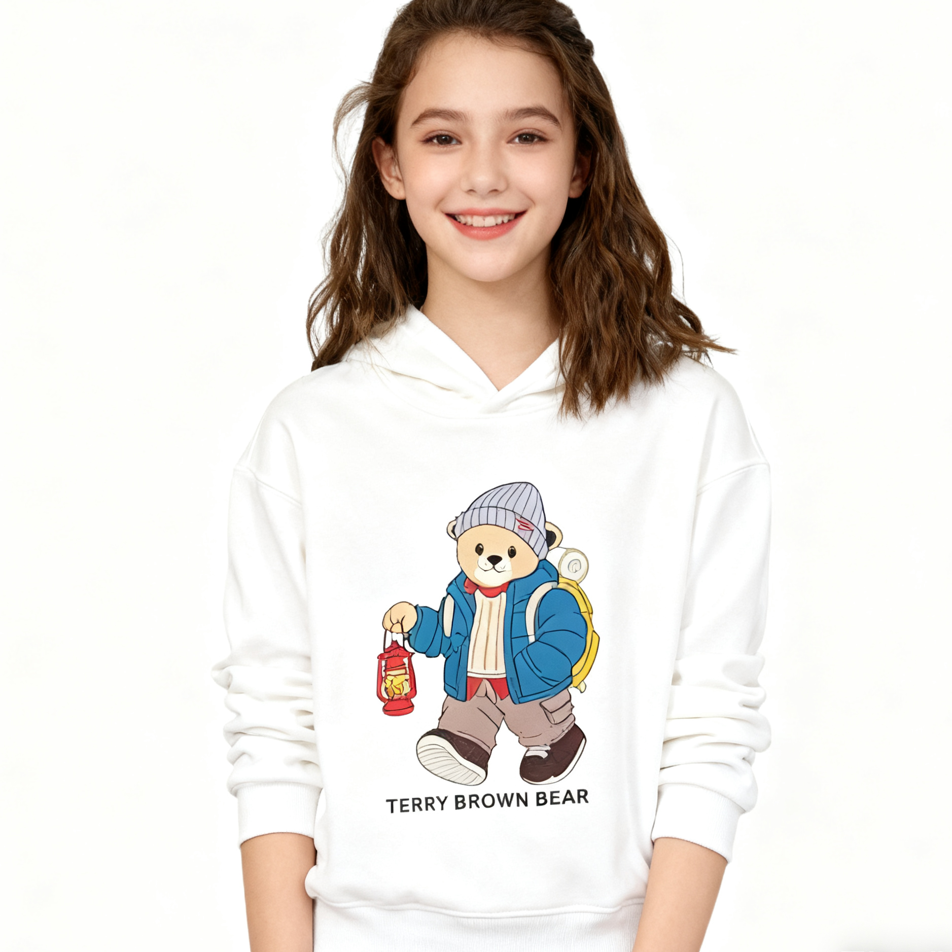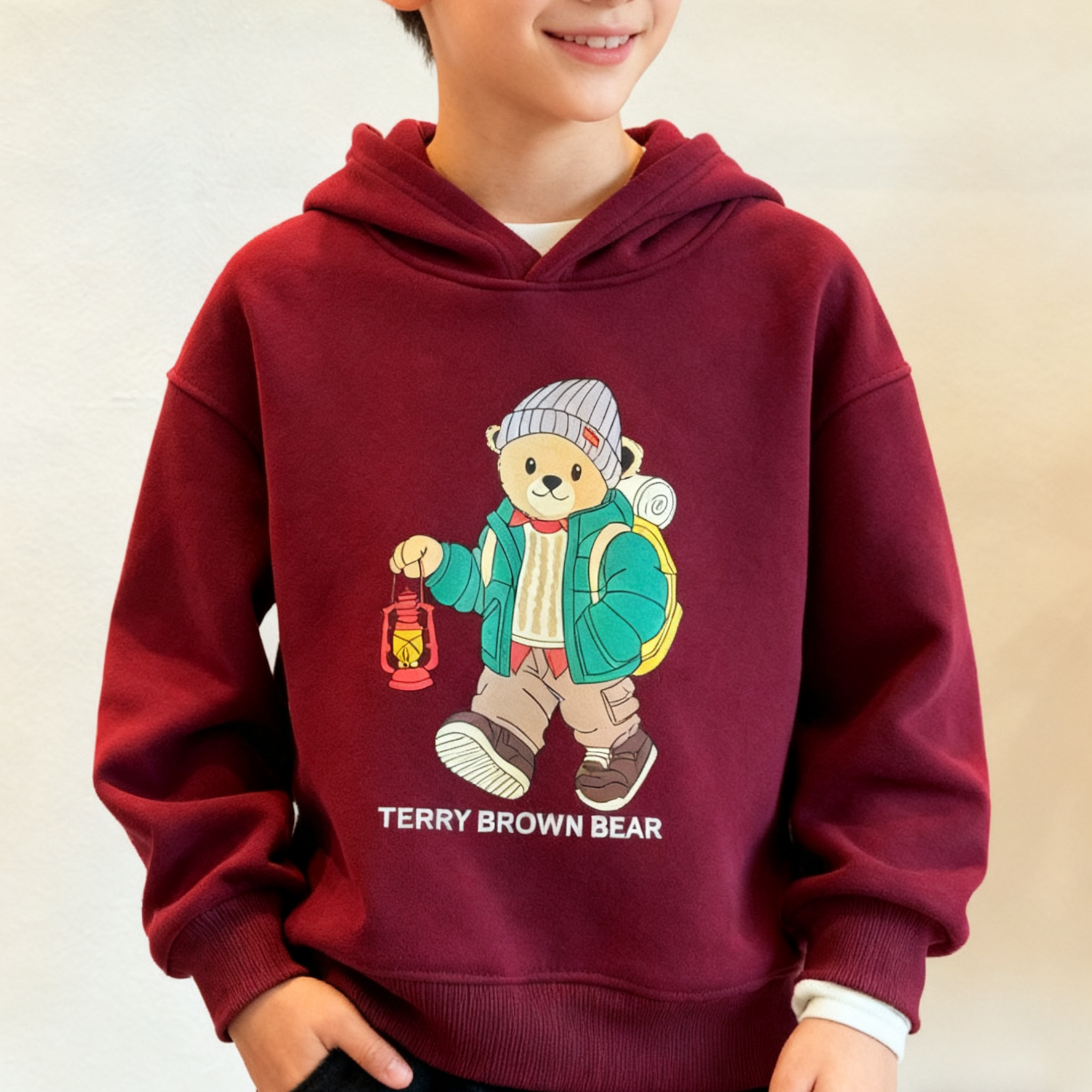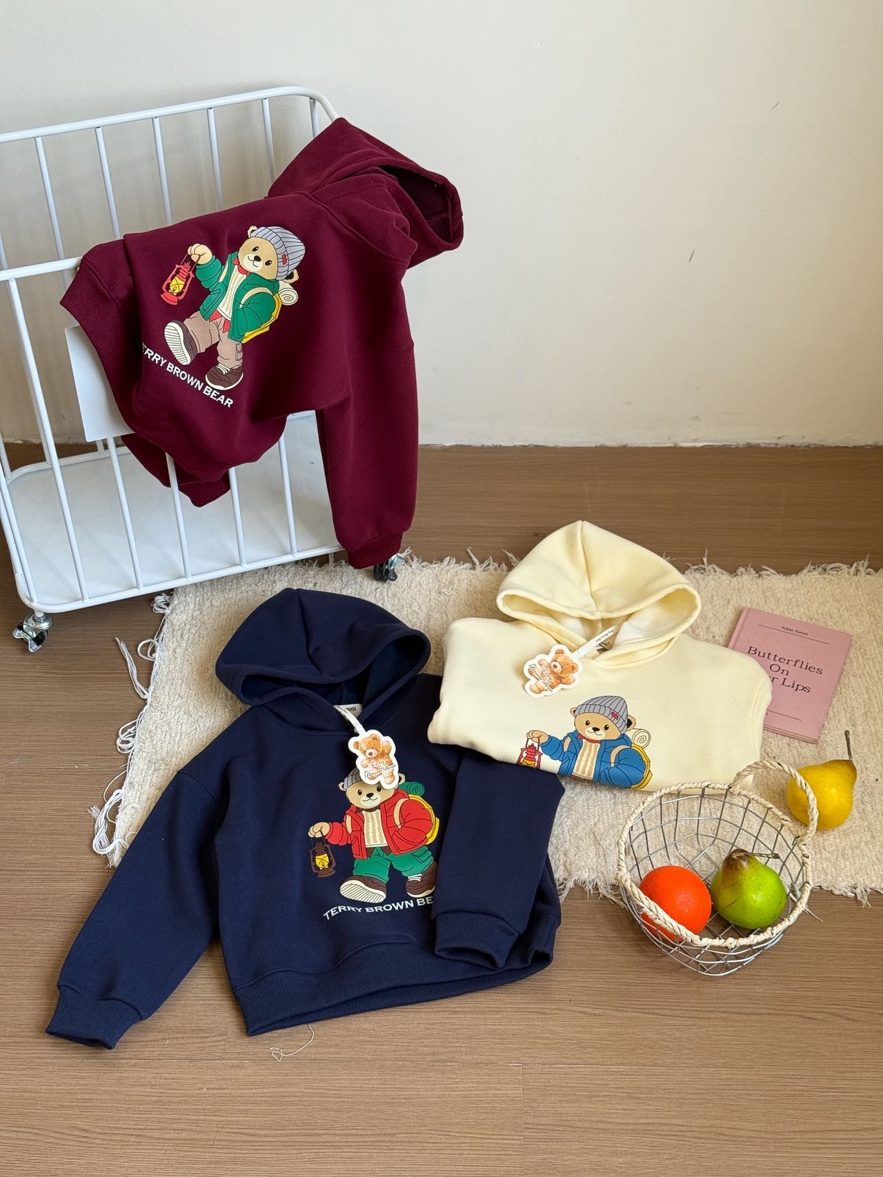 【保暖服饰 丨吾家 儿童小熊连帽卫衣】面料软糯亲肤,内里是复合一体加绒,穿洗不会分层,宽松基础款式,单穿叠穿都好看,搭配马甲也是不错的选择,三个颜色,男女生都能穿