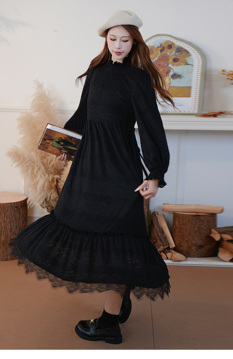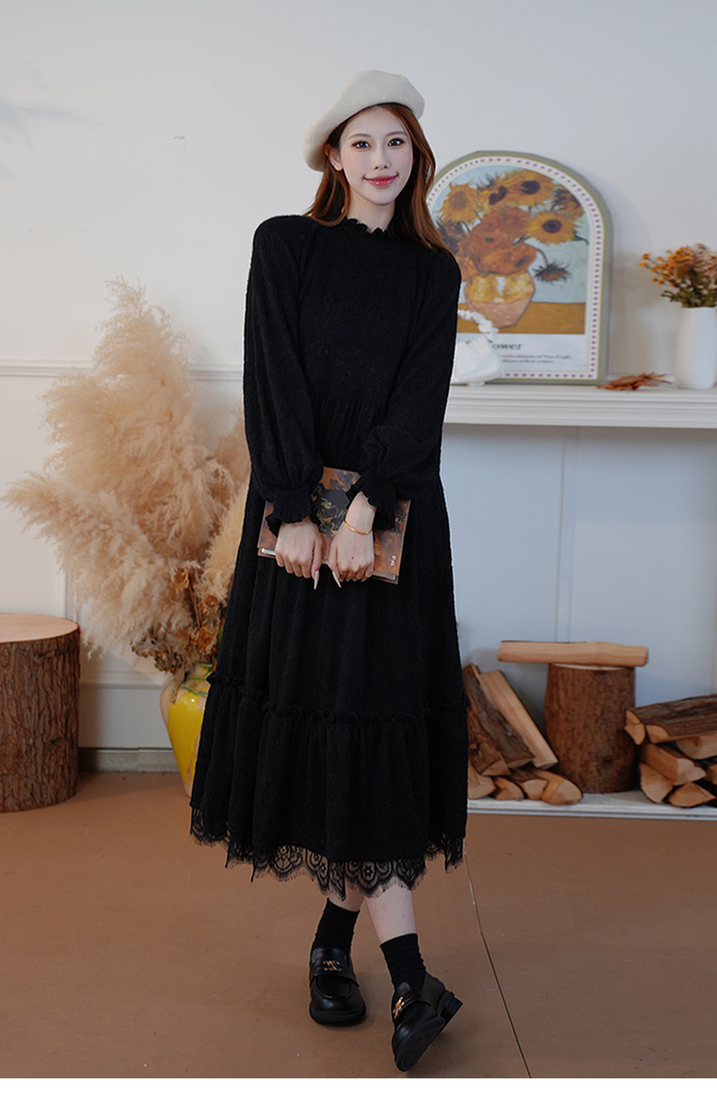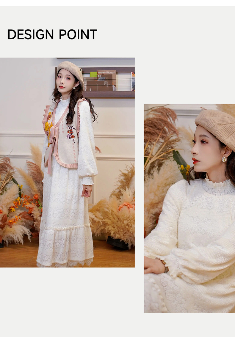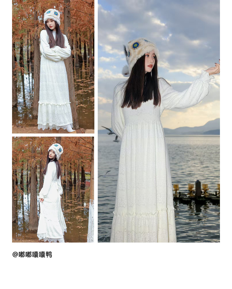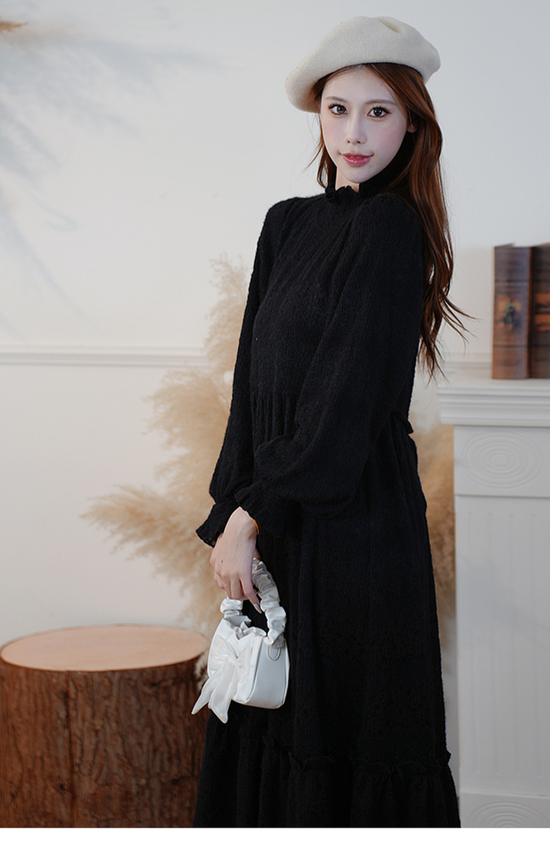 两三事 白雪公主 2024冬季新款甜美荷叶边高领花朵图案毛绒连衣裙