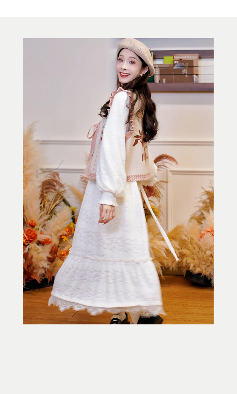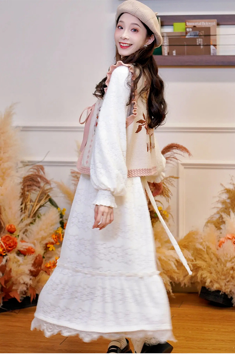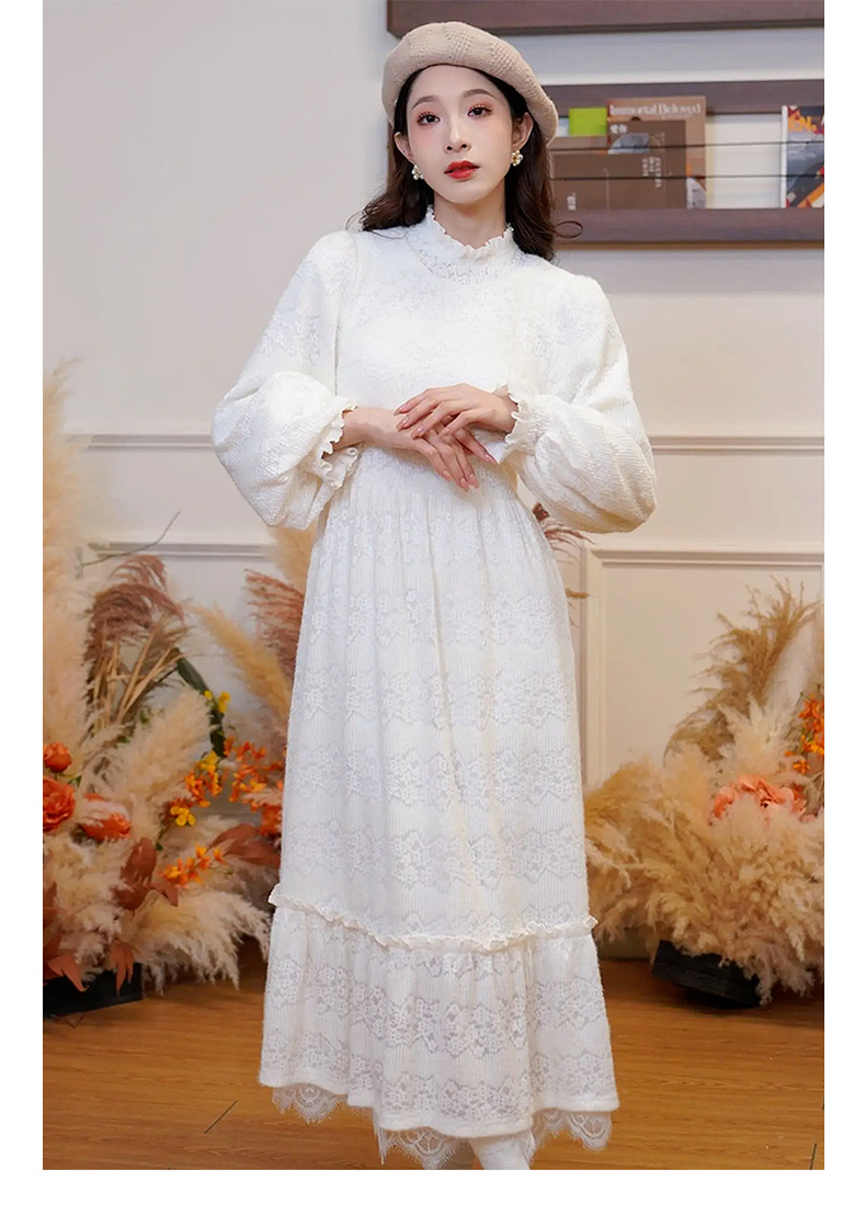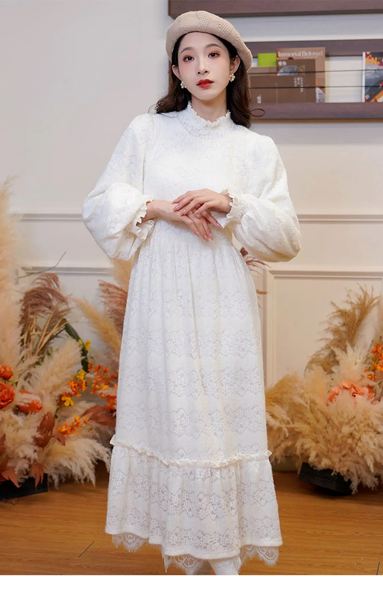 两三事 白雪公主 2024冬季新款甜美荷叶边高领花朵图案毛绒连衣裙