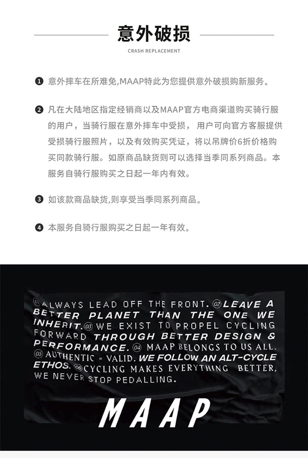 - MAAP作为澳洲功能性骑行服,其出色的时尚设计元素为骑行生活增添色彩。MAAP在为专业车手提升性能表现方面也毫不妥协。