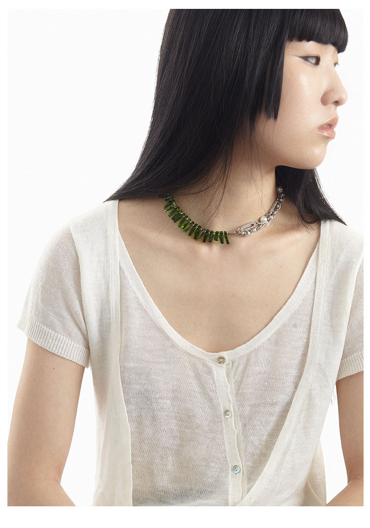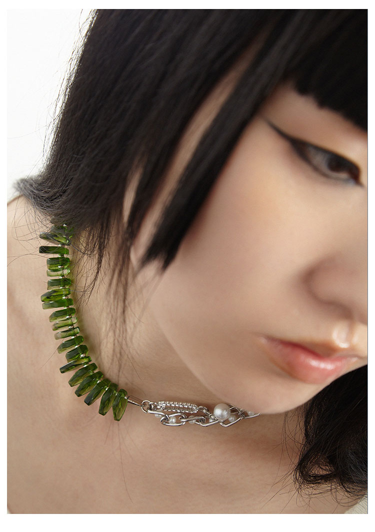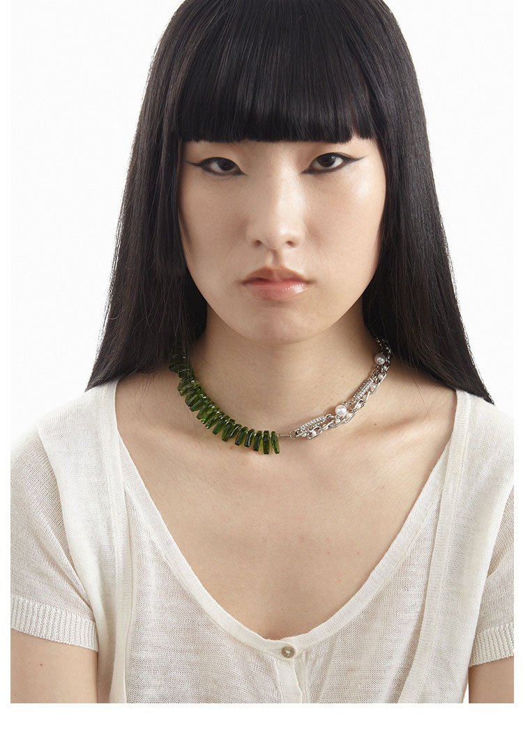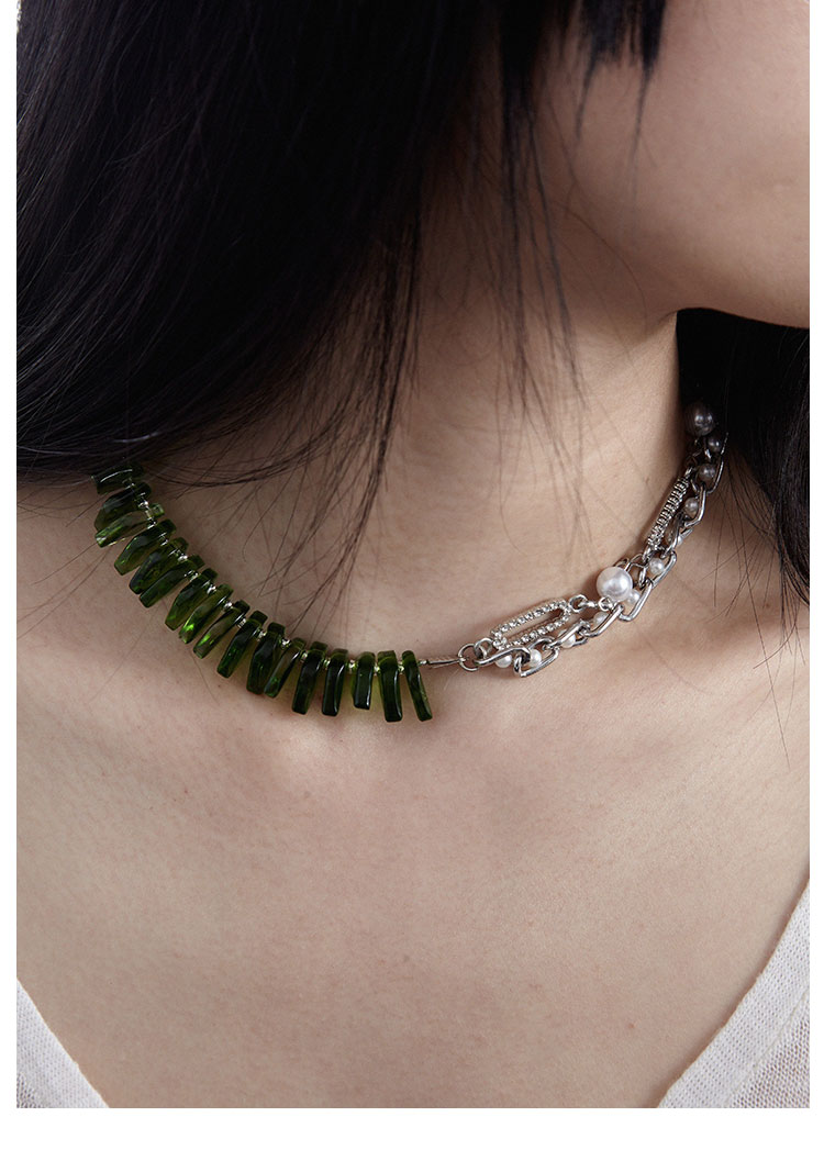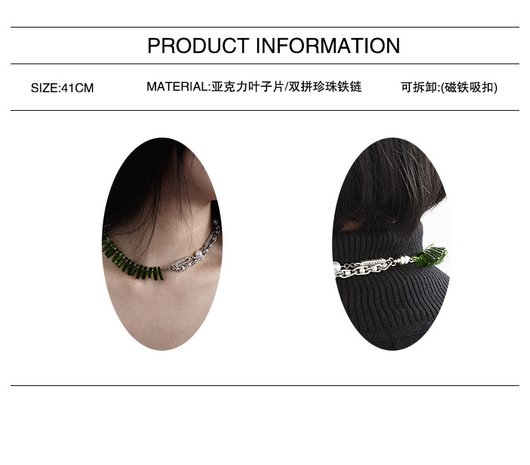 QZC2000 时装亚克力叶子拼接珍珠镶钻珠铁链磁铁吸扣项链男女饰品