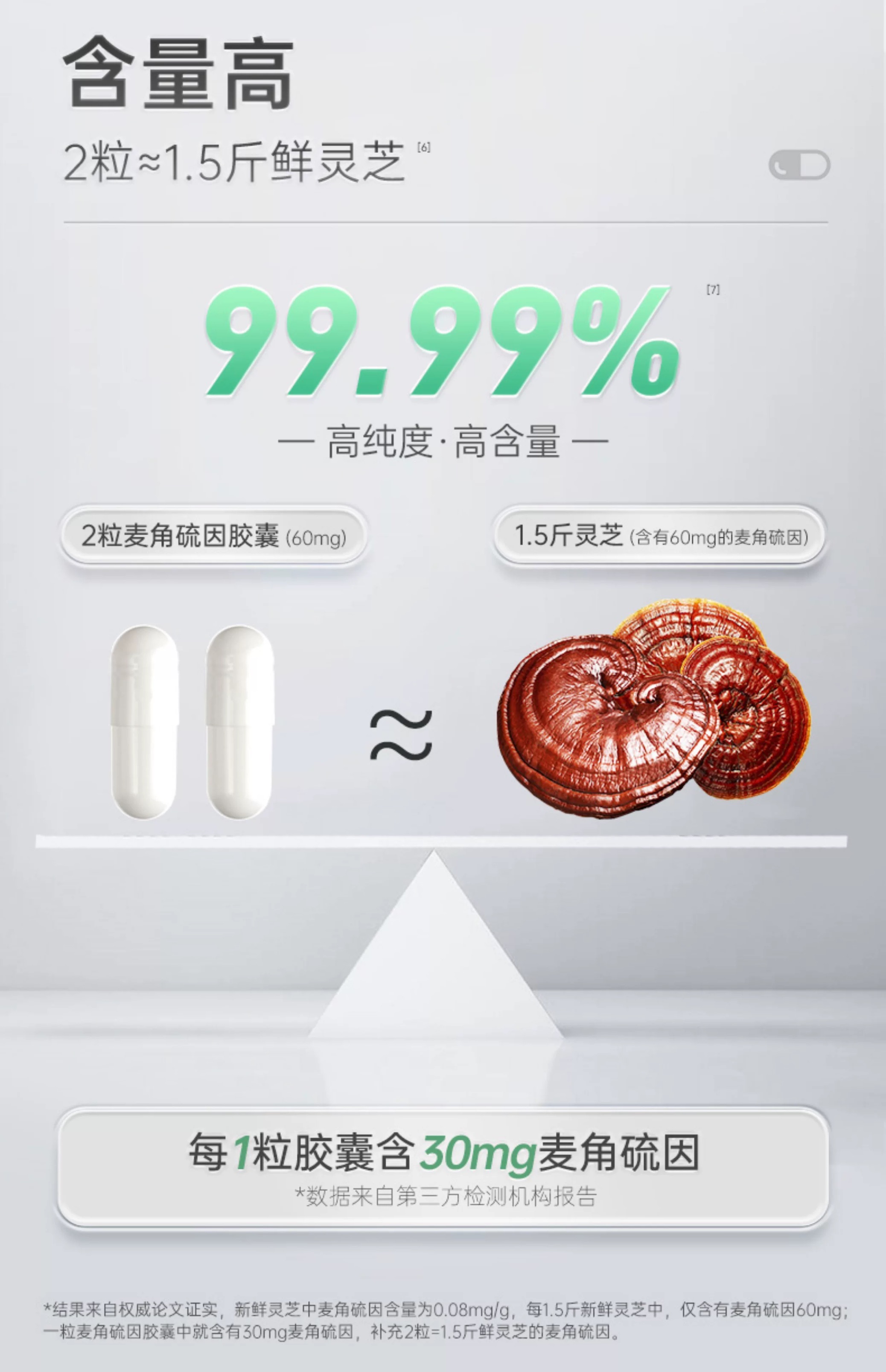 仅三麦角硫因口服胶囊 美国进口99.99%高纯度 2粒~1.5斤灵芝 ,抗衰逆龄新选择 内调外养 焕活精气