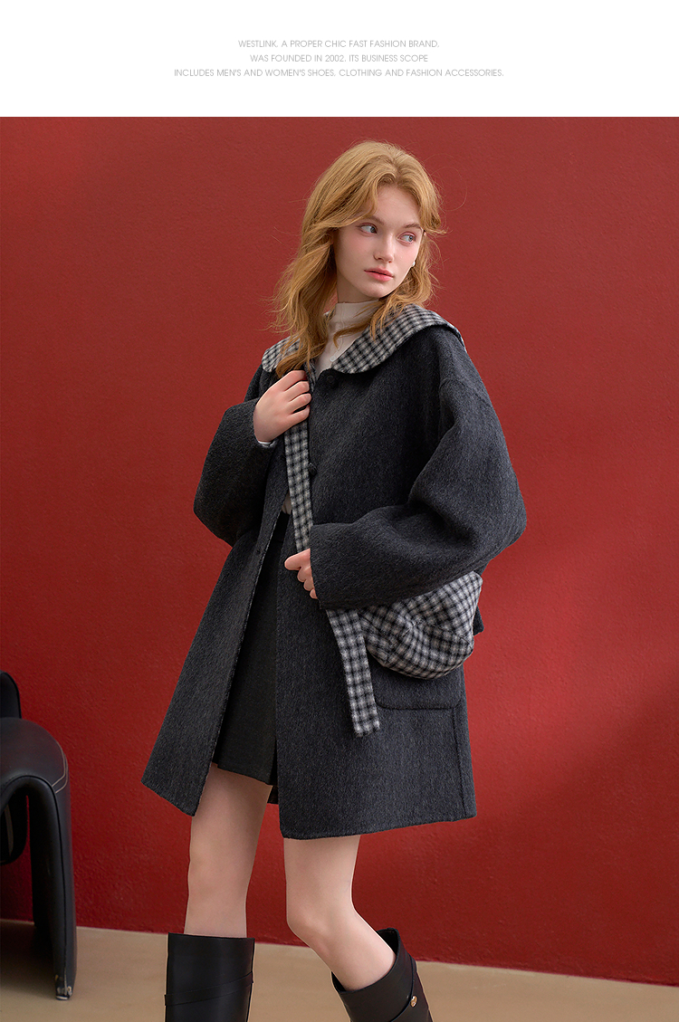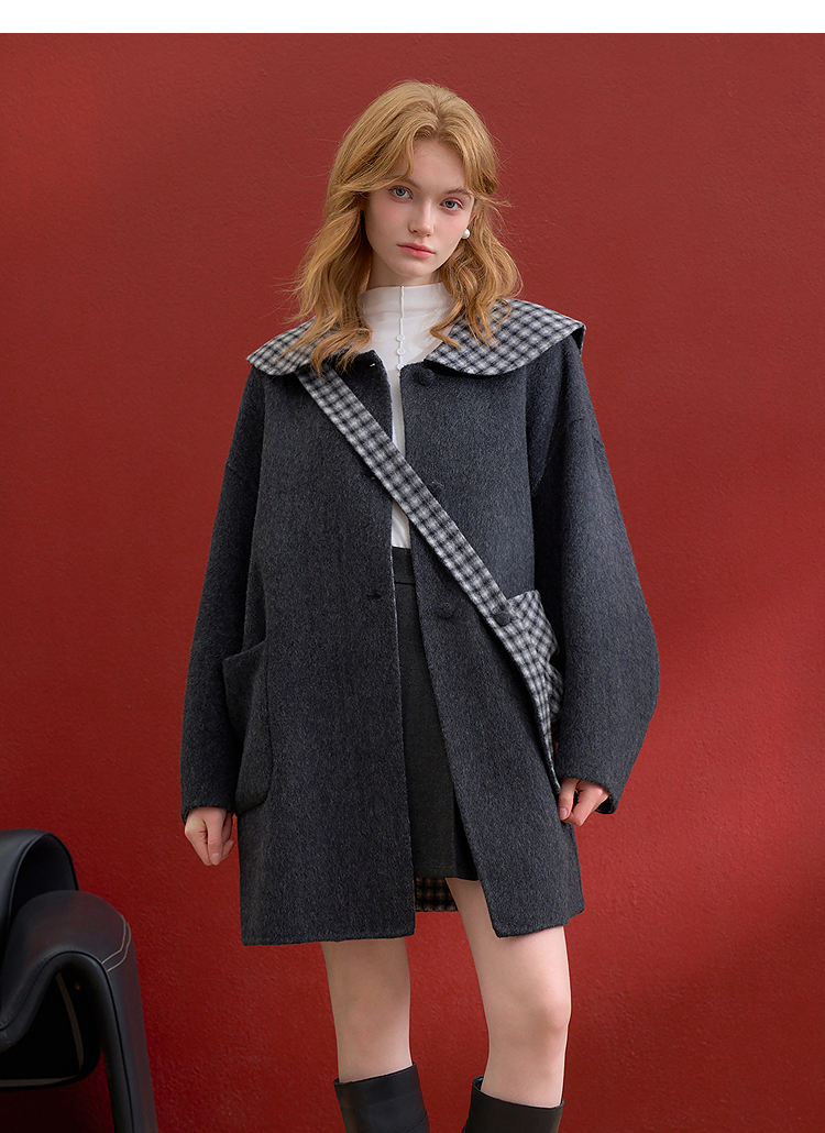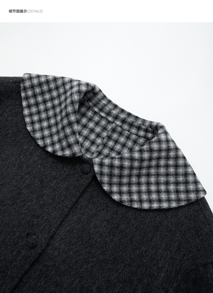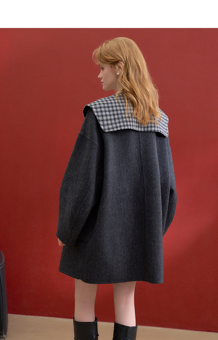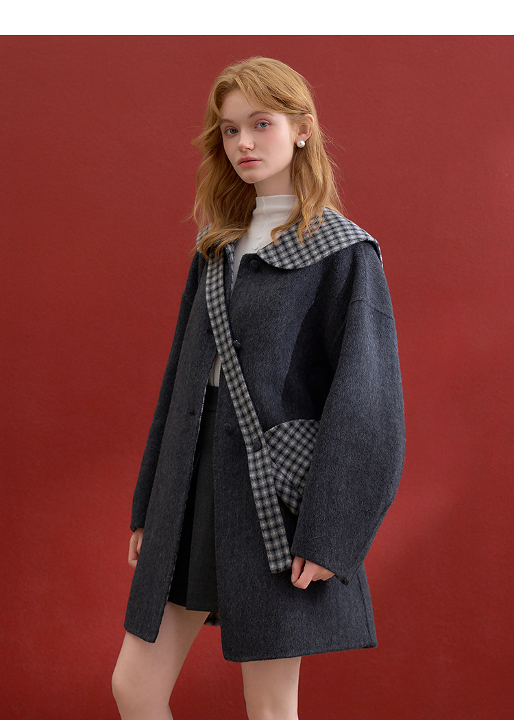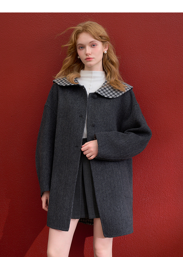 西遇减龄娃娃领双面呢毛呢外套女冬季复古撞色格纹呢子大衣H0055304
