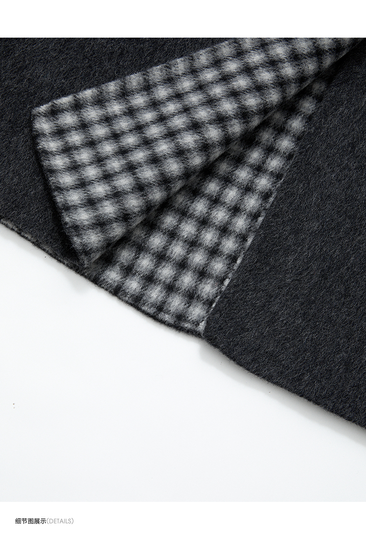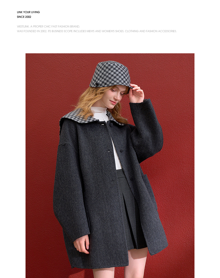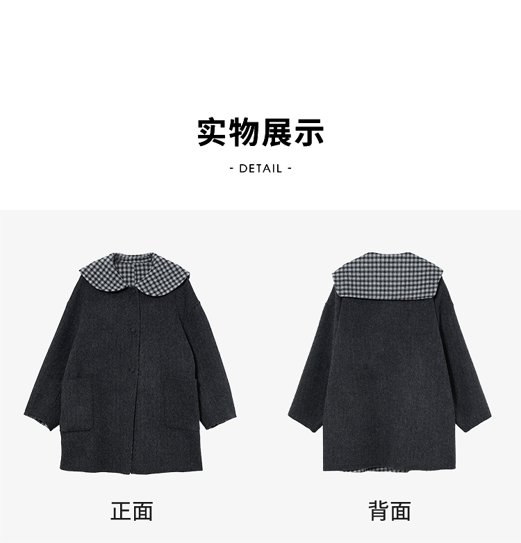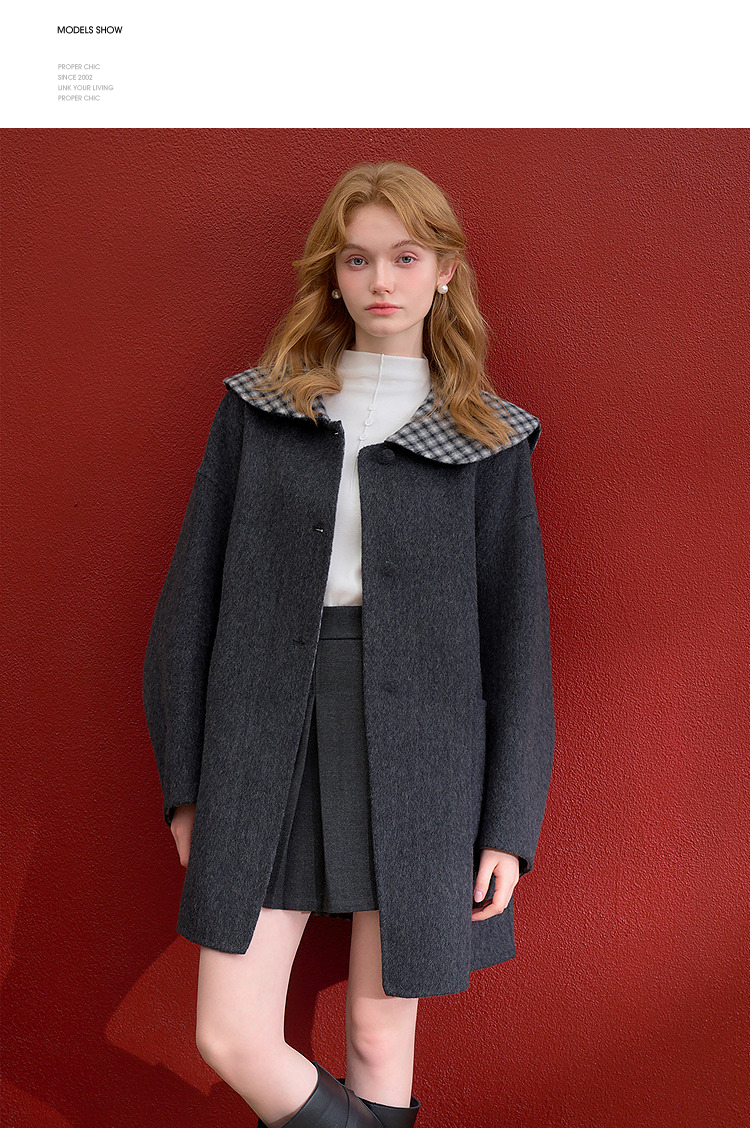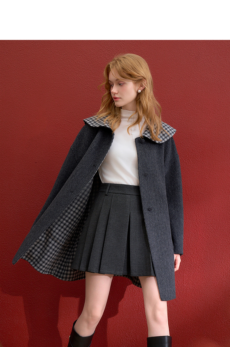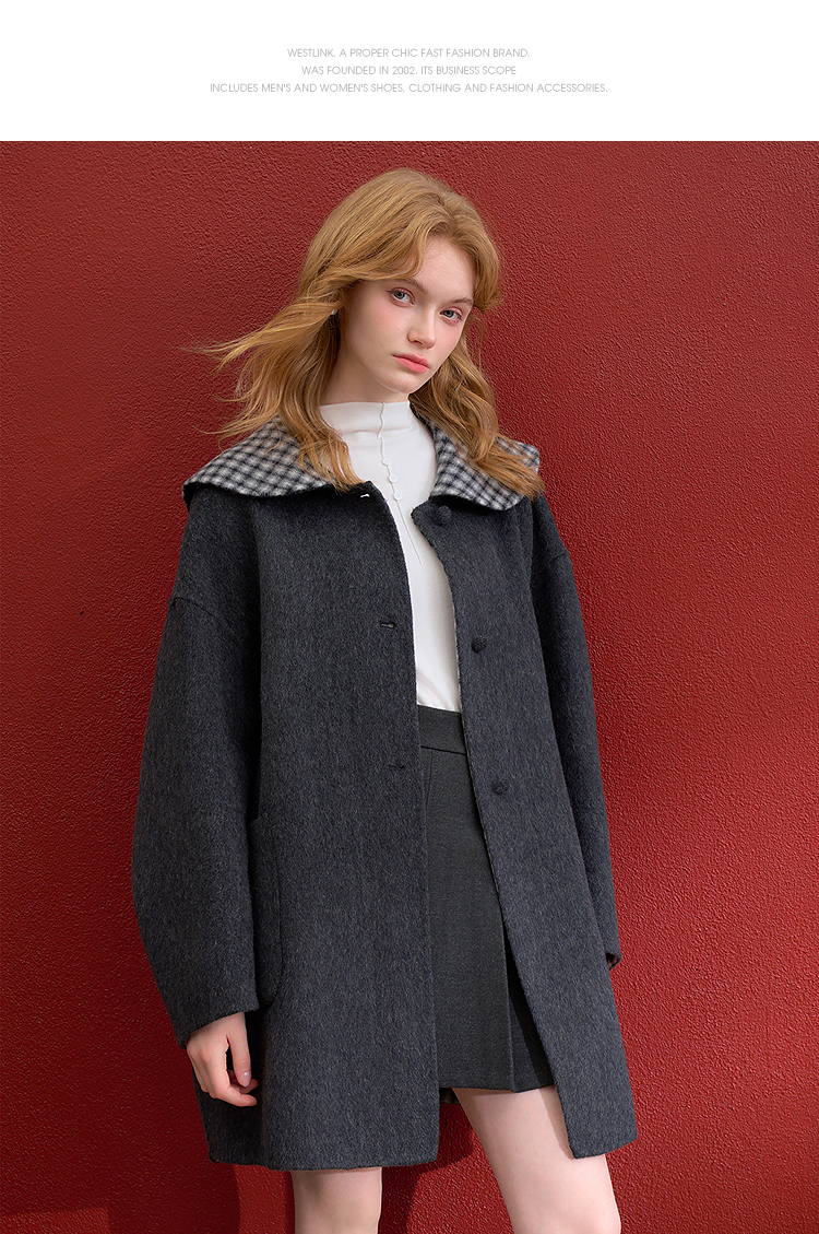 西遇减龄娃娃领双面呢毛呢外套女冬季复古撞色格纹呢子大衣H0055304