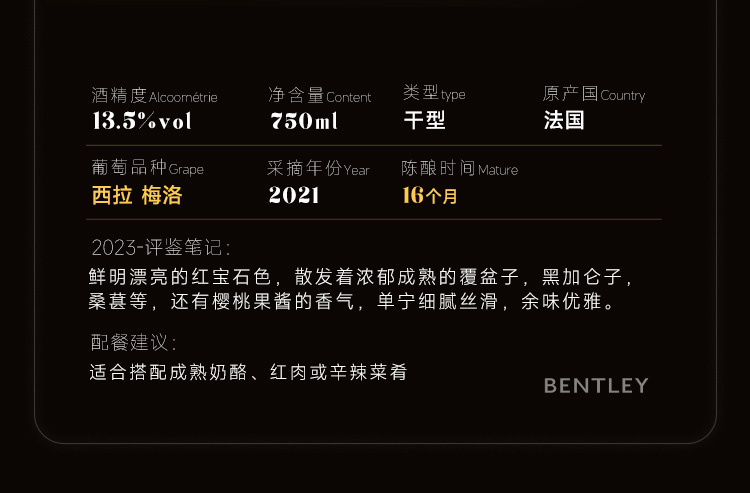 【宾利集团荣誉产品】宾利BENTLEY珍藏级65 法国总统府接待用酒 法国进口 13.5%vol