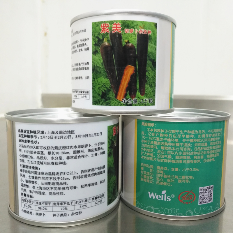 出苗后约80天即可收获的紫皮橙红肉水果胡萝卜。生长势中等,叶片部分紫茎,根长18-20cm,圆锥形,表皮紫黑色,心柱橙红色。品质好,水分足,非常适合榨汁、生食。储藏性佳,在长江流域可以春秋种植。