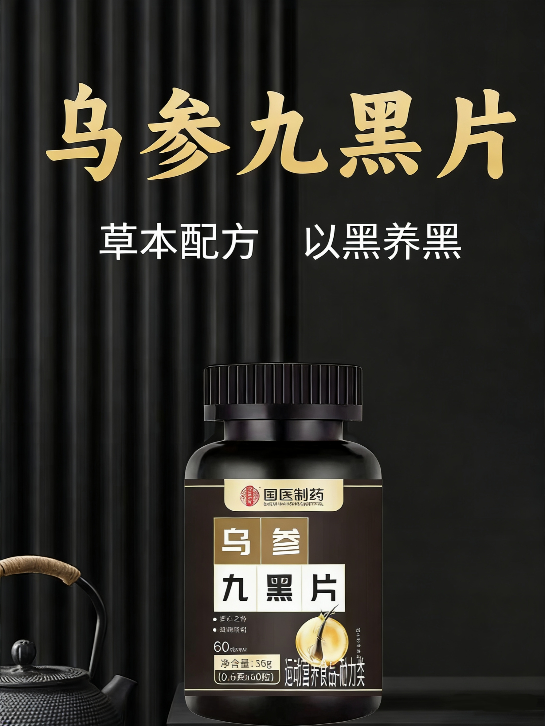 以黑养黑爆款!国医制药乌参九黑片 百年中医传承 古方乌根养发人参黑芝麻 养发以黑养黑药食滋补头发人参黑芝麻压片糖 草本养发黑发片 60片/瓶