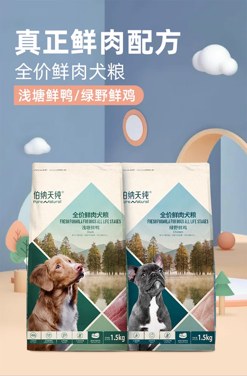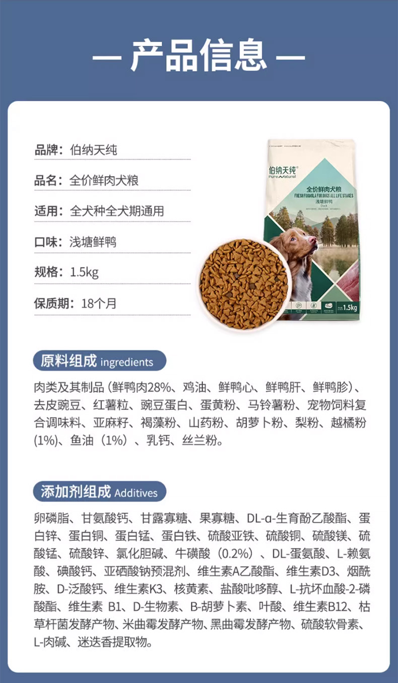 【鲜肉系列】伯纳天纯狗粮全犬种全犬期通用型狗粮鸡肉鸭肉配方 呵护肠胃 1.5kg
