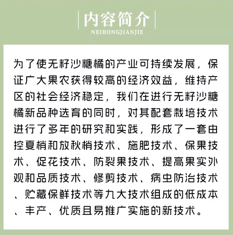 种植无籽沙糖橘必备的“三强”图书。专业性强——经验丰富的专家教授倾力写作;实践性强——可操作性强,照着做就有效果;针对性强——针对生产中突出的问题。提出解决对策,节本增效。