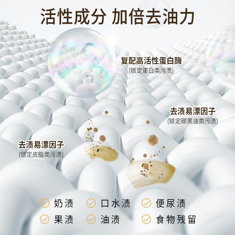 含复配活性蛋白酶,能够深层渗透衣物纤维,达到快速去污效用