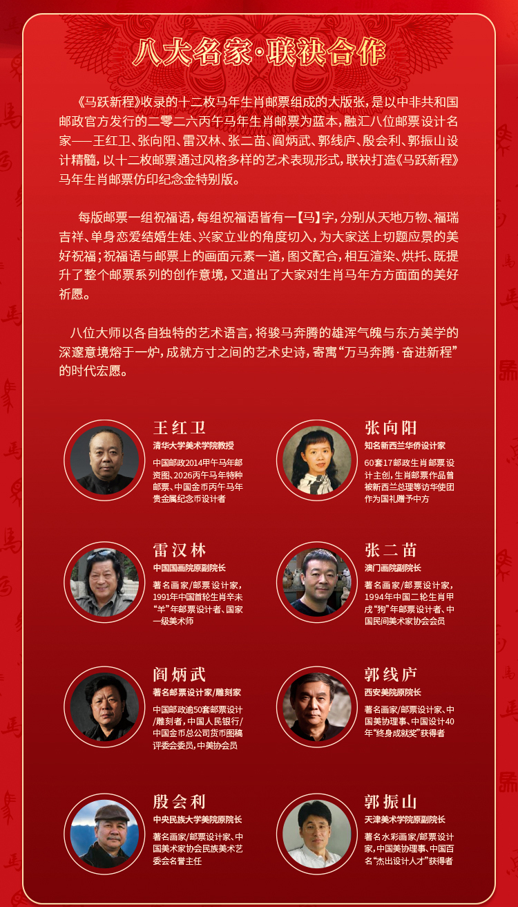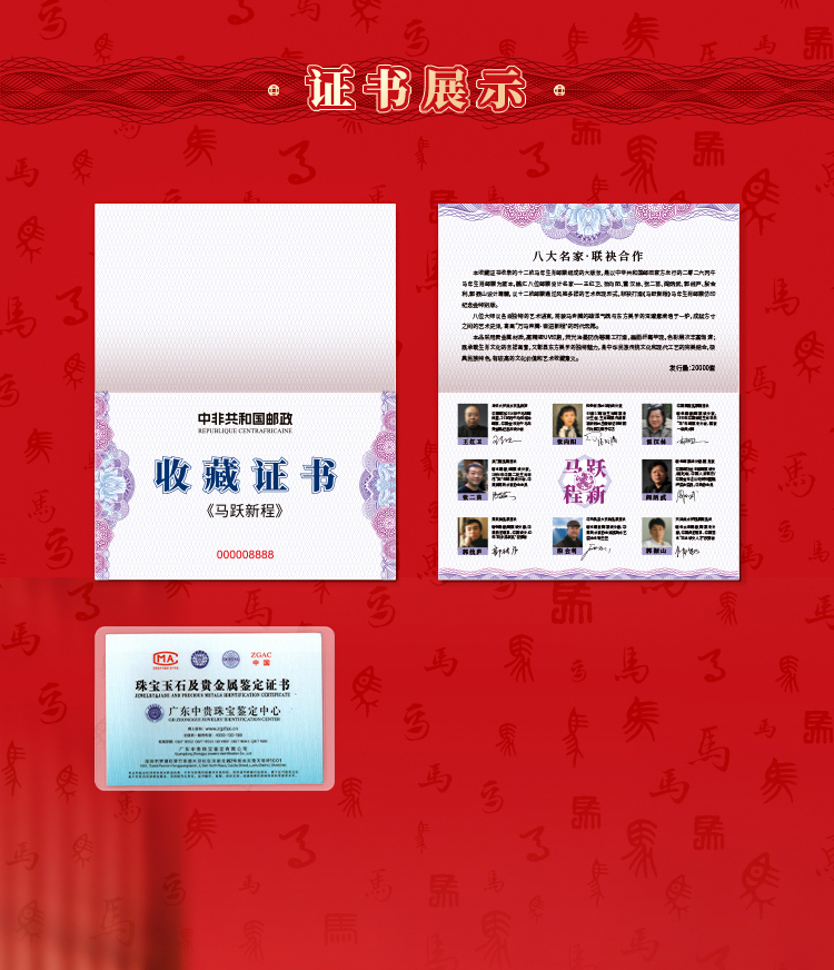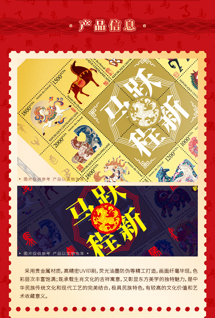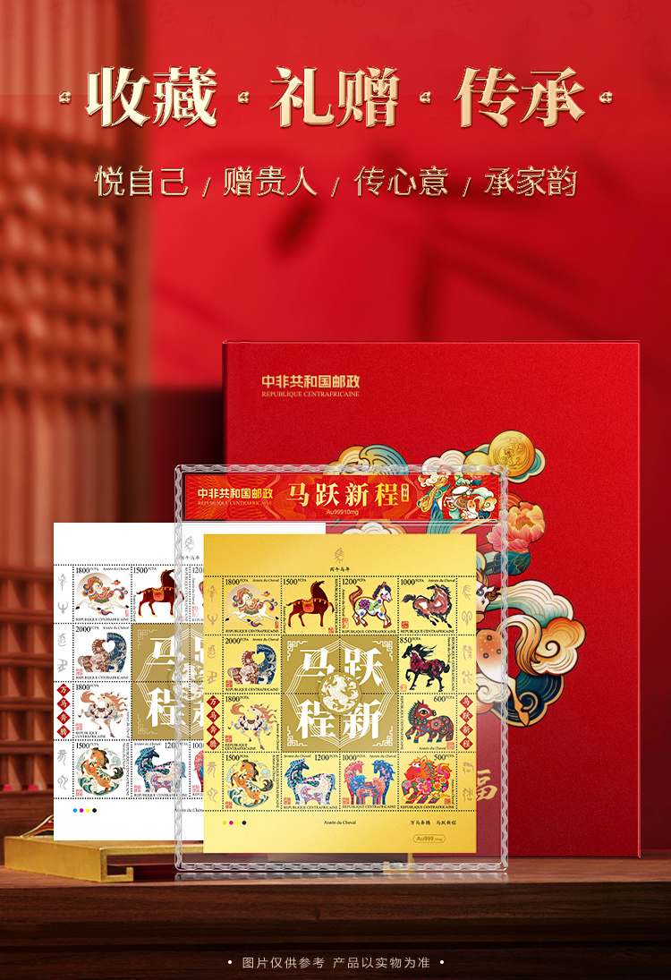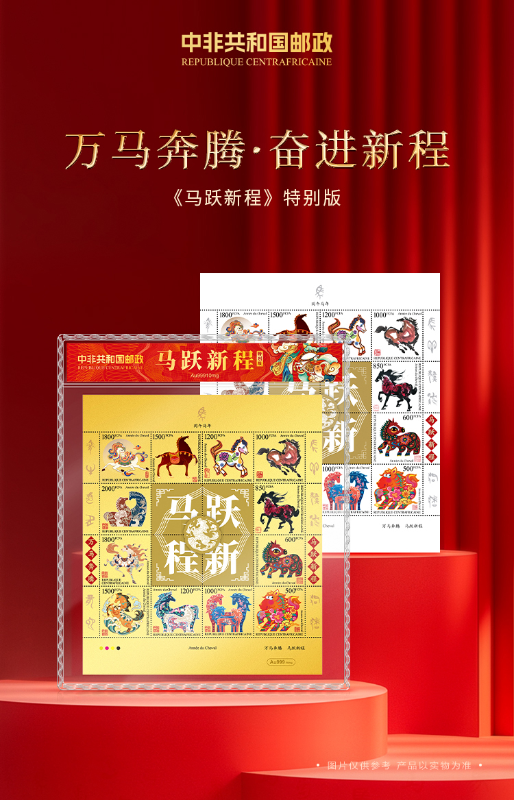 【马跃新程】999金邮票,中非共和国邮政官方发行,由八大邮票设计名家联袂打造,