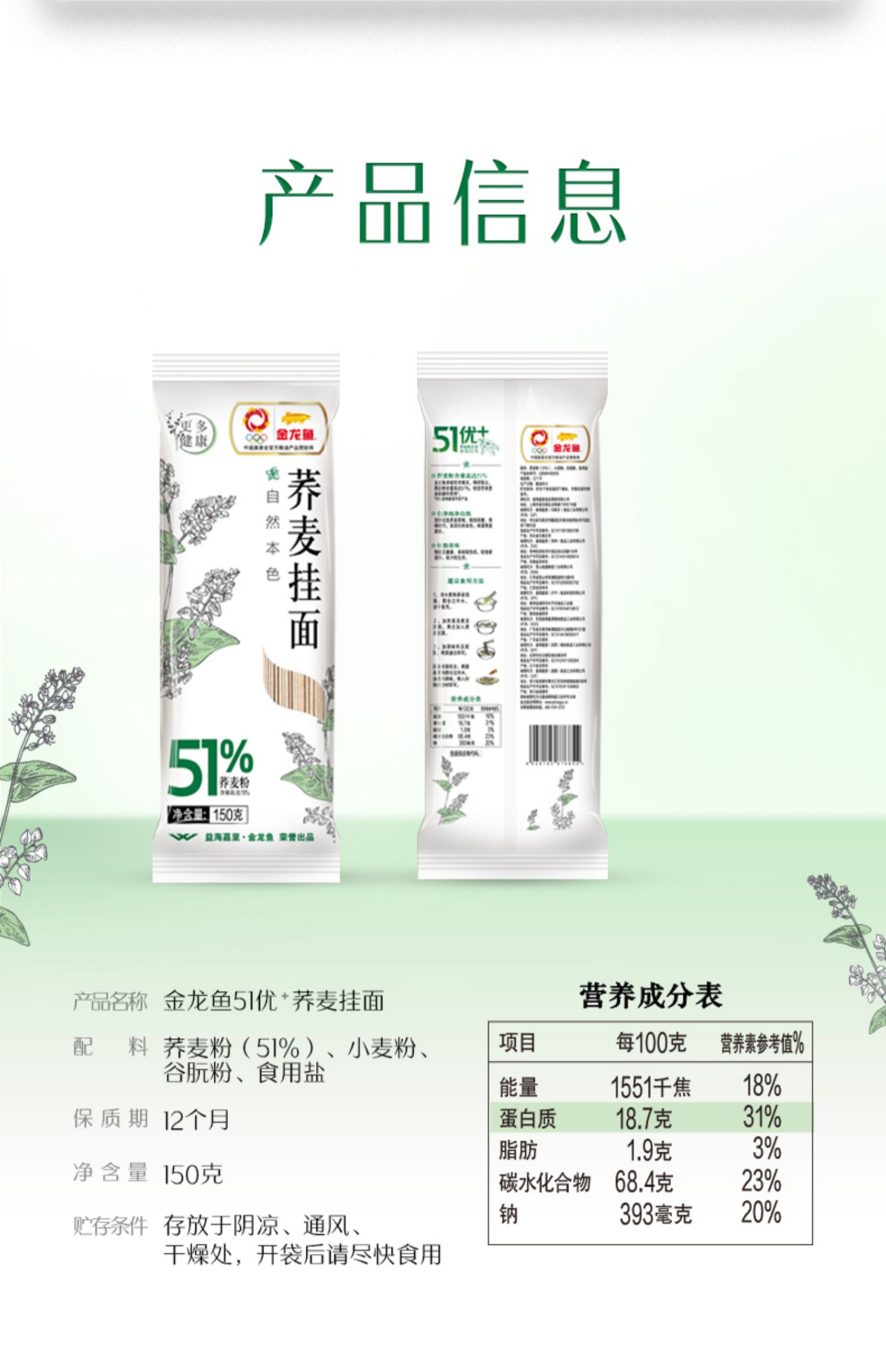 金龙鱼51优+荞麦挂面150G*6包