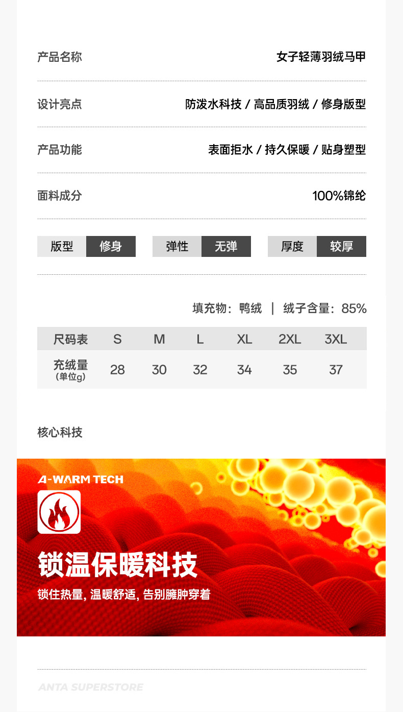 超级安踏轻薄羽绒马甲女士秋冬修身防泼水保暖运动外套162546902U